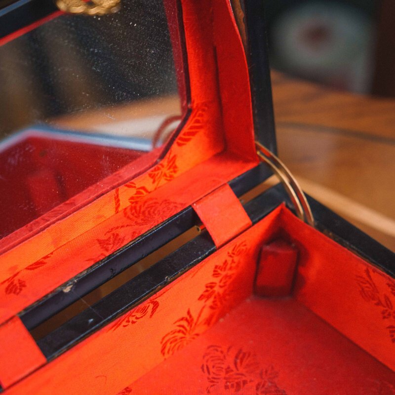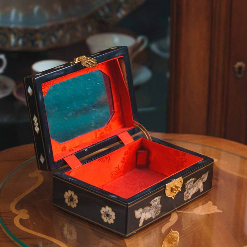 Внутренняя часть шкатулки поражает выразительным контрастом: яркая красно-алая бархатная отделка придаёт предмету роскошь и делает его идеальным для хранения украшений, памятных вещей, коллекционных предметов или небольших аксессуаров. Крышка также украшена зеркалом, что делает использование более удобным и практичным.
