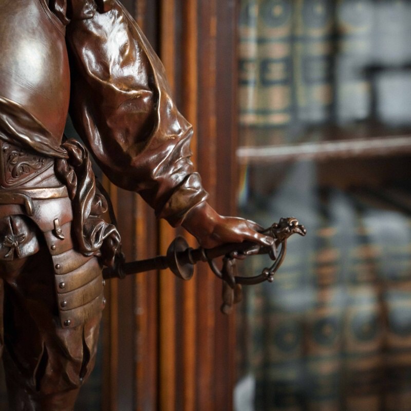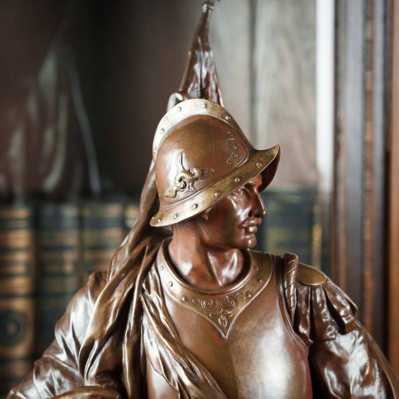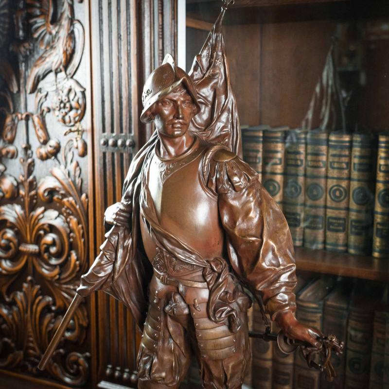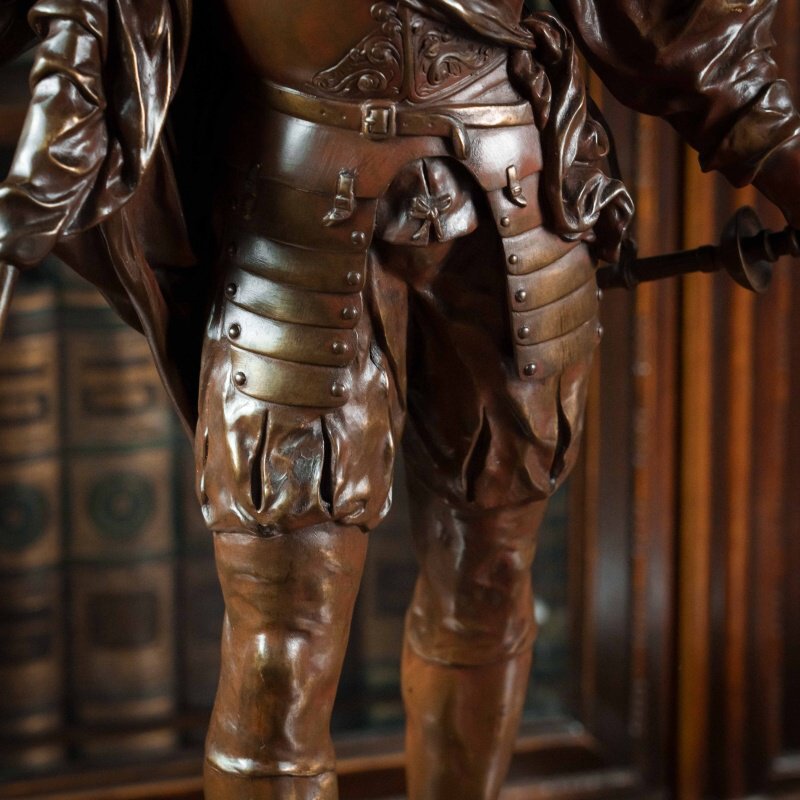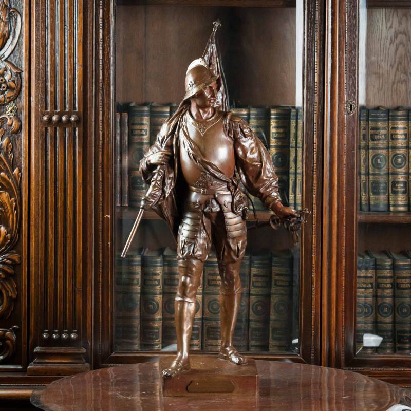 Эффектная монументальная скульптура «Знаменосец» представляет собой выдающийся пример историко-аллегорического искусства конца XIX века. Воин эпохи Возрождения, гордо держащий знамя, символизирующее доблесть, верность и честь. Его решительный взгляд, устремлённый в сторону, выражает готовность к действию и внутреннюю собранность. Фигура отличается высокой степенью детализации: тщательно проработаны черты лица, анатомия, доспехи и ткани, каждая складка плаща словно оживает в игре света на патинированной бронзе. Образ знаменосца олицетворяет идеалы героизма и служения родине — темы, к которым Эмиль Пико неоднократно обращался в своём творчестве. На основании имеется авторская факсимиле — E. Picault.