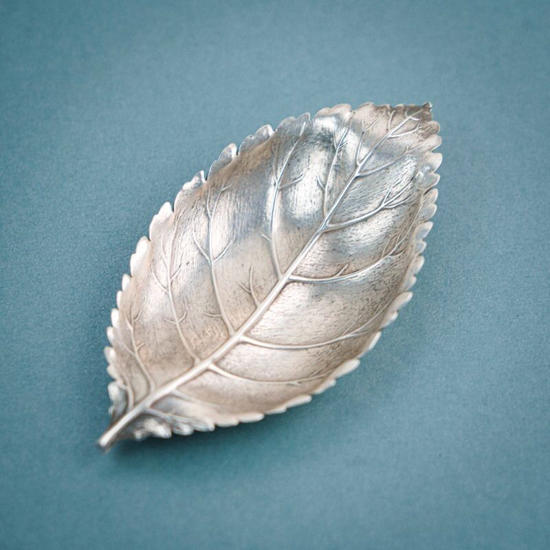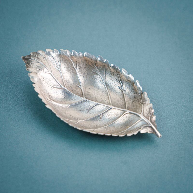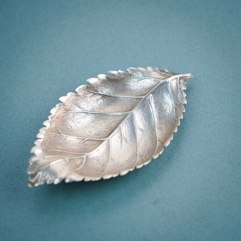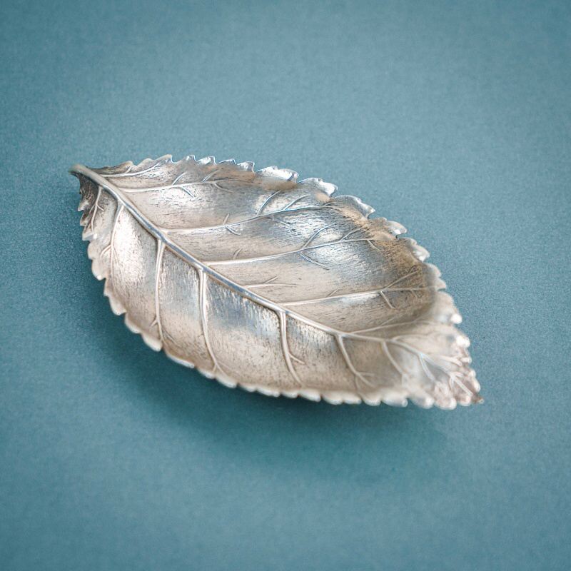 Небольшое декоративное блюдце выполнено в форме листа с тонко проработанными прожилками и мягко волнистыми краями, благодаря чему форма выглядит естественной и живой. Силуэт сохраняет природную пластику — лёгкую асимметрию и плавные изгибы, характерные для настоящего листа.