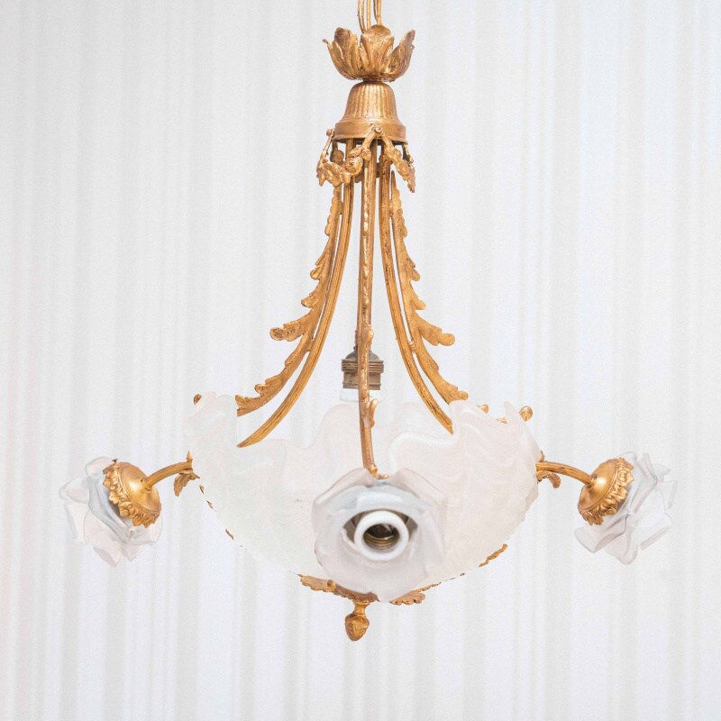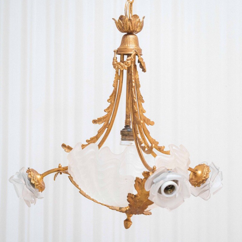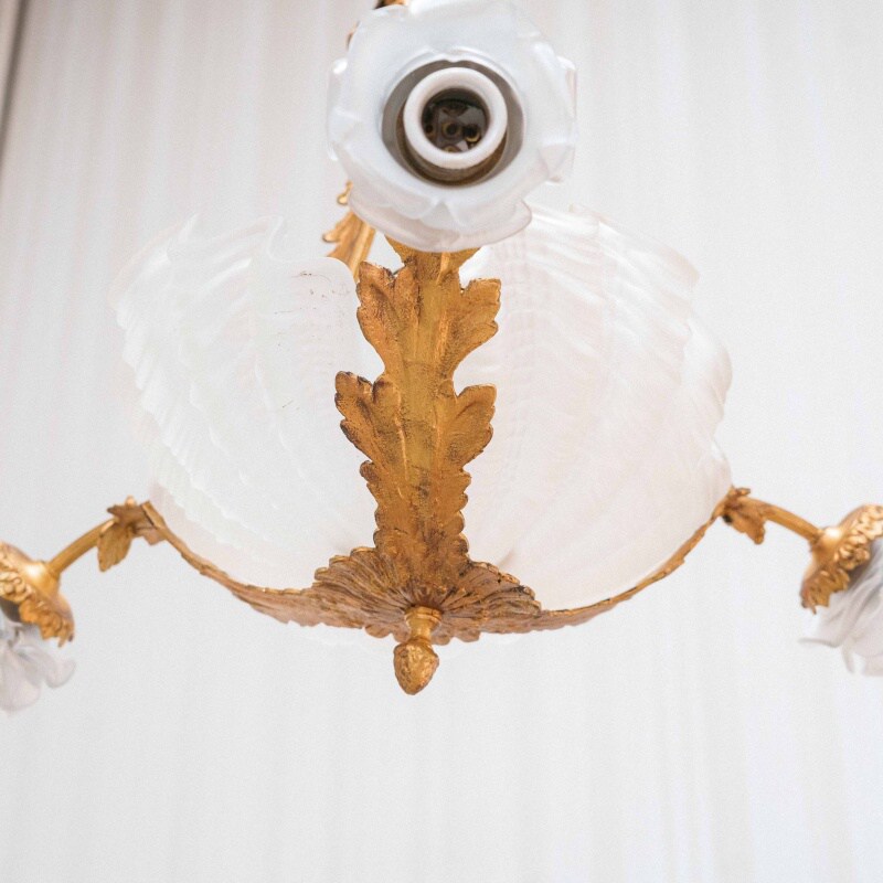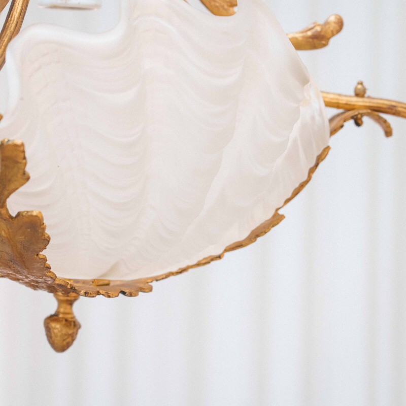 Элегантная потолочная люстра, выполненная в технике художественного бронзового литья с позолотой. Классический силуэт дополнен изящными растительными мотивами и декоративными элементами, характерными для европейских интерьеров конца XIX — начала XX века.