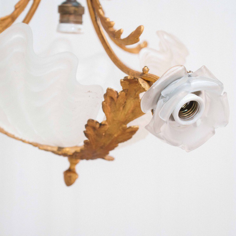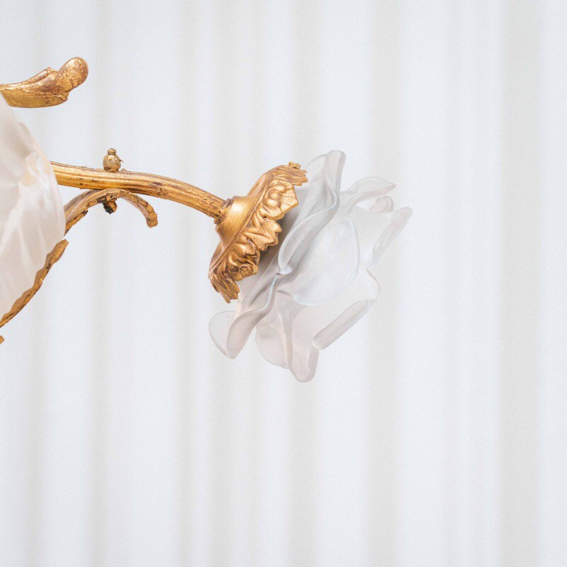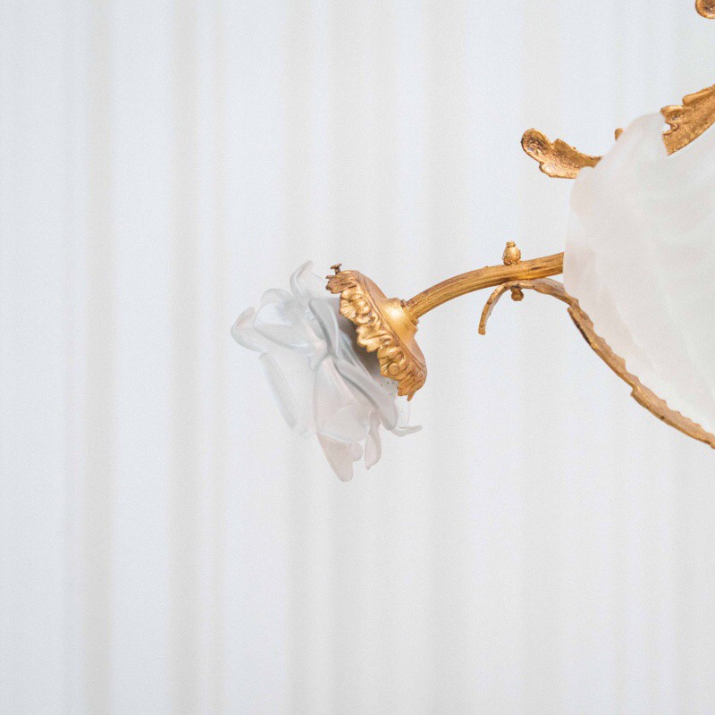 Четыре рожка украшены стеклянными плафонами в форме цветов, которые мягко рассеивают свет и создают тёплую, уютную атмосферу. Центральная чаша из матового стекла подчёркивает благородство конструкции и усиливает декоративный эффект.