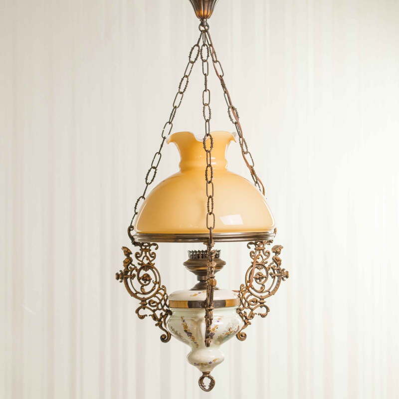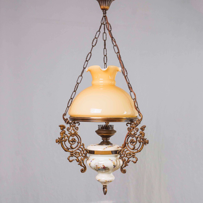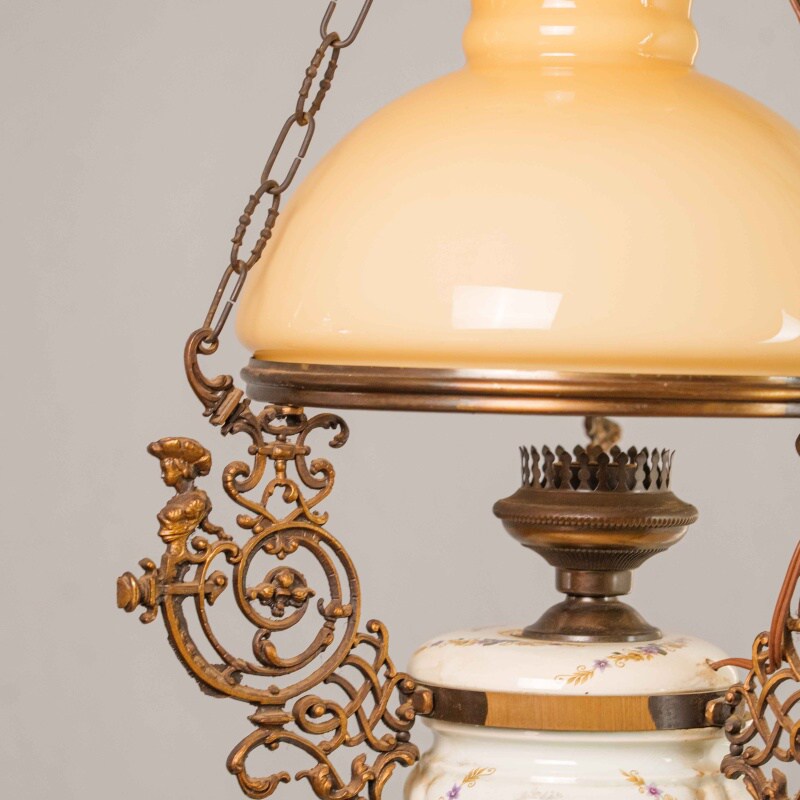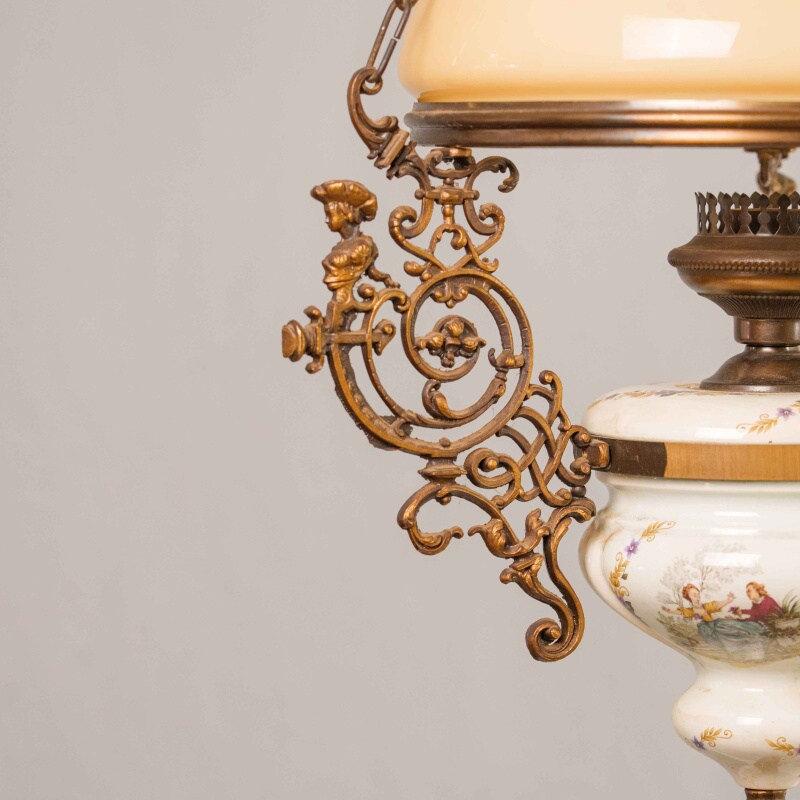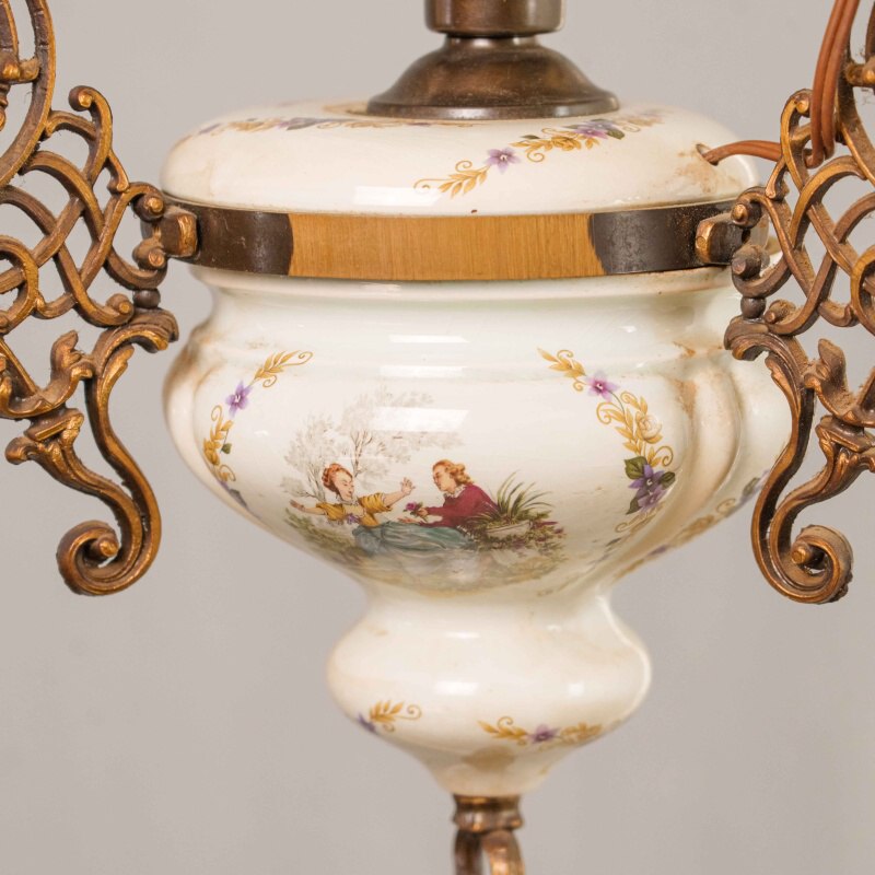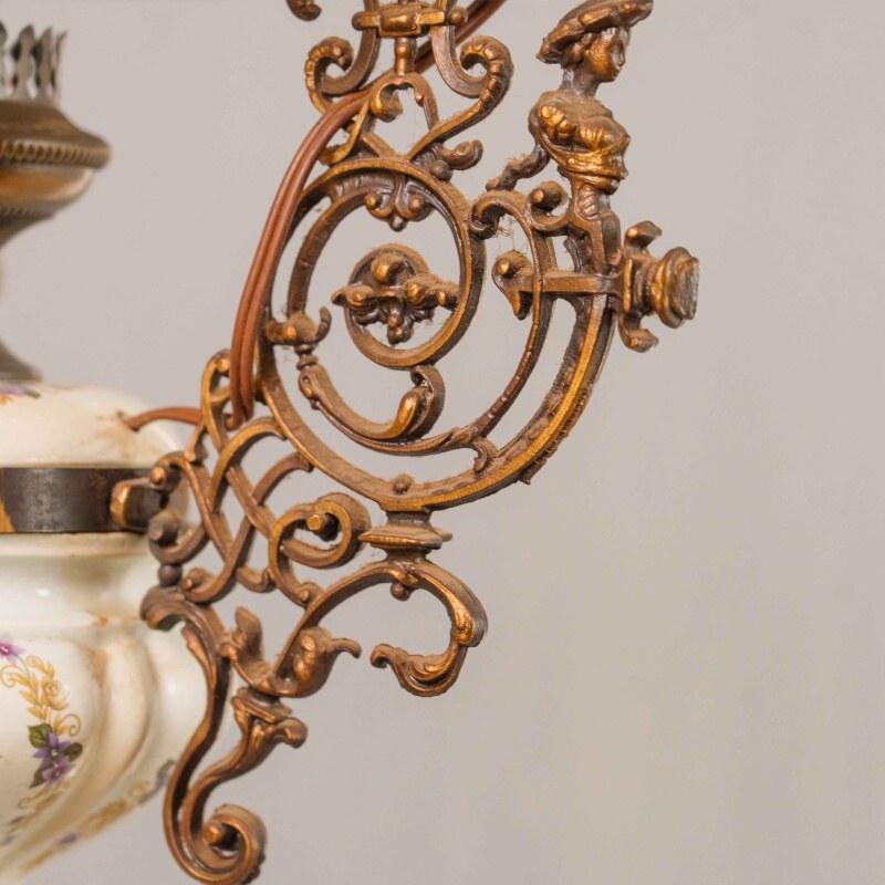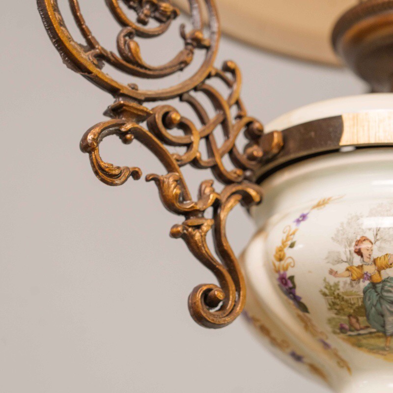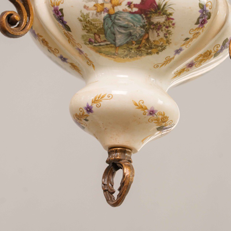 Эта элегантная подвесная люстра сочетает в себе утончённую красоту керамики и изящество бронзового декора. Центральная часть выполнена из керамики с ручной росписью нежных цветочных мотивов и жанровых сцен в саду, которые придают изделию особое очарование. Бронзовые кронштейны украшены изысканным растительным орнаментом и поддерживают керамический резервуар.