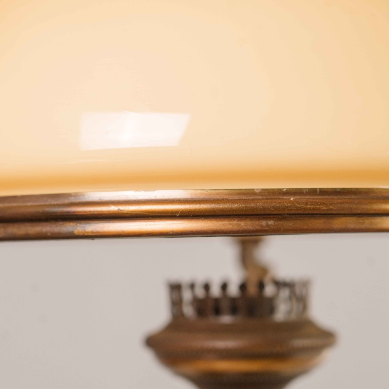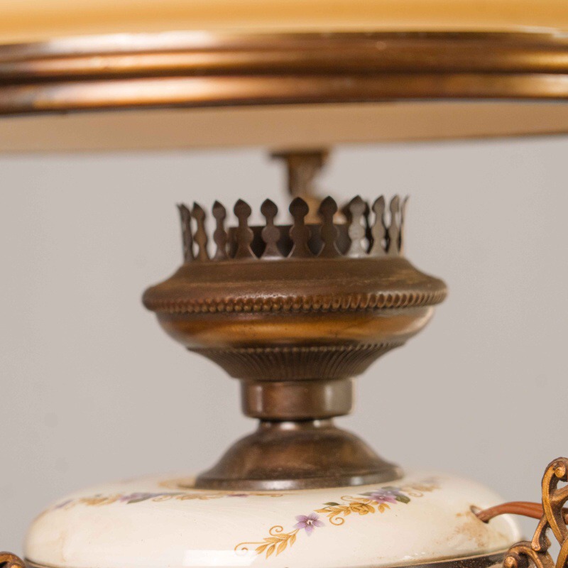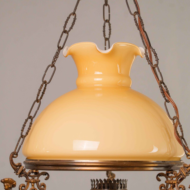 Верхнюю часть люстры венчает мягко изогнутый абажур из матового стекла тёплого янтарного оттенка, создающий уютное и мягкое свечение. Благодаря одному рожку и гармоничным пропорциям, люстра прекрасно подойдёт для оформления небольших гостиных, столовых или интерьеров в стиле прованс, классика или кантри.