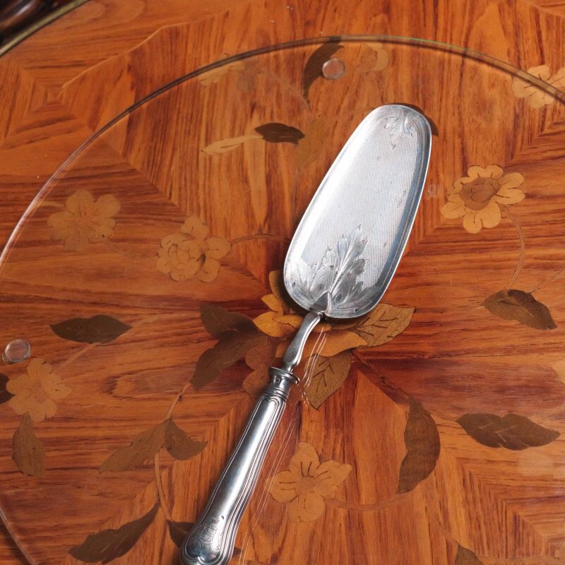 Элегантная сервировочная лопатка для торта, выполненная из серебра 950 пробы — высшего стандарта французского ювелирного искусства. Изделие отличает вытянутая форма с мягко закруглёнными краями и изысканная гравировка в стиле неоклассицизма, где тонкая штриховка и декоративные акантовые листья образуют гармоничный орнамент. Рабочая часть лопатки украшена сложным узором с гильошированным фоном и растительным мотивом, характерным для французских мастеров конца XIX – начала XX века. Ручка овальной формы с каннелюрами завершается утончённым навершием и гербовым гравированием — знаком принадлежности предмета к дворянскому или фамильному сервизу.