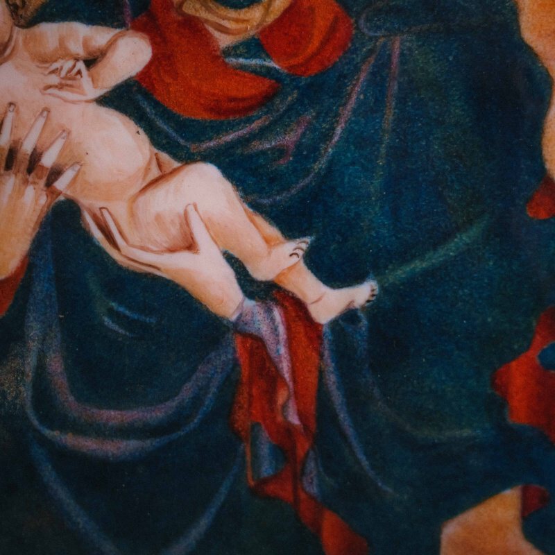 Цветовое решение — глубокие ультрамарины, насыщенные красные и золотистые тона — подчёркивает торжественность и витальность композиции. Светящийся фон создаёт ореол вокруг фигур, усиливая их сакральную выразительность.