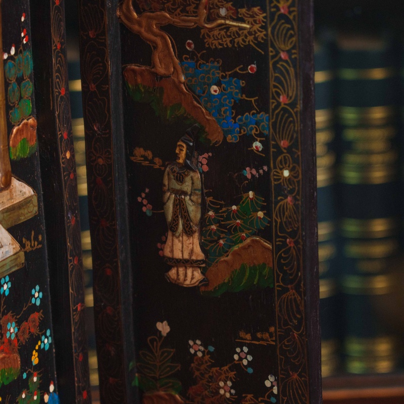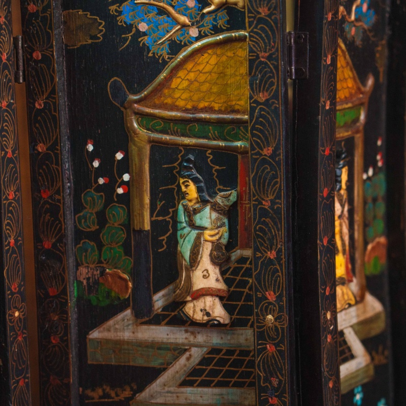Эта очаровательная антикварная мини-ширма представляет собой четырехстворчатую складную конструкцию, выполненную в восточном стиле и предназначенную для украшения интерьера.
