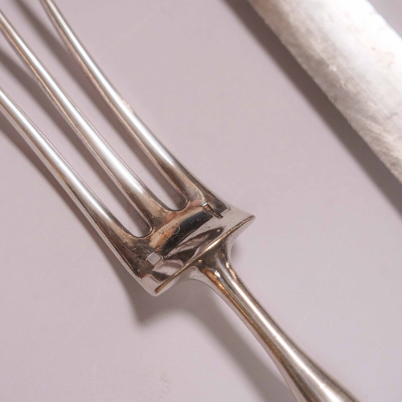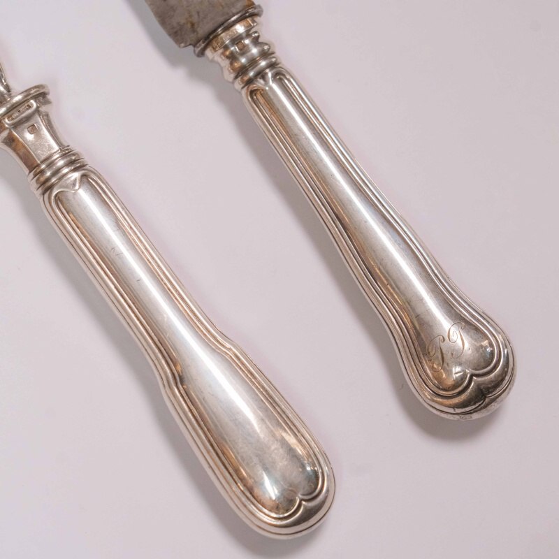Предметы отличаются строгой, вытянутой формой и сдержанной пластикой. Лаконичный декор подчёркивает функциональность предметов, не перегружая их визуально. Лезвие ножа выполнено из стали и имеет характерную вытянутую форму, предназначенную для аккуратной разделки мяса, в то время как вилка с длинными зубцами обеспечивает удобство фиксации продукта. Сочетание металла и посеребрённых рукоятей создаёт выразительный контраст фактур. На каждом предмете имеются клейма французской мануфактуры Christofle. Подобные наборы являлись важной частью сервировки и использовались как в повседневной, так и в парадной трапезе, отражая культуру европейского застолья.