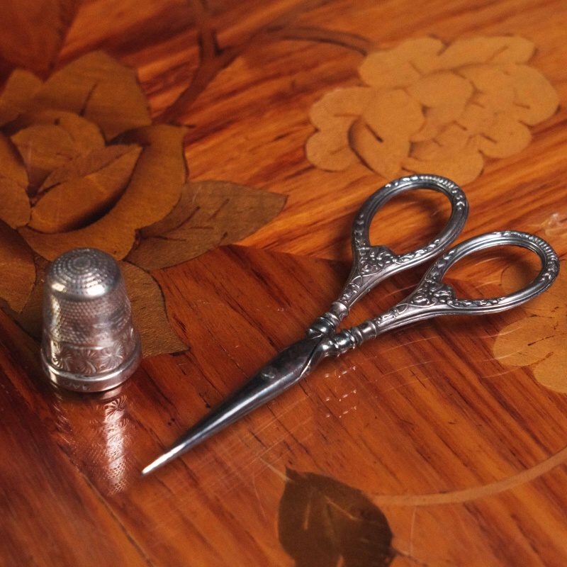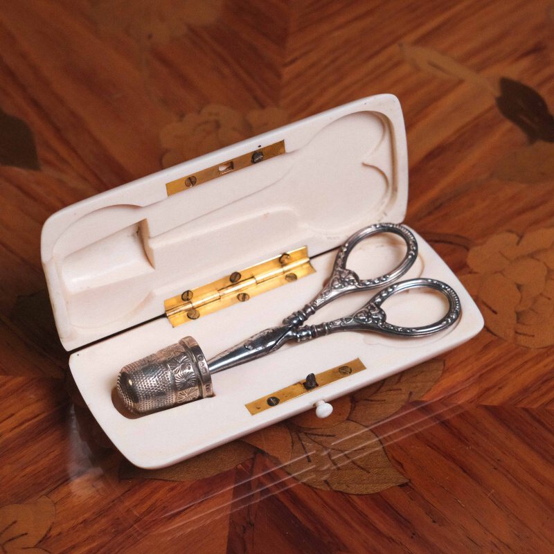 Изящный антикварный набор для рукоделия, включающий серебряные ножницы и напёрсток, помещён в футляр из натуральной массивной слоновой кости. Этот редкий комплект, созданный в конце XIX – начале XX века, является не только утилитарным, но и декоративным предметом, отражающим эстетику женского быта эпохи Belle Époque.