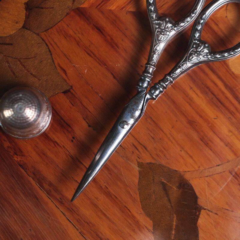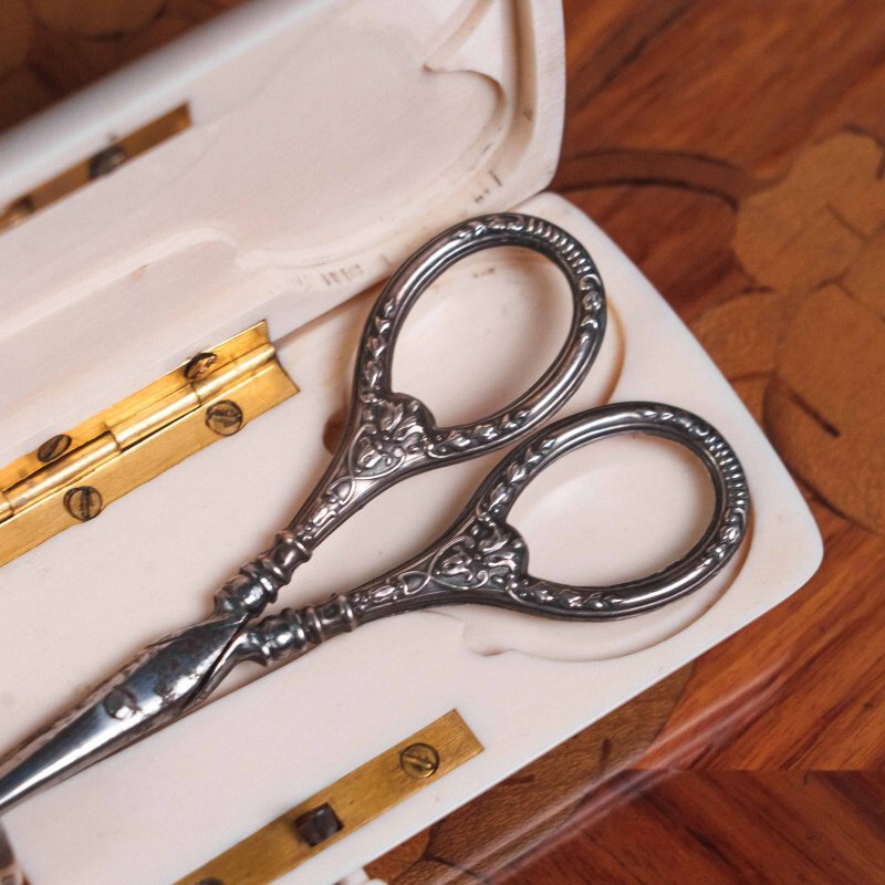 Рукояти ножниц выполнены из серебра и украшены изысканным растительным орнаментом, характерным для стиля Ар-Нуво, с плавными линиями и утончёнными деталями.