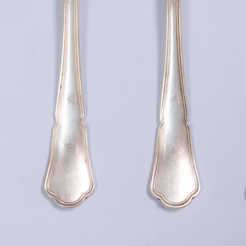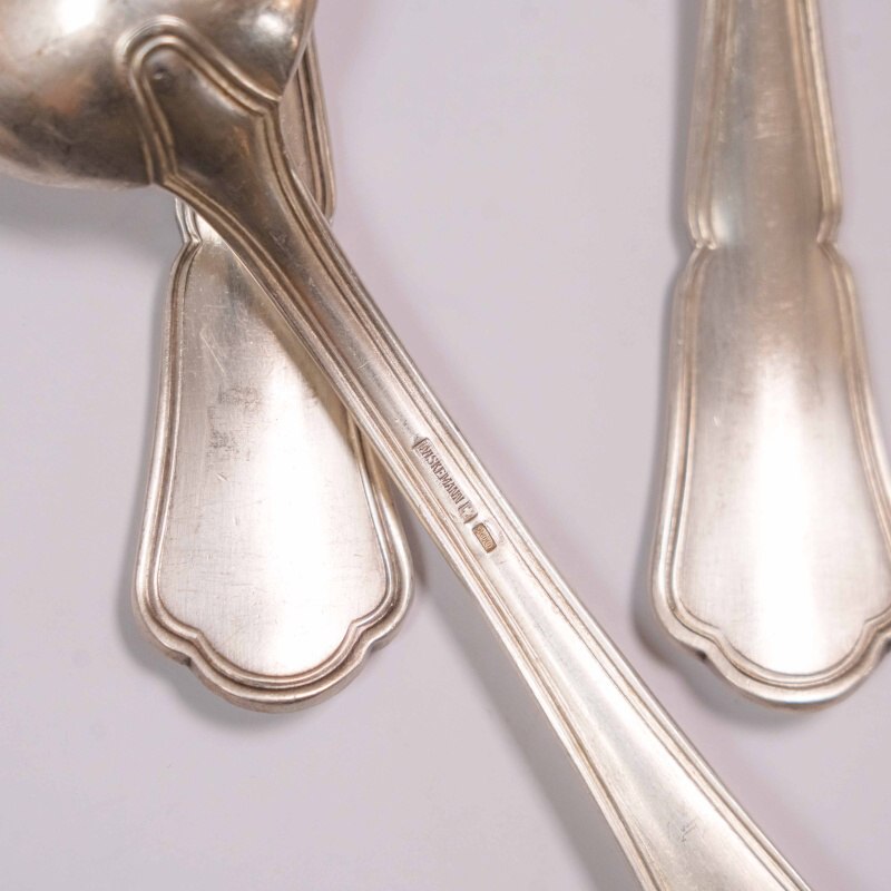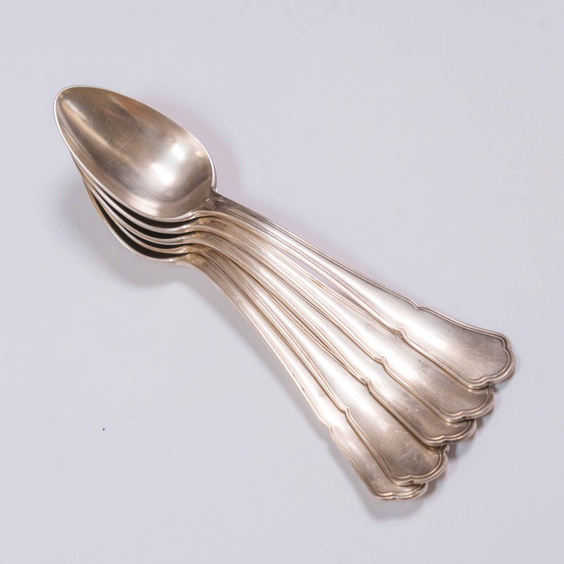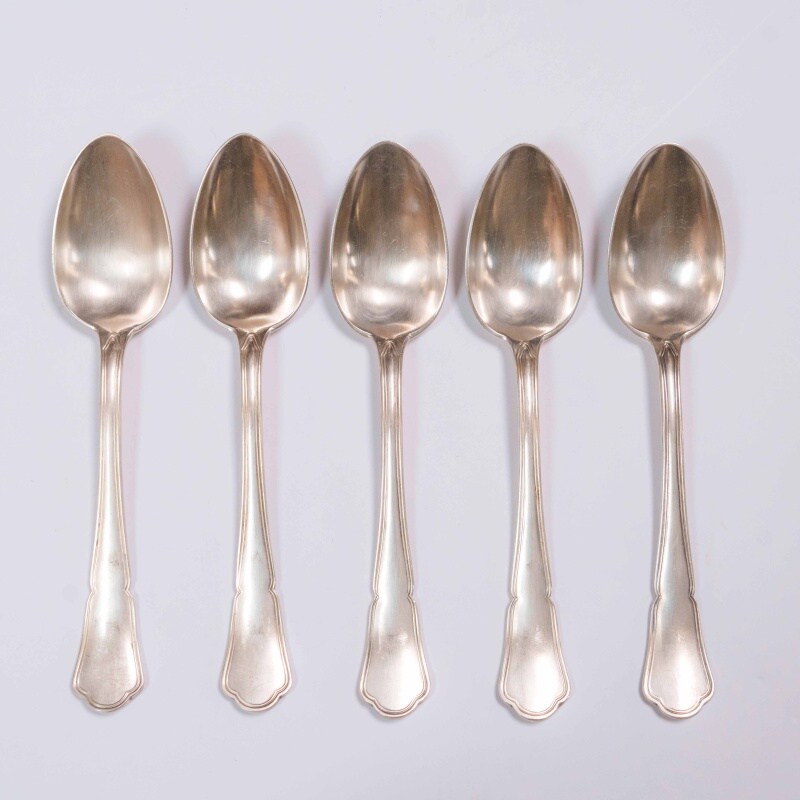 Набор из пяти столовых ложек бельгийской мануфактуры Wiskemann. Предметы выполнены в сдержанной классической манере с элементами историзма, отличаясь лаконичной формой и аккуратной пластикой. Ручки имеют вытянутый силуэт с мягко очерченным контуром и лёгким расширением к завершению. Декор минимален и выражен тонким профилированным кантом, что придаёт изделиям элегантность и универсальность. На предметах присутствуют чёткие производственные клейма: клеймо с надписью WISKEMANN — обозначение бельгийской мануфактуры; клеймо в виде прямоугольника с цифрой 100 — указывает на количество серебра, использованного при серебрении. Данные клейма характерны для продукции Wiskemann конца XIX – начала XX века и подтверждают подлинность изделий.