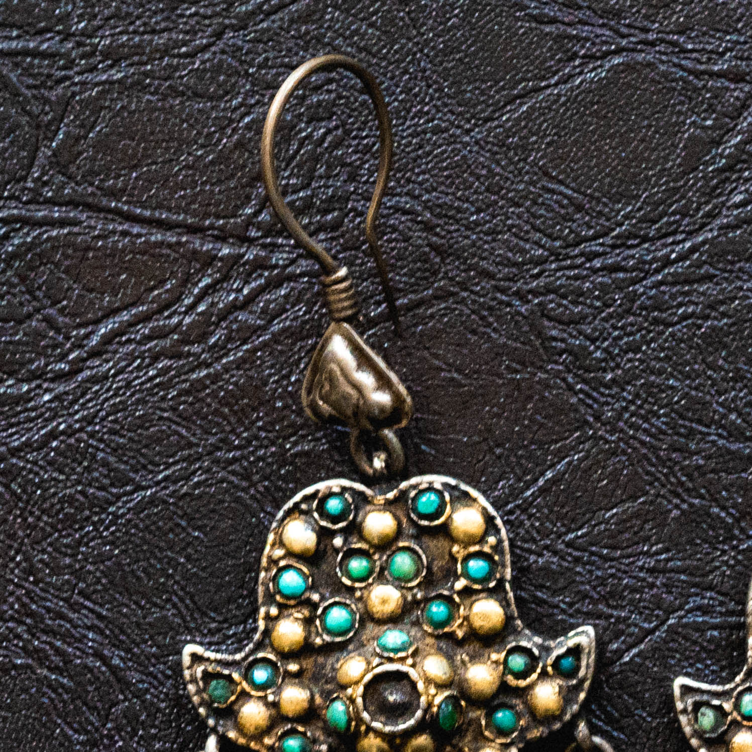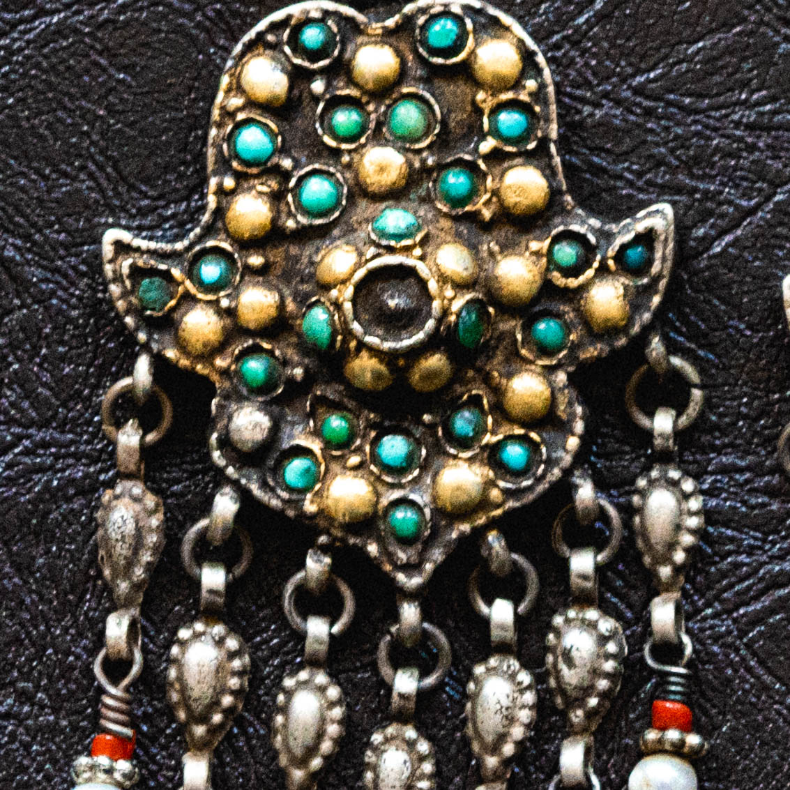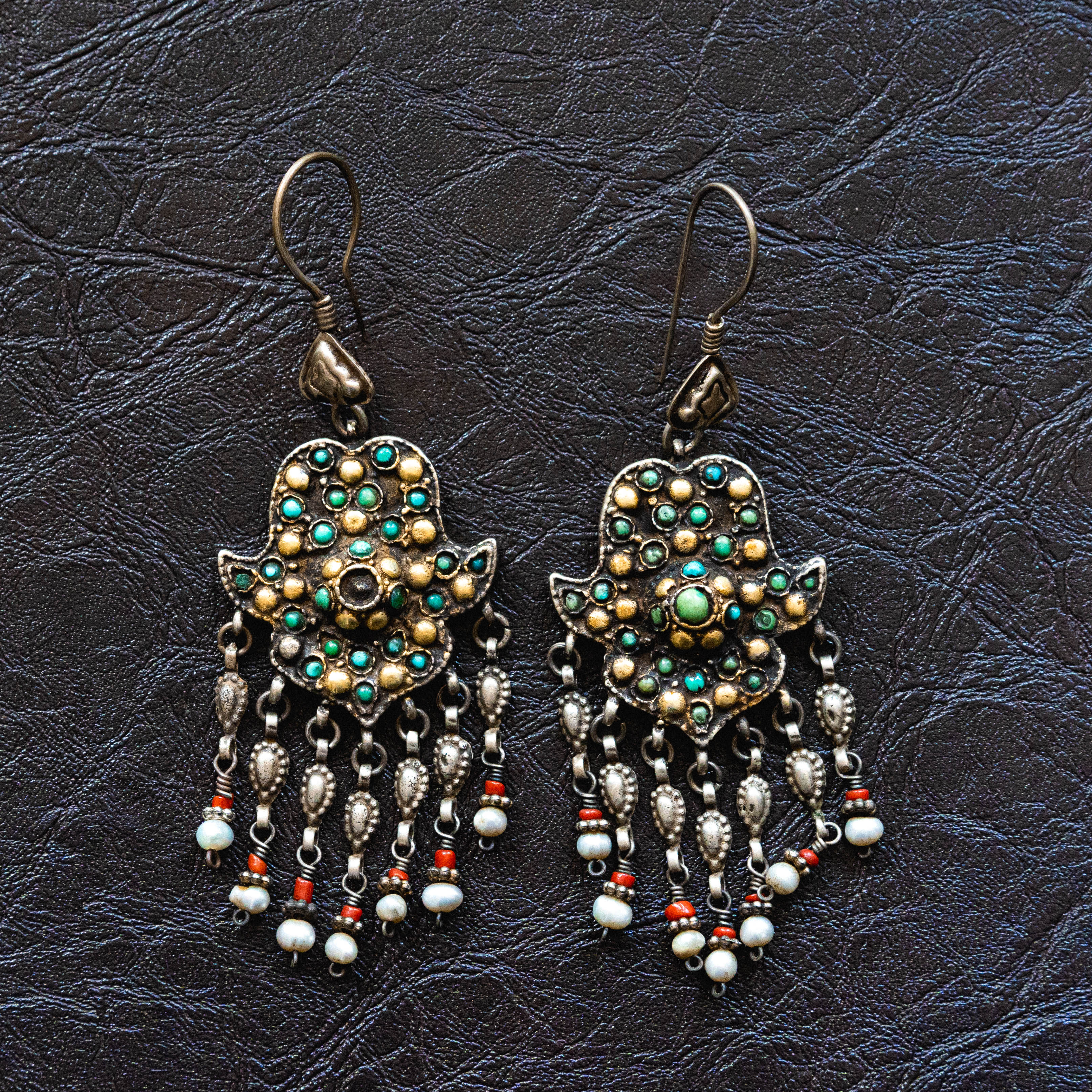 Традиционные этнические серьги, которые часто ассоциируются с украшениями Центральной Азии, в частности узбекскими или афганскими украшениями, также известными как кучи. Они выполнены в форме, напоминающей хамсу (рука Фатимы), мощный амулет от сглаза. Серьги имеют сложный дизайн с филигранью и инкрустацией небольшими бусинами бирюзы и коралла, а также белым жемчугом в качестве подвесок. Это украшение в этническом стиле, которое отражает традиции и культуру региона.