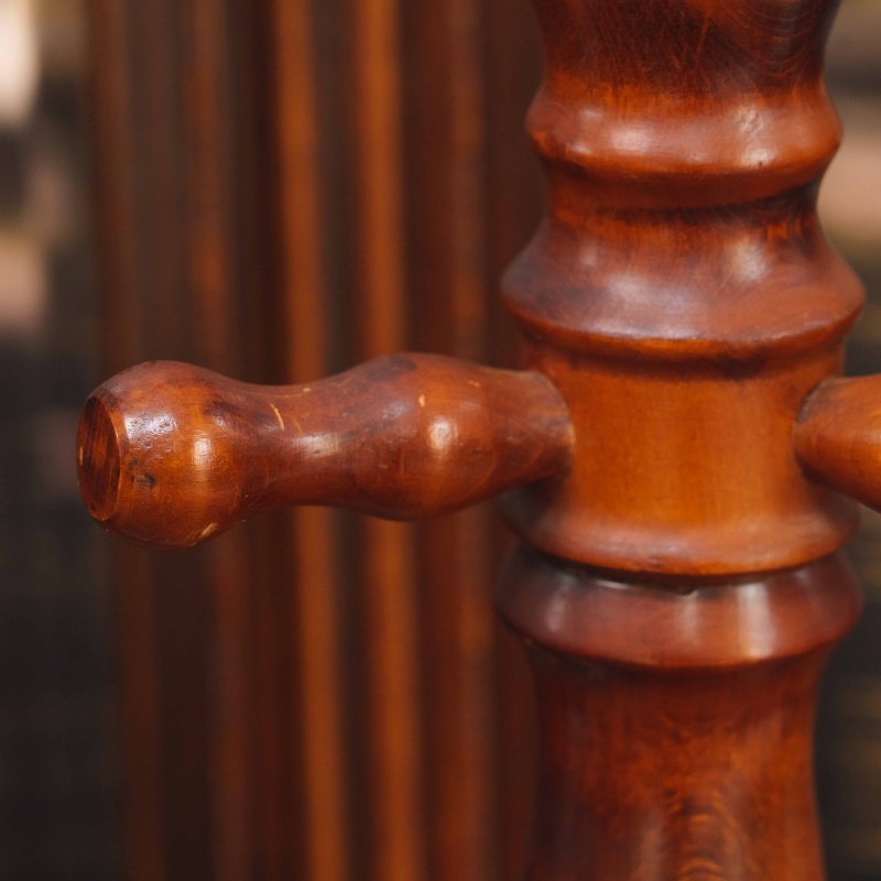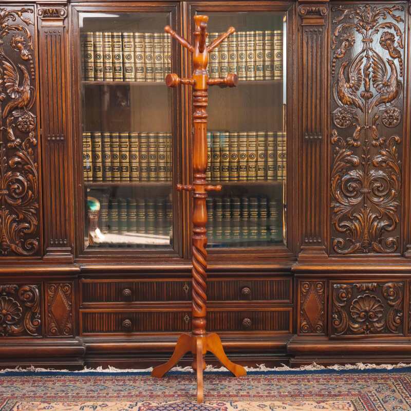 Классическая напольная вешалка. Массив дерева и тёплый оттенок древесины придают предмету благородный и солидный внешний вид. Точёные декоративные элементы и спиральная резьба на центральной части подчёркивают традиционный стиль и мастерство изготовления.