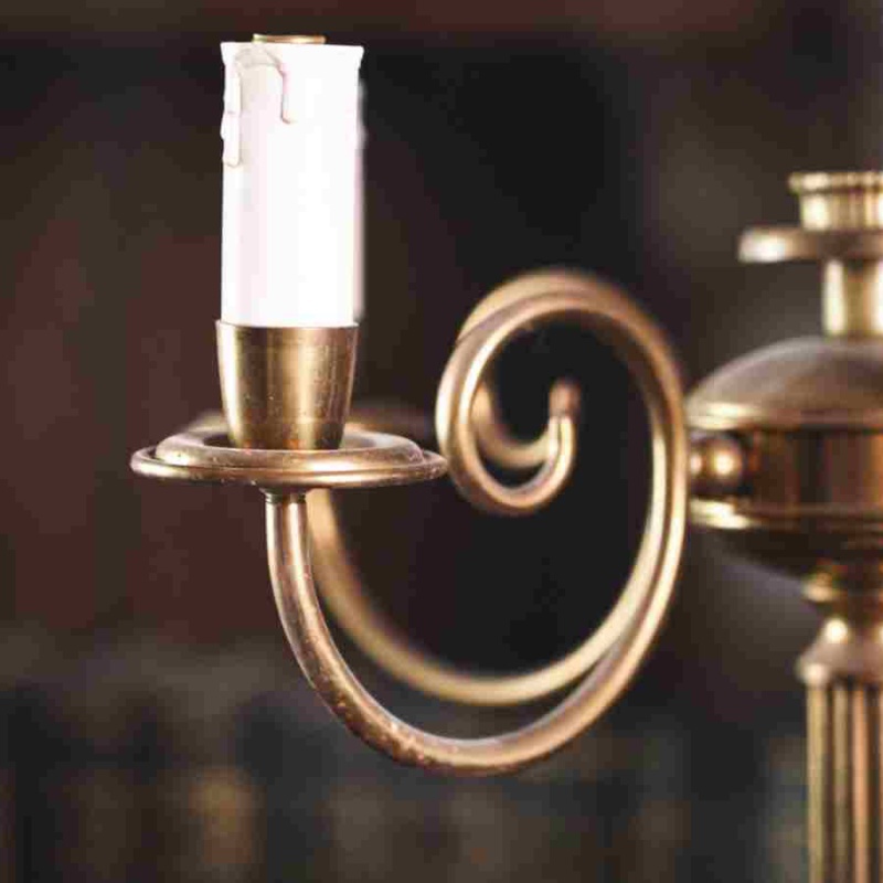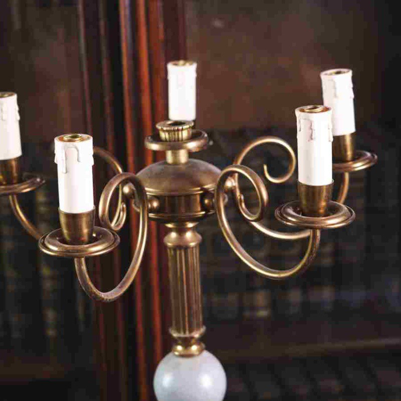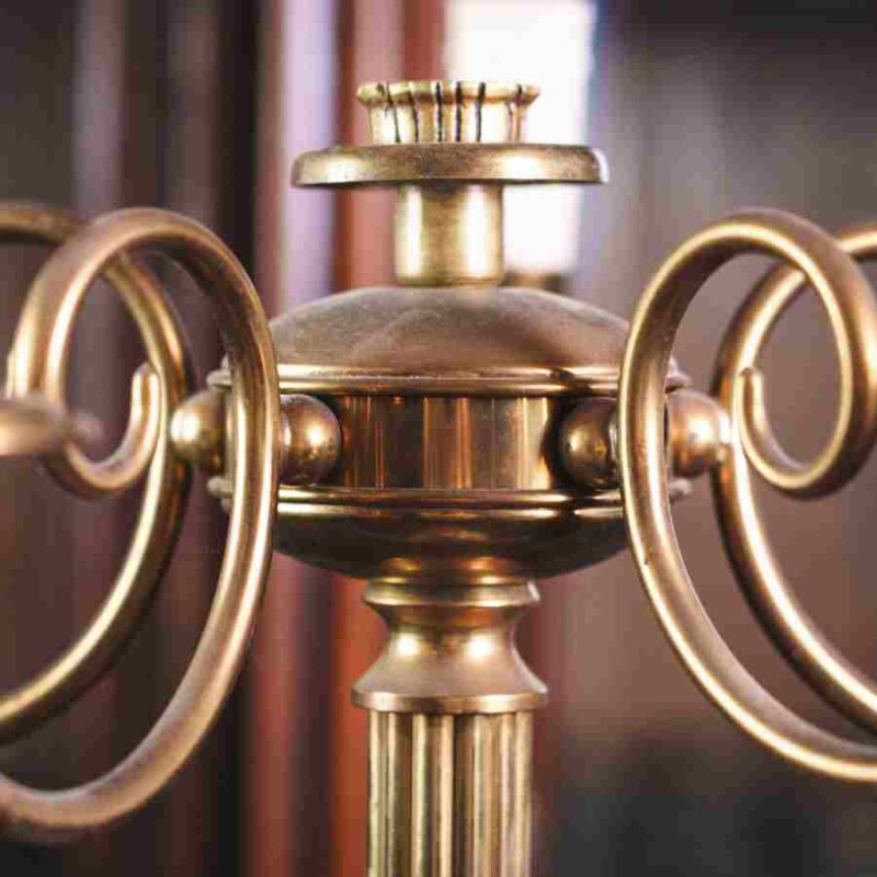 Верхняя часть оформлена в виде пяти рожков, каждый из которых украшен изогнутыми держателями в традициях классических канделябров. Тёплый золотистый оттенок латуни в сочетании с металлическим блеском придаёт торшеру благородный характер и делает его ярким акцентом интерьера.