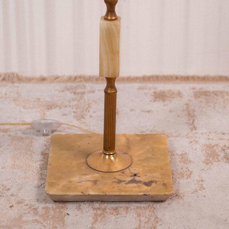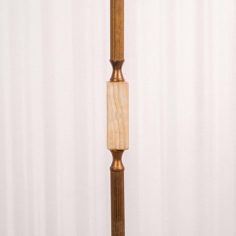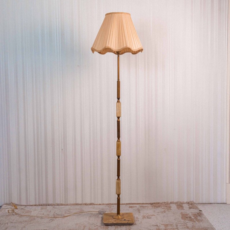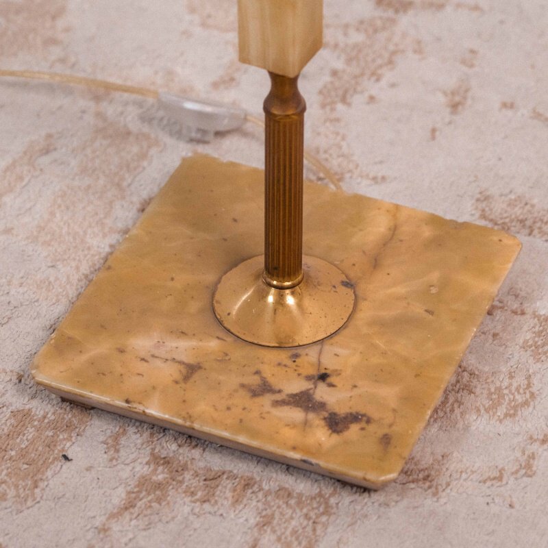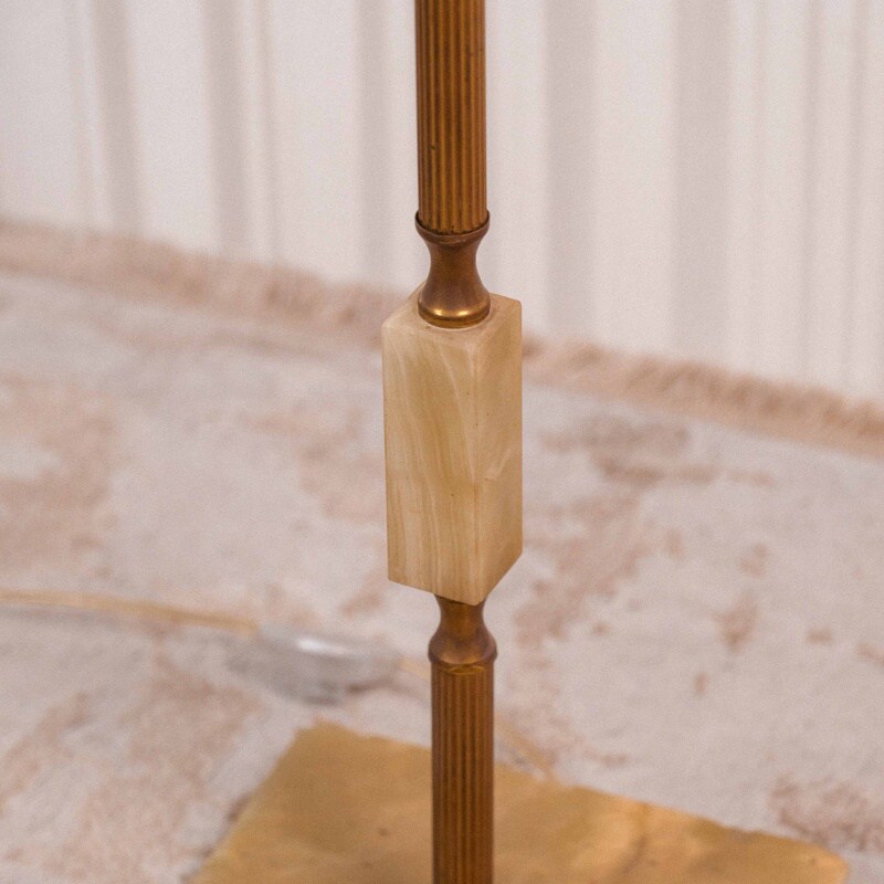 Элегантный напольный торшер, сочетающий благородство натурального оникса и тёплый блеск латуни. Вертикальная композиция основания выполнена из чередующихся латунных элементов и вставок из оникса, что придаёт модели изысканный и статусный характер.