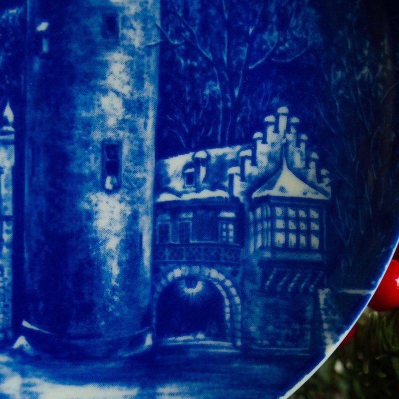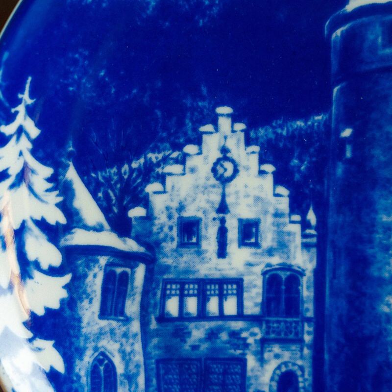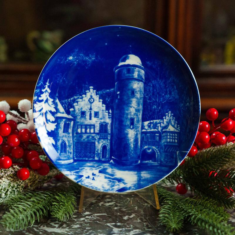 В центре композиции изображён замок Schloss Mayenbaum, выполненный в характерной для баварского фарфора кобальтово-синей монохромной гамме. Ночной пейзаж с башнями, стенами и отражениями в воде создаёт атмосферу тишины, уюта и романтики старинной Европы. Тонкая градация синего цвета подчёркивает глубину пространства и мастерство художника, а высокий уровень детализации говорит о ручной росписи и внимании к каждой линии.