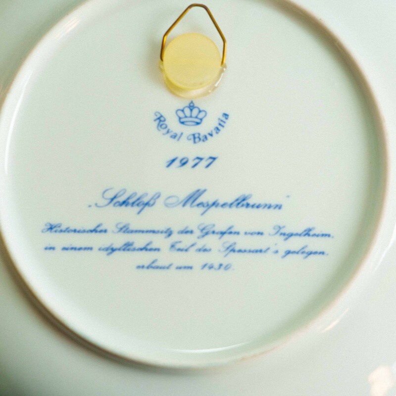 Обратная сторона тарелки содержит фирменное клеймо Royal Bavaria, датировку 1977 и оригинальное название сюжета, что подтверждает подлинность предмета и его принадлежность к ограниченному выпуску. Предусмотрено заводское крепление для настенного размещения, что изначально подчёркивает декоративный статус изделия.