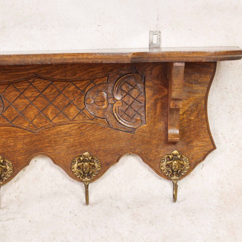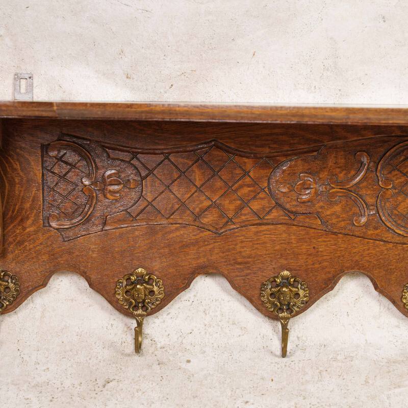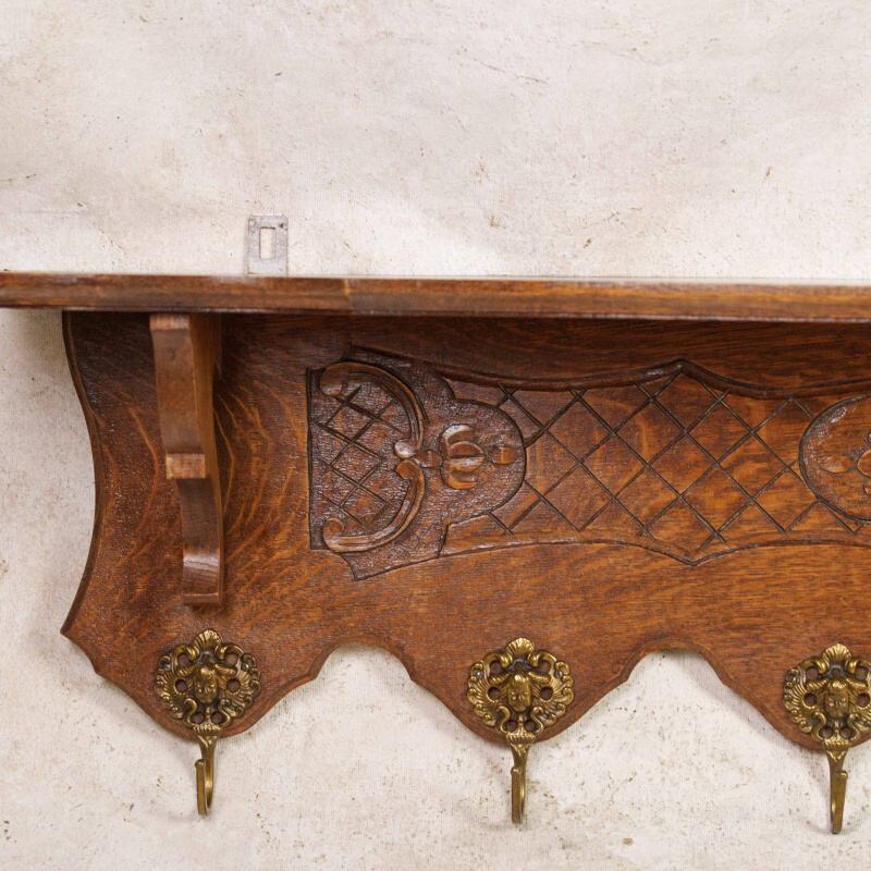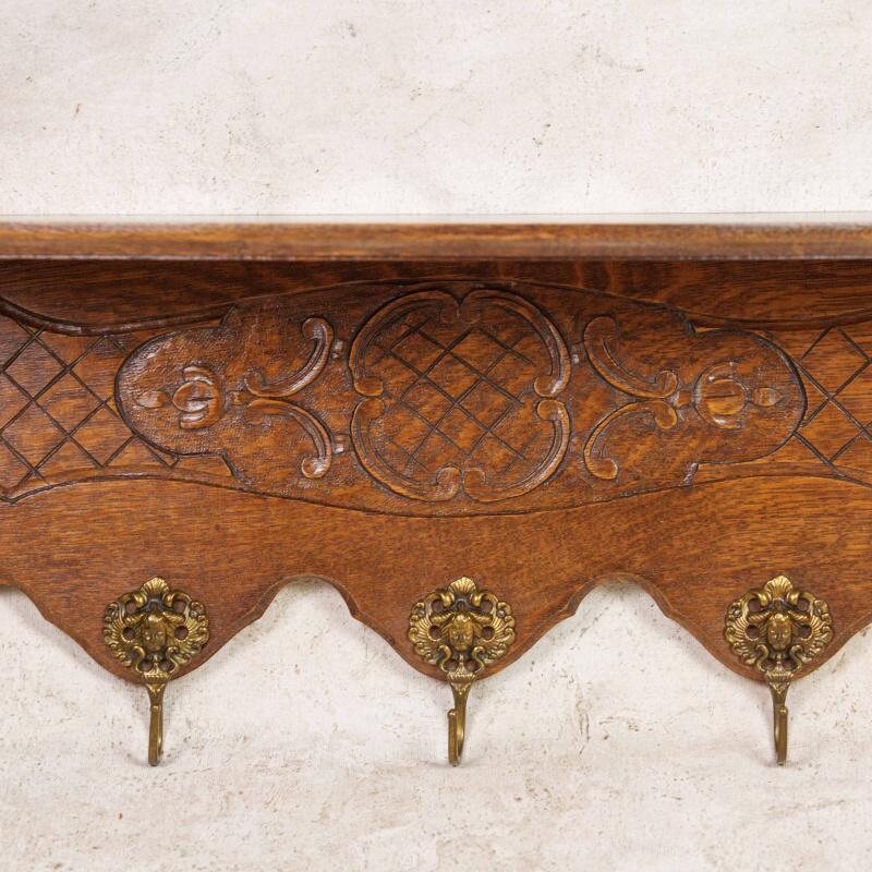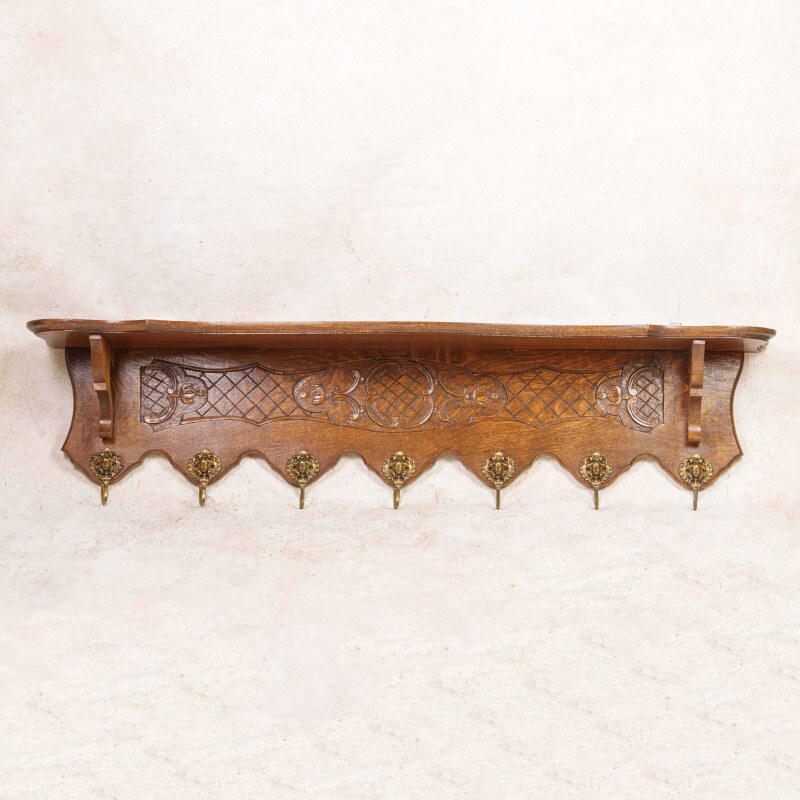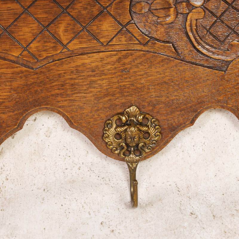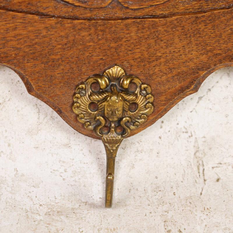 Материал Массив дуба, латунь. Резьба ручной работы, геометрический орнамент, латунные крючки. Состояние отличное, с лёгкой патиной времени.