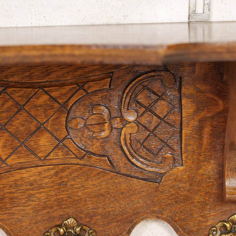 Антикварная настенная вешалка, выполненная из массива дуба, — изящный и функциональный предмет интерьера середины XX века. Фасад украшен ручной геометрической резьбой с элементами ромбов и плавных переплетений, создающих гармоничный орнамент в духе европейского неоклассического стиля.