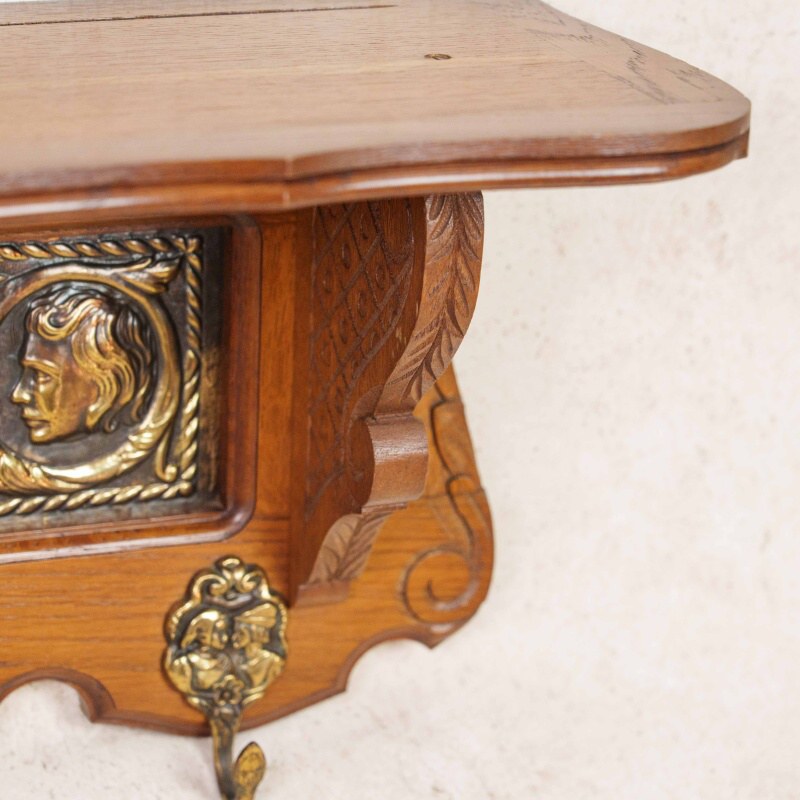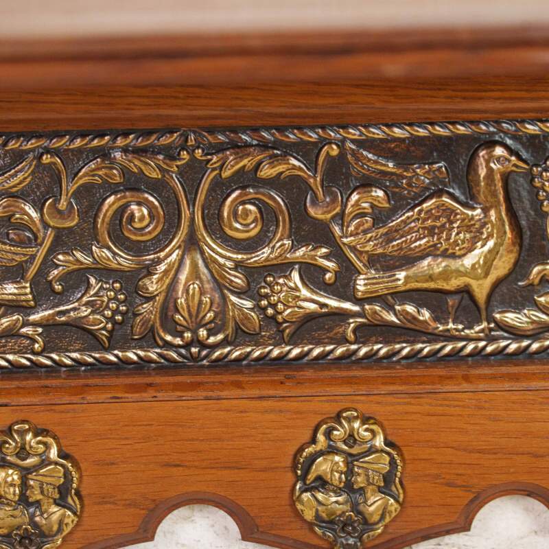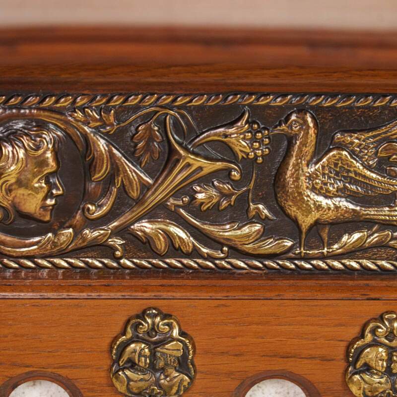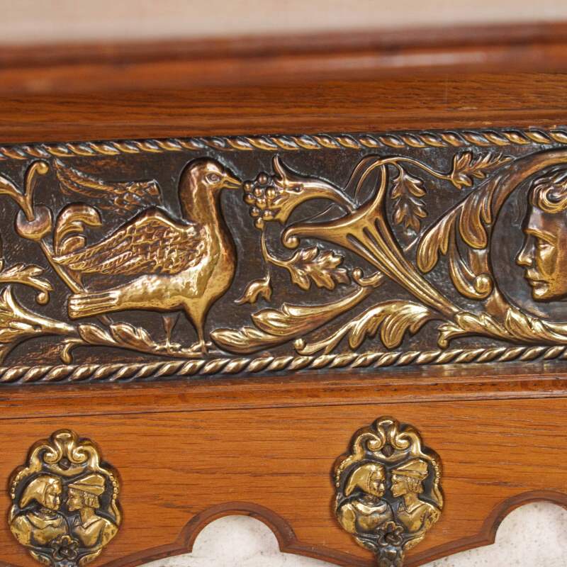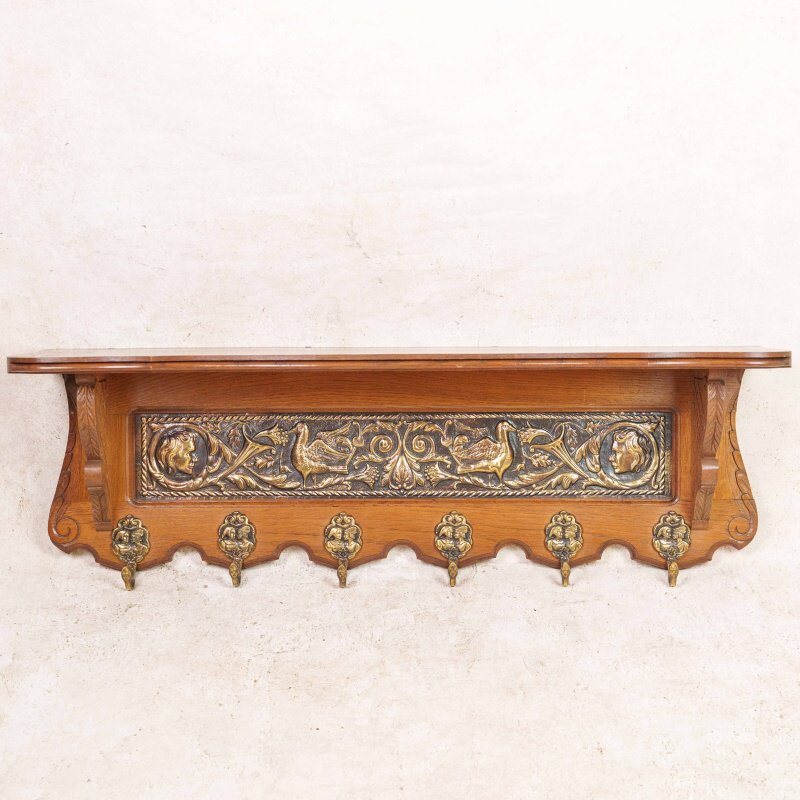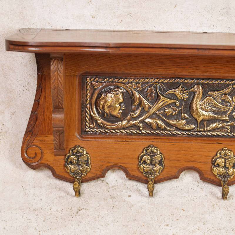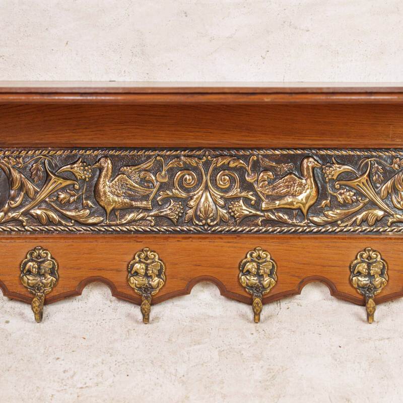Антикварная настенная вешалка, выполненная из массива дуба, украшена изысканным латунным барельефом, изображающим мифологических птиц и растительные орнаменты. Композиция в духе неоренессансного стиля поражает богатством деталей и пластичностью рельефа, создавая ощущение глубины и торжественности.
