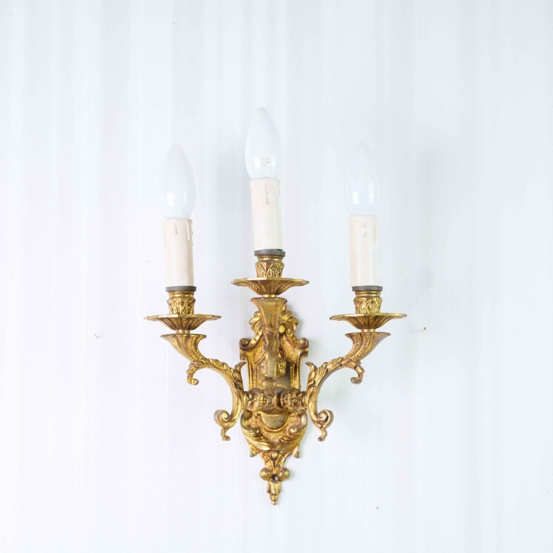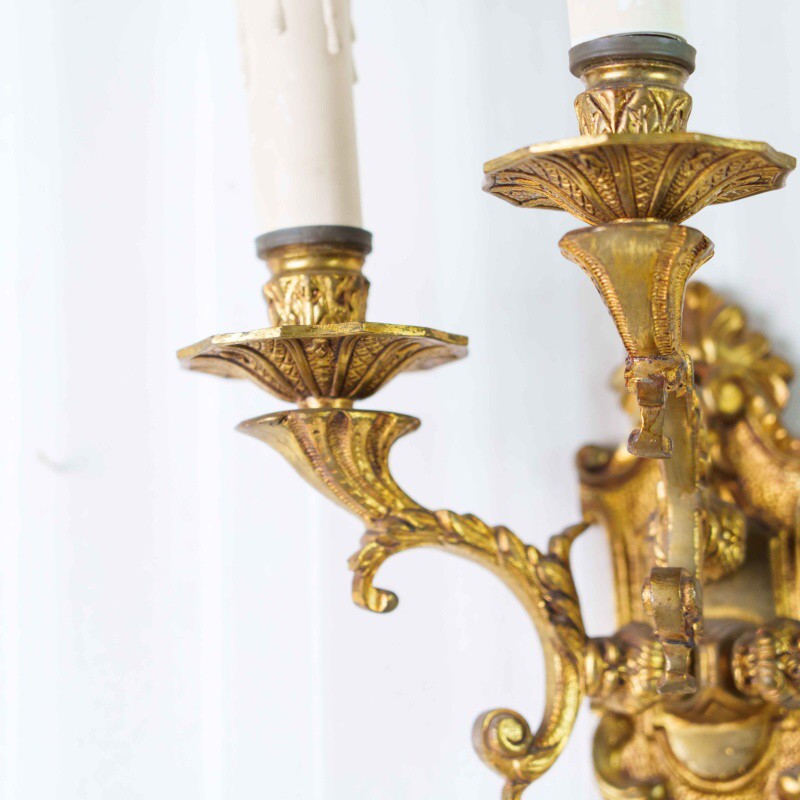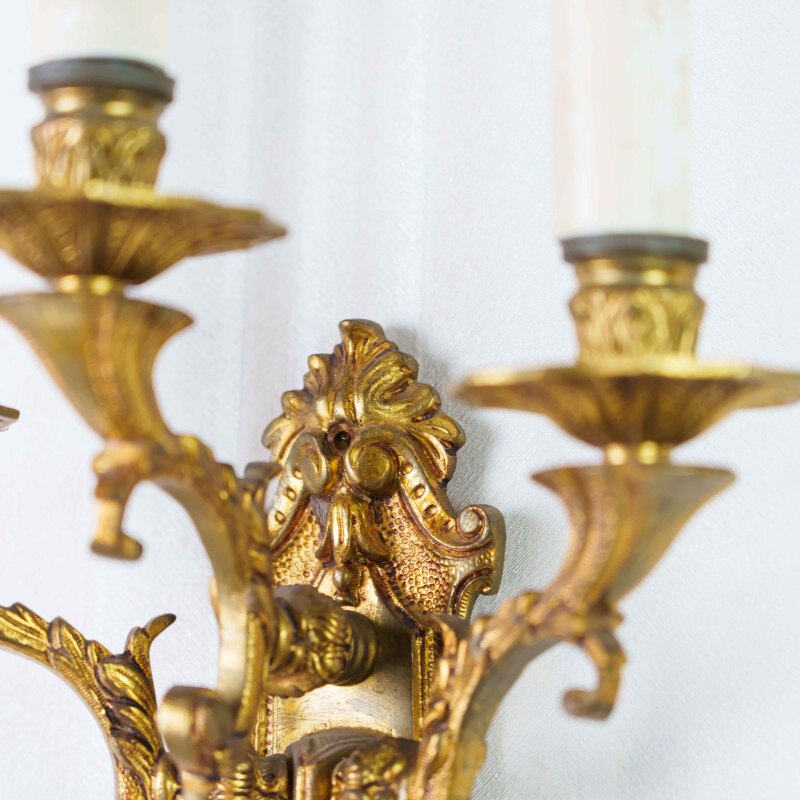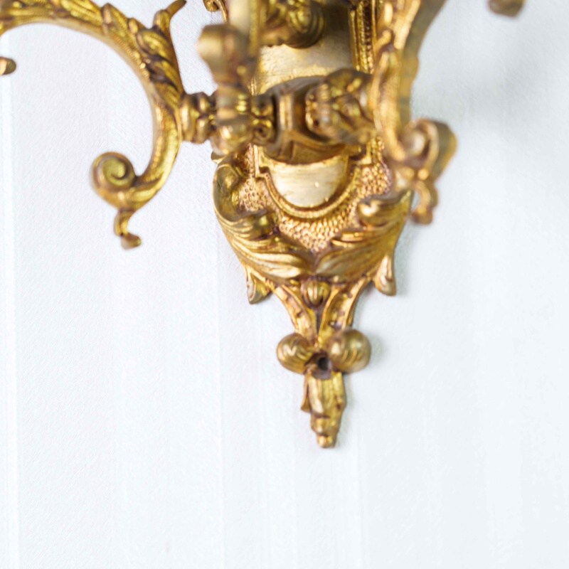 Изысканное настенное бра середины XX века, выполненное в стиле Людовика XVI, сочетает в себе гармонию симметрии, богатство декора и утончённую форму. Основание изготовлено из бронзы с позолотой, украшено рельефными орнаментами, гирляндами и стилизованными маскаронами — типичными элементами французской классики XVIII века.