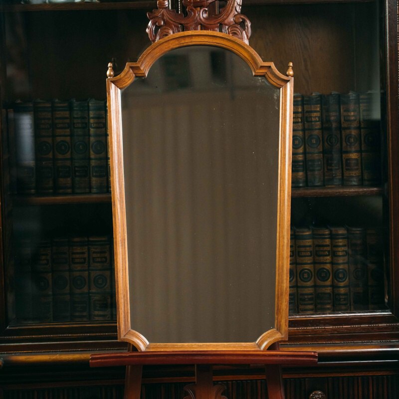 Зеркальное полотно имеет сложную фигурную форму: верхняя часть рамы выполнена в виде плавной арки, а нижняя часть имеет сглаженные углы.