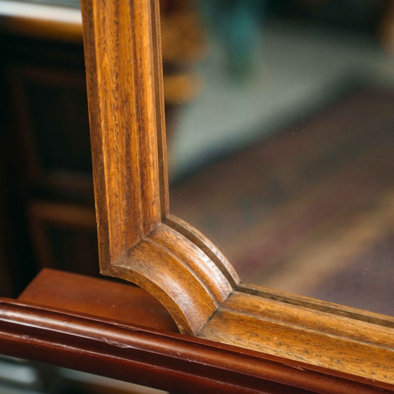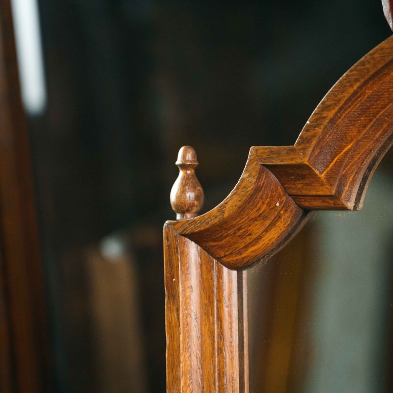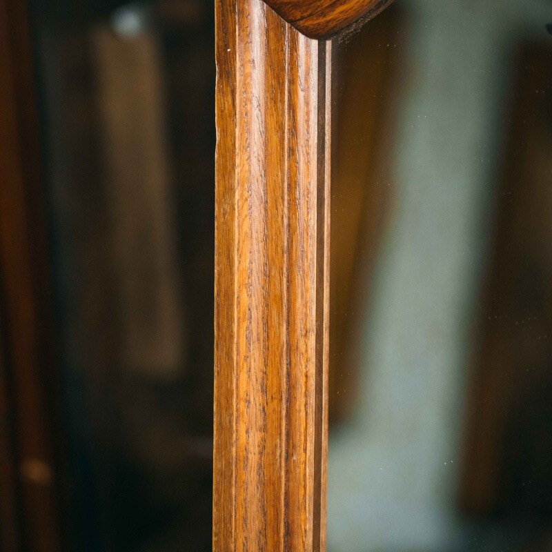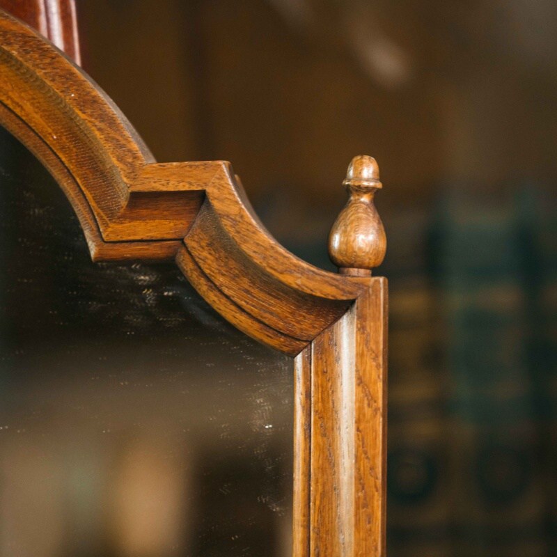 По бокам от арки расположены небольшие декоративные элементы, напоминающие навершия или капители, завершающиеся округлыми наконечниками. Рама зеркала изготовлена из светлого дерева, с выраженной текстурой. Рама имеет простой, но элегантный профиль без излишнего декора, что подчёркивает естественную красоту материала.