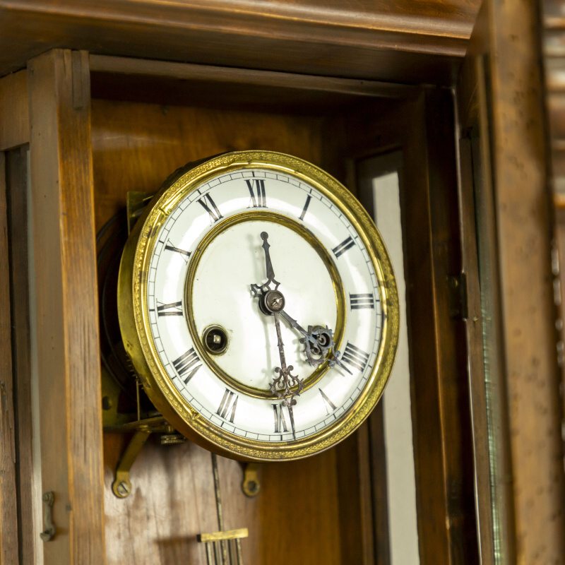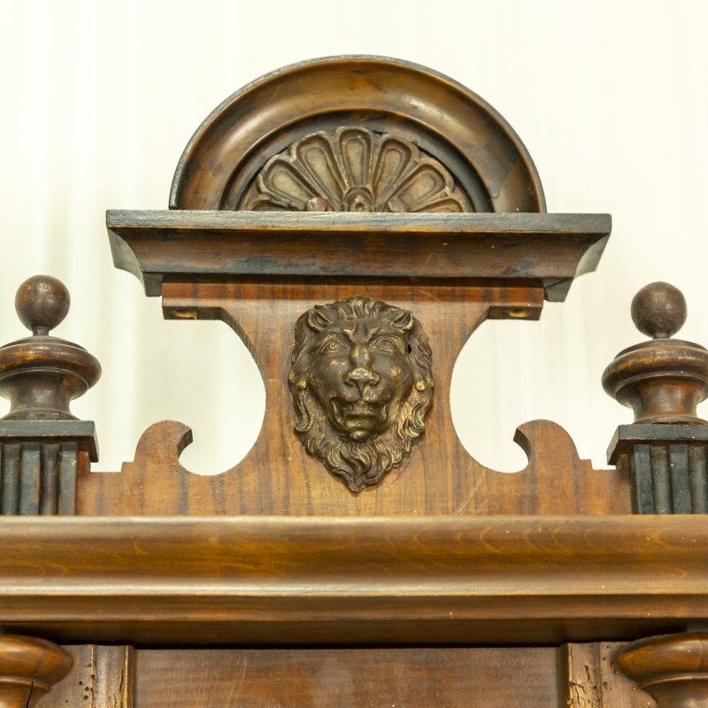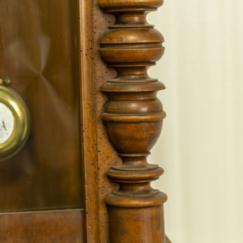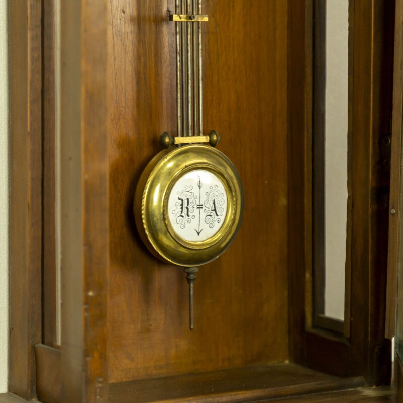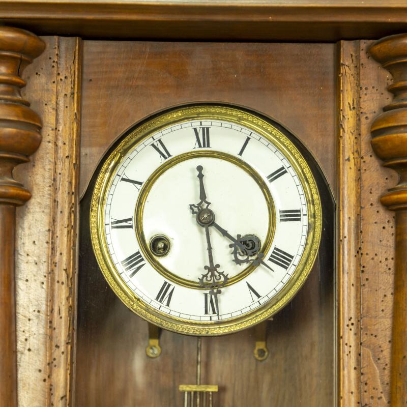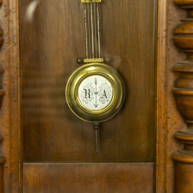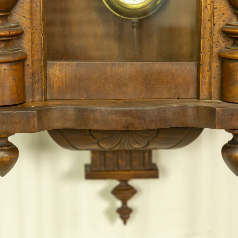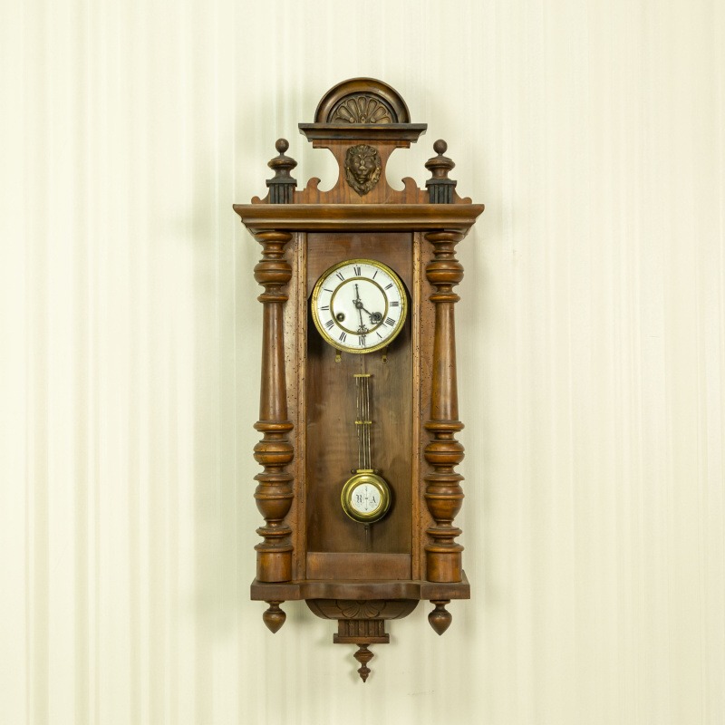 Изящные часы изготовленные Германии, в конце XIX века. Корпус часов выполнен из дерева, и элегантно украшен резными элементами. Эмалевый циферблат, великолепно сочетается с двумя стрелками классической формы. На задней стенке механизма имеется клеймо часовой мастерской Kienzle.