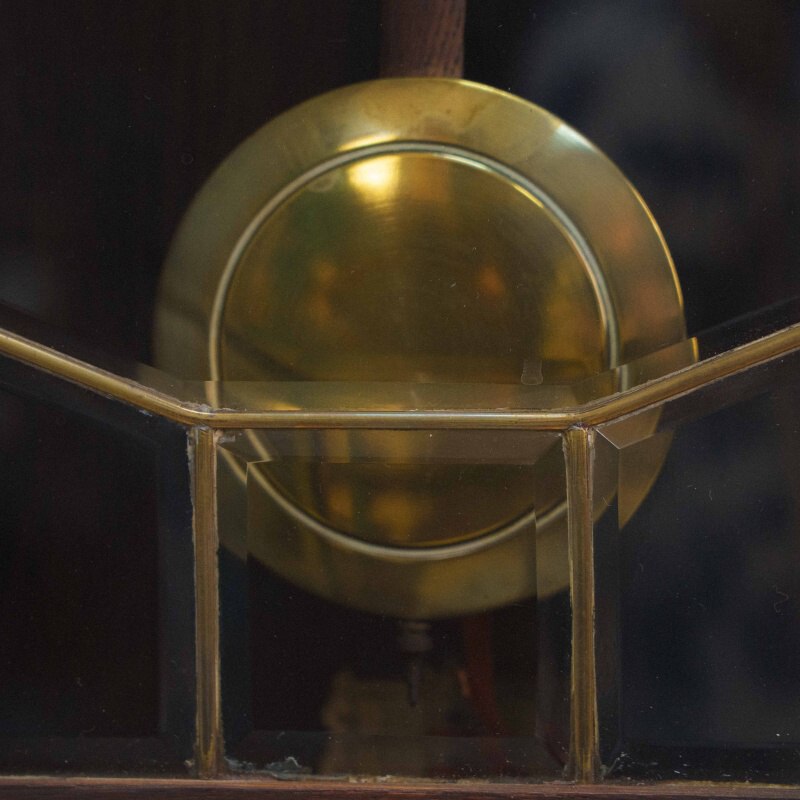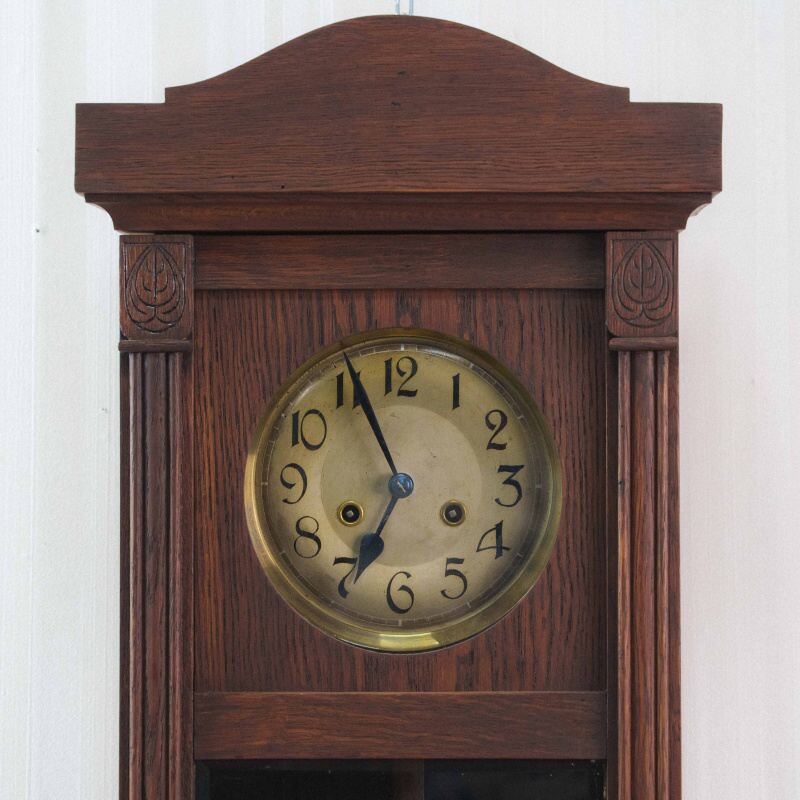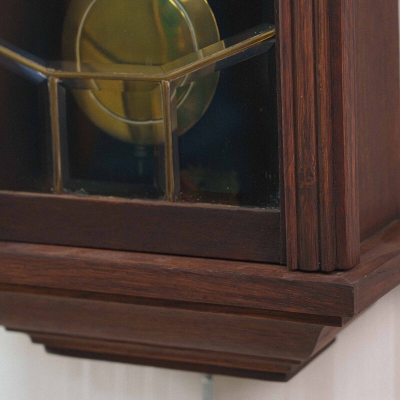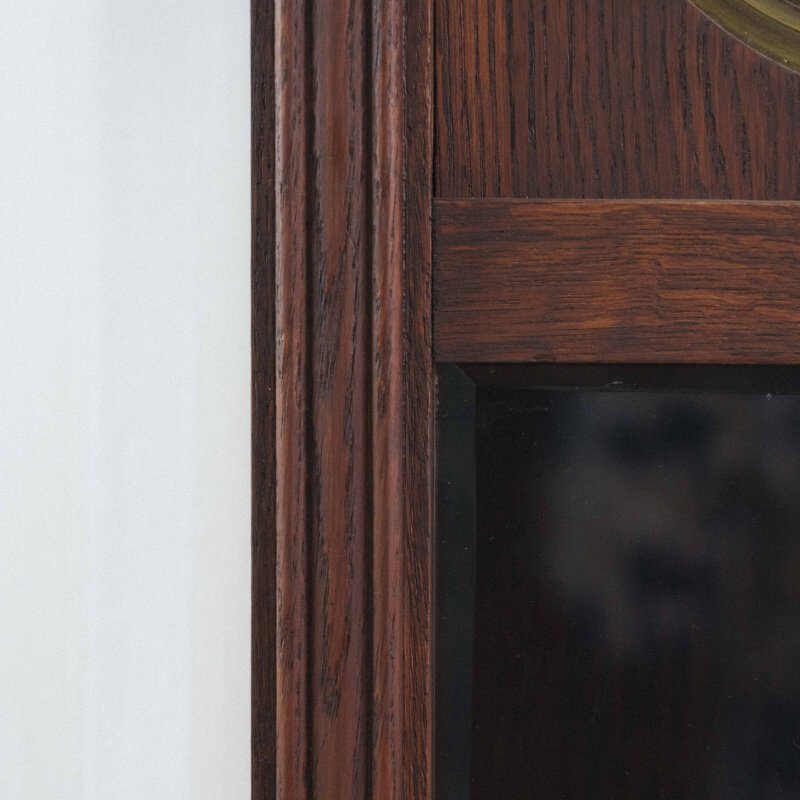 Корпус выполнен в стиле позднего модерна или раннего ар-деко из массива дуба. Характерные резные плечики по бокам от циферблата и ступенчатое завершение сверху– отличительный почерк мастеров Mauthe. Механизм с семидневным запасом хода. Два отверстия на циферблате говорят о наличии боя каждые полчаса и час. Латунная линза маятника в нижней застекленной части корпуса– типичный элемент немецких регуляторов того времени.