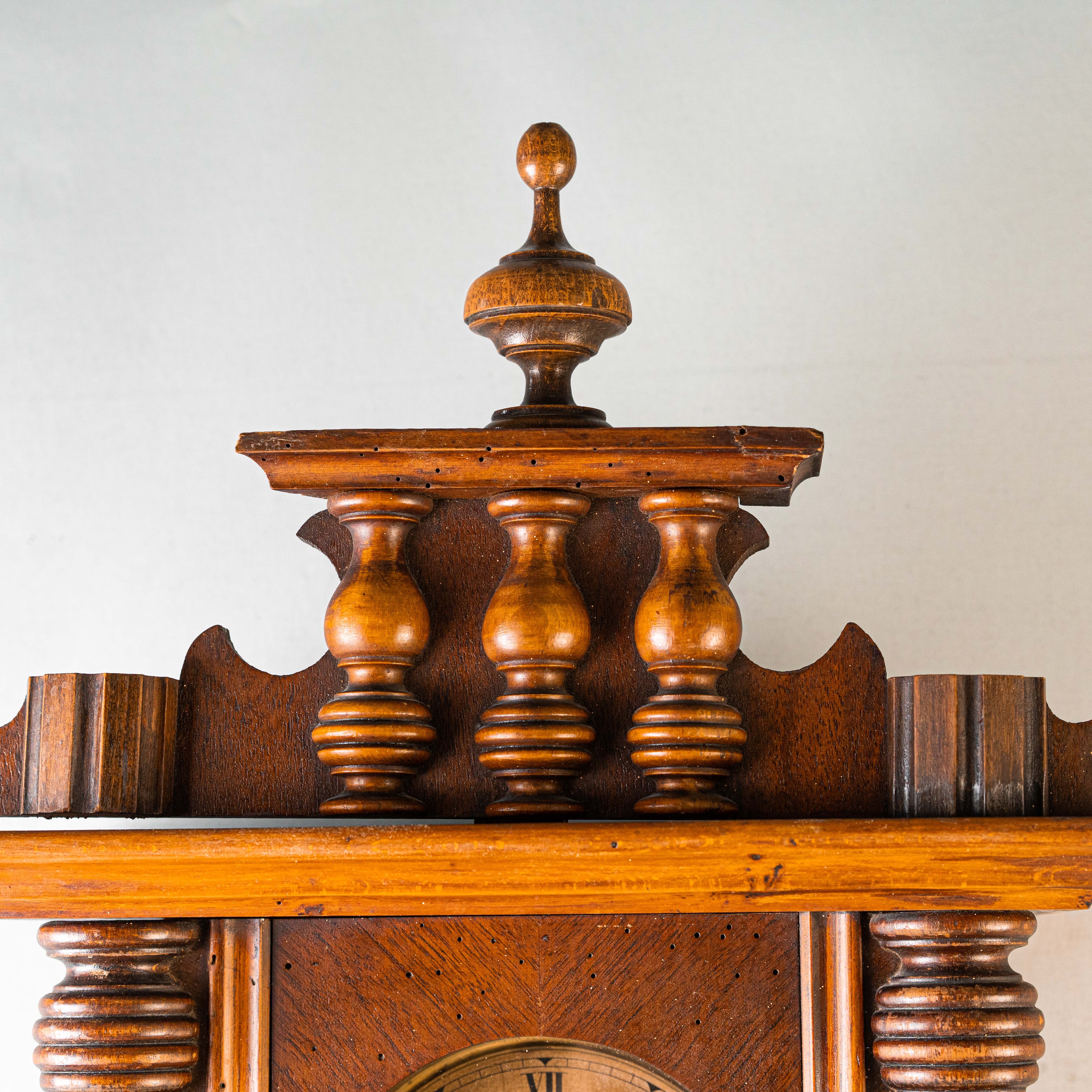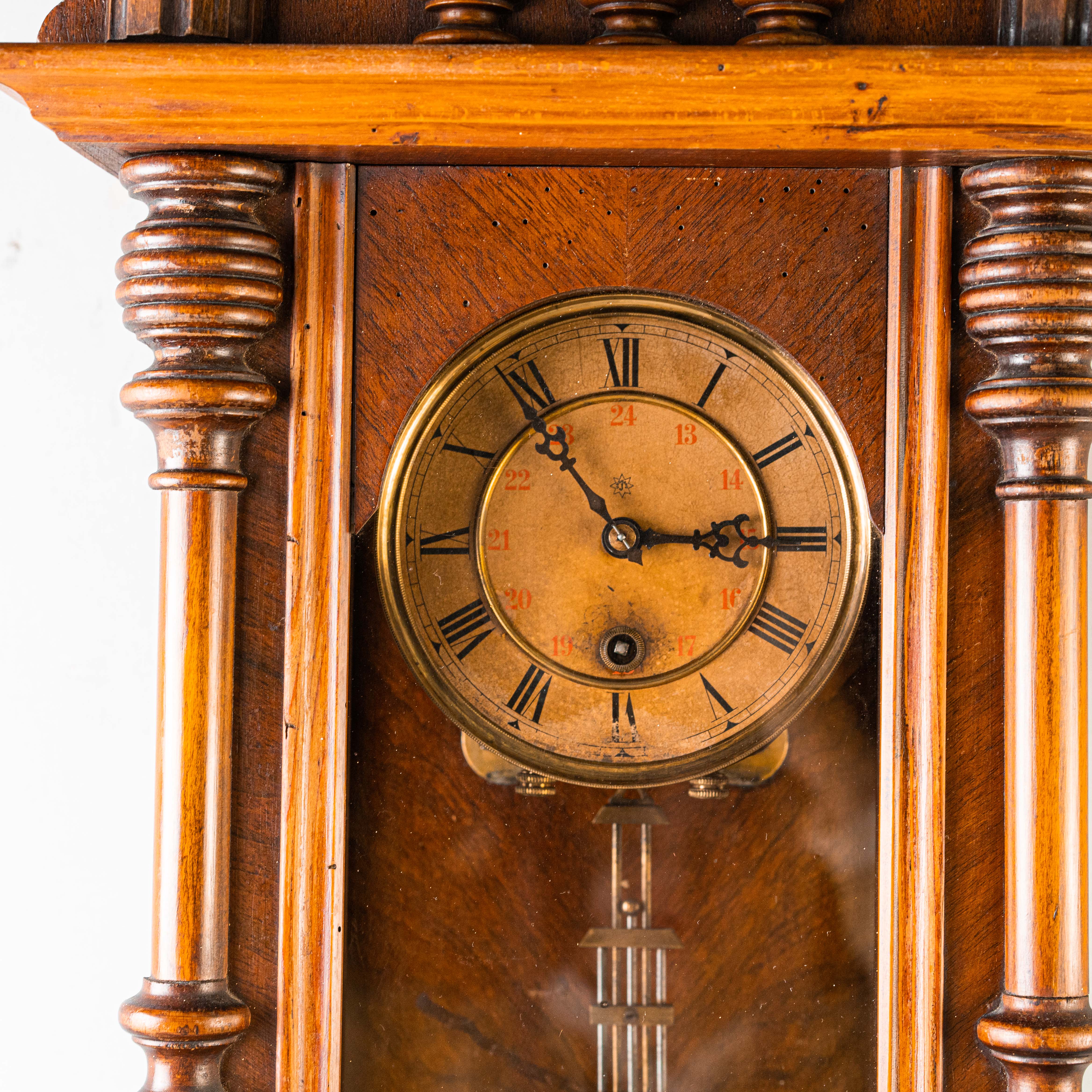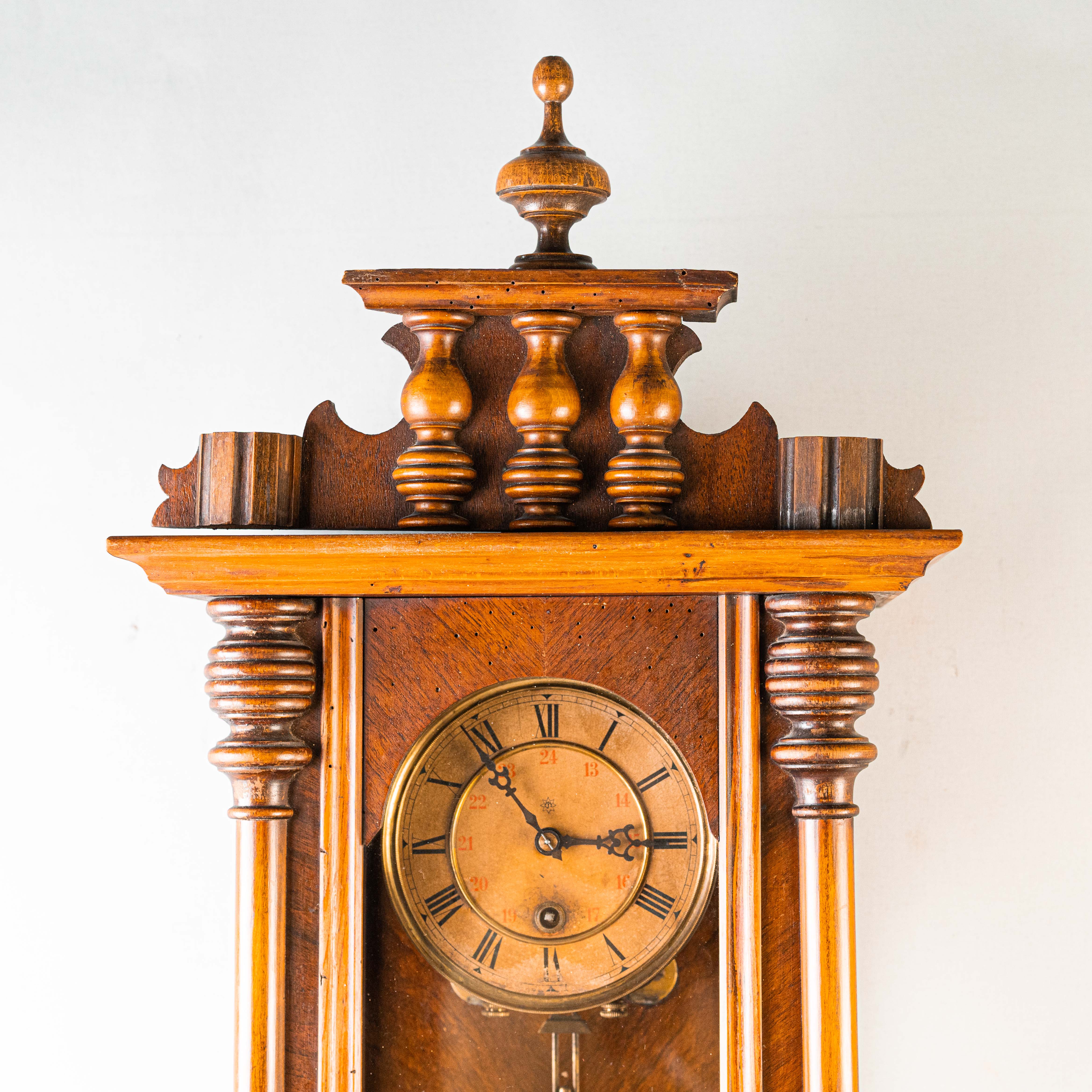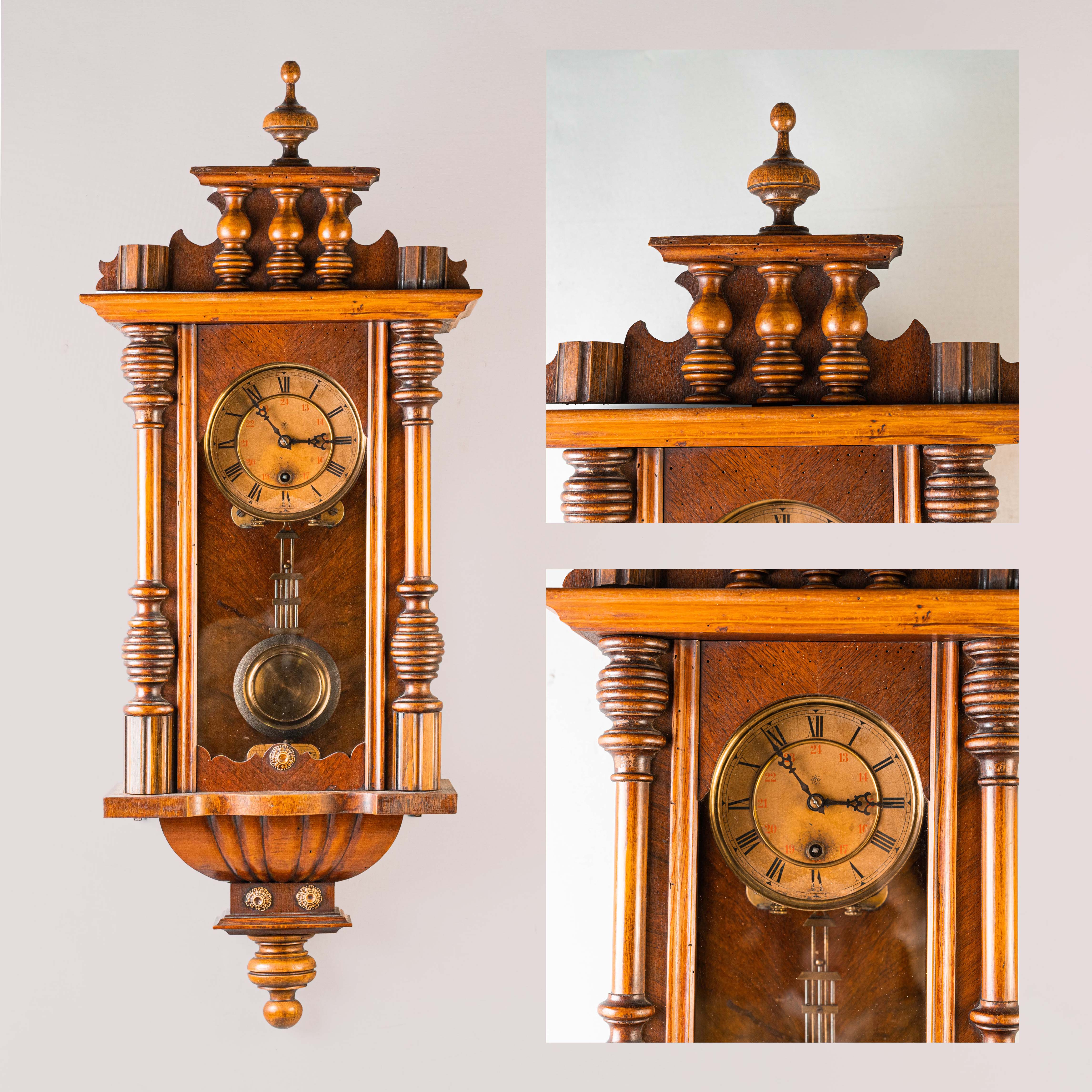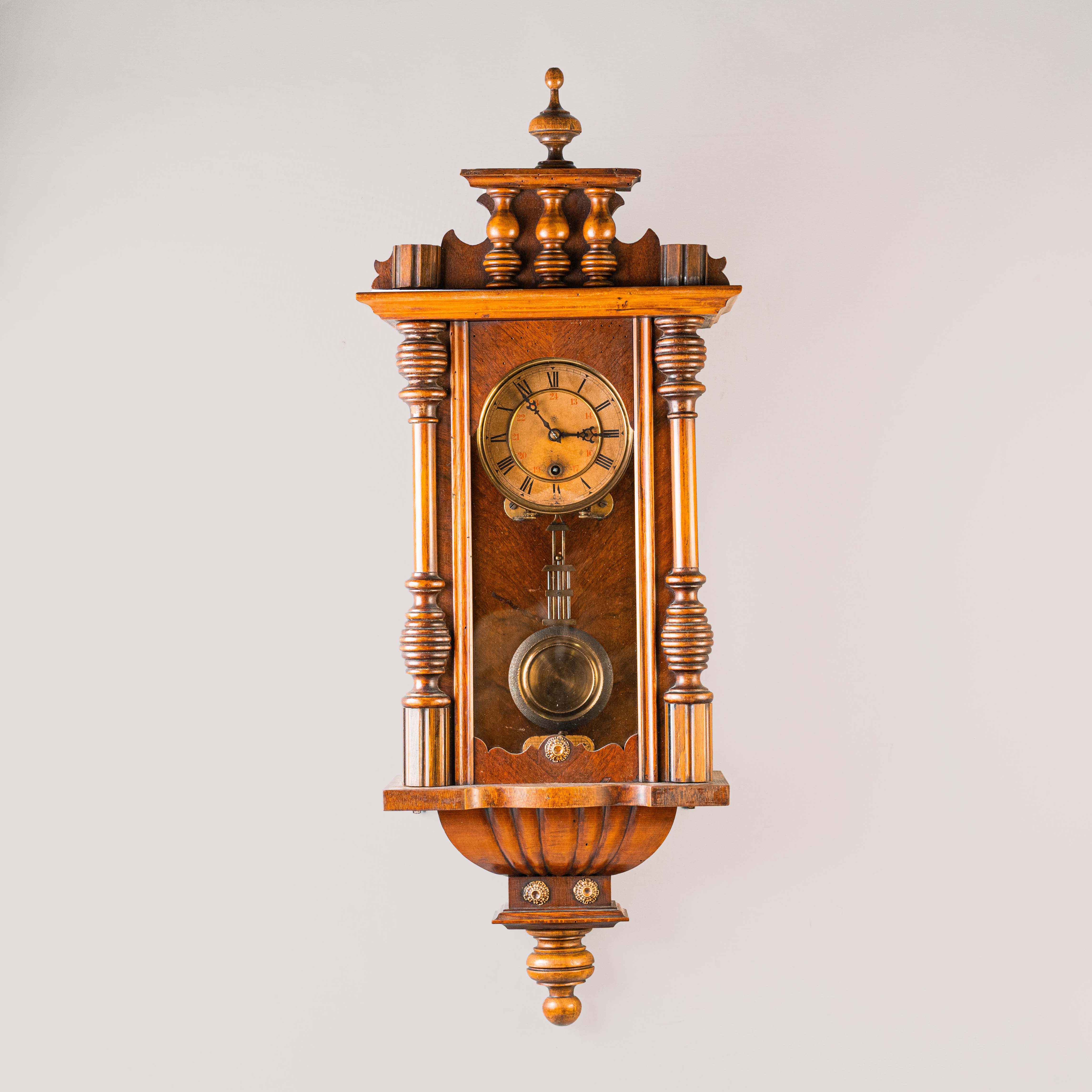 Настенные часы без боя. Циферблат с римскими и арабскими цифрами великолепно сочетается с двумя ажурными стрелками. Механизм изготовлен на немецкой часовой мастерской Junghans, в конце XIX — начале ХХ века.