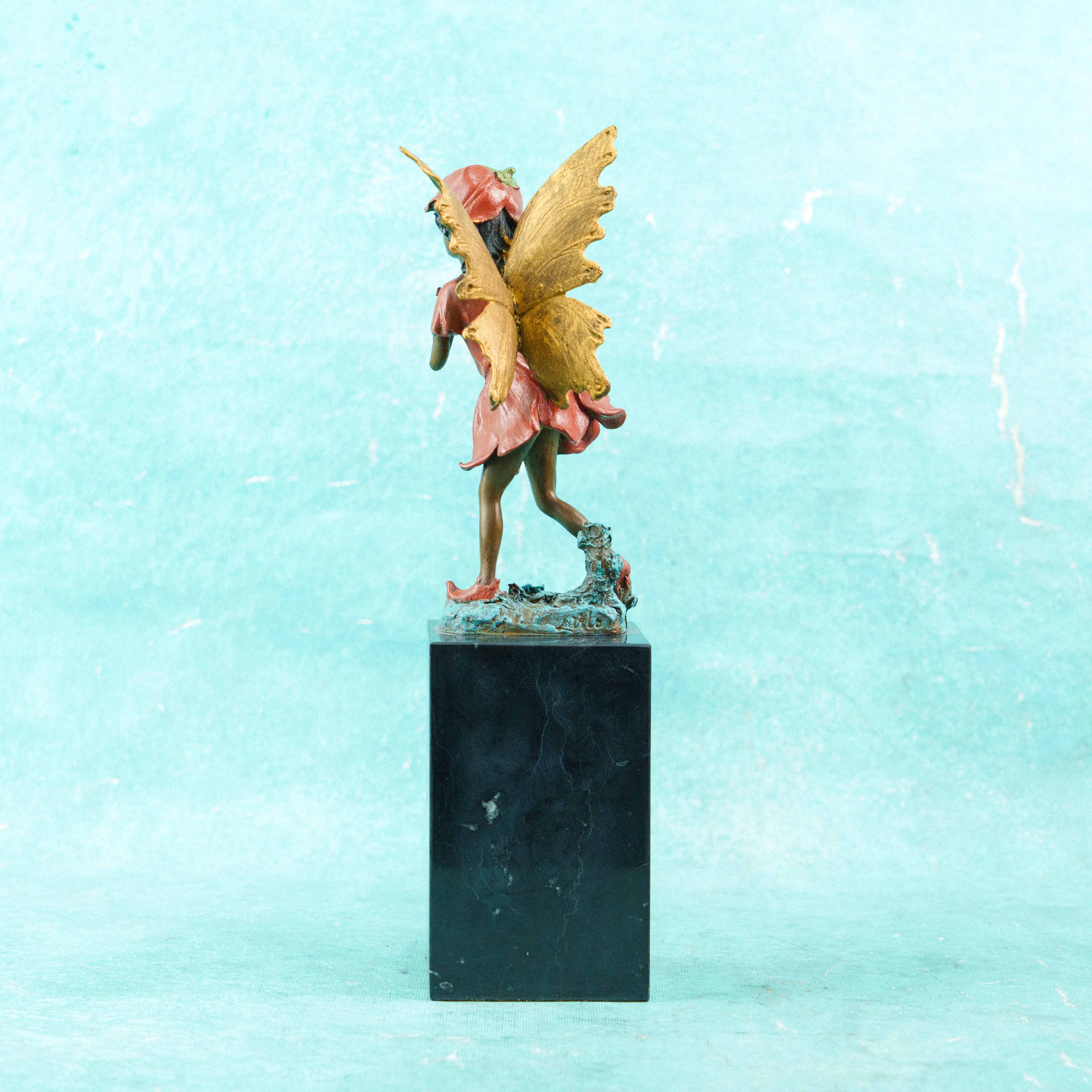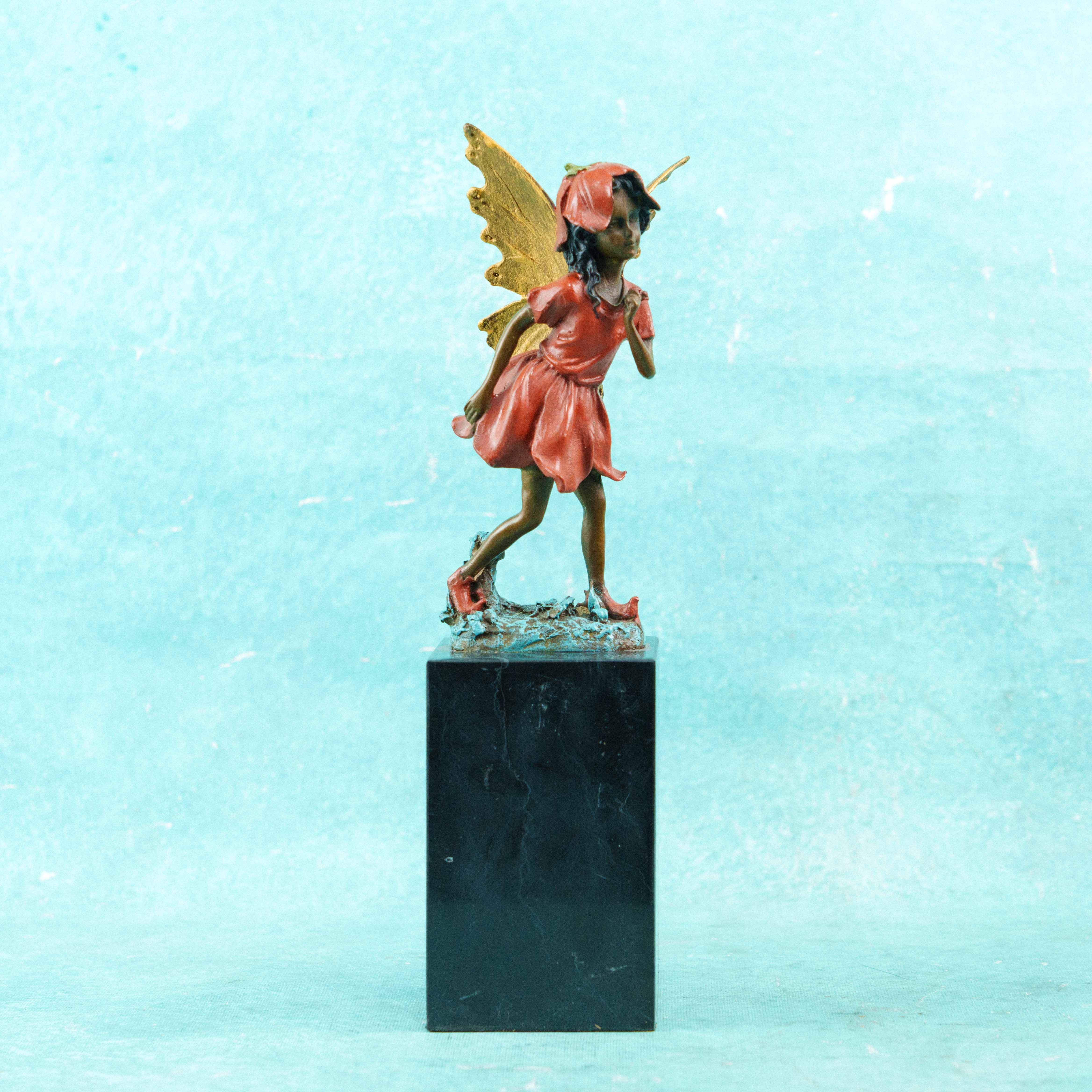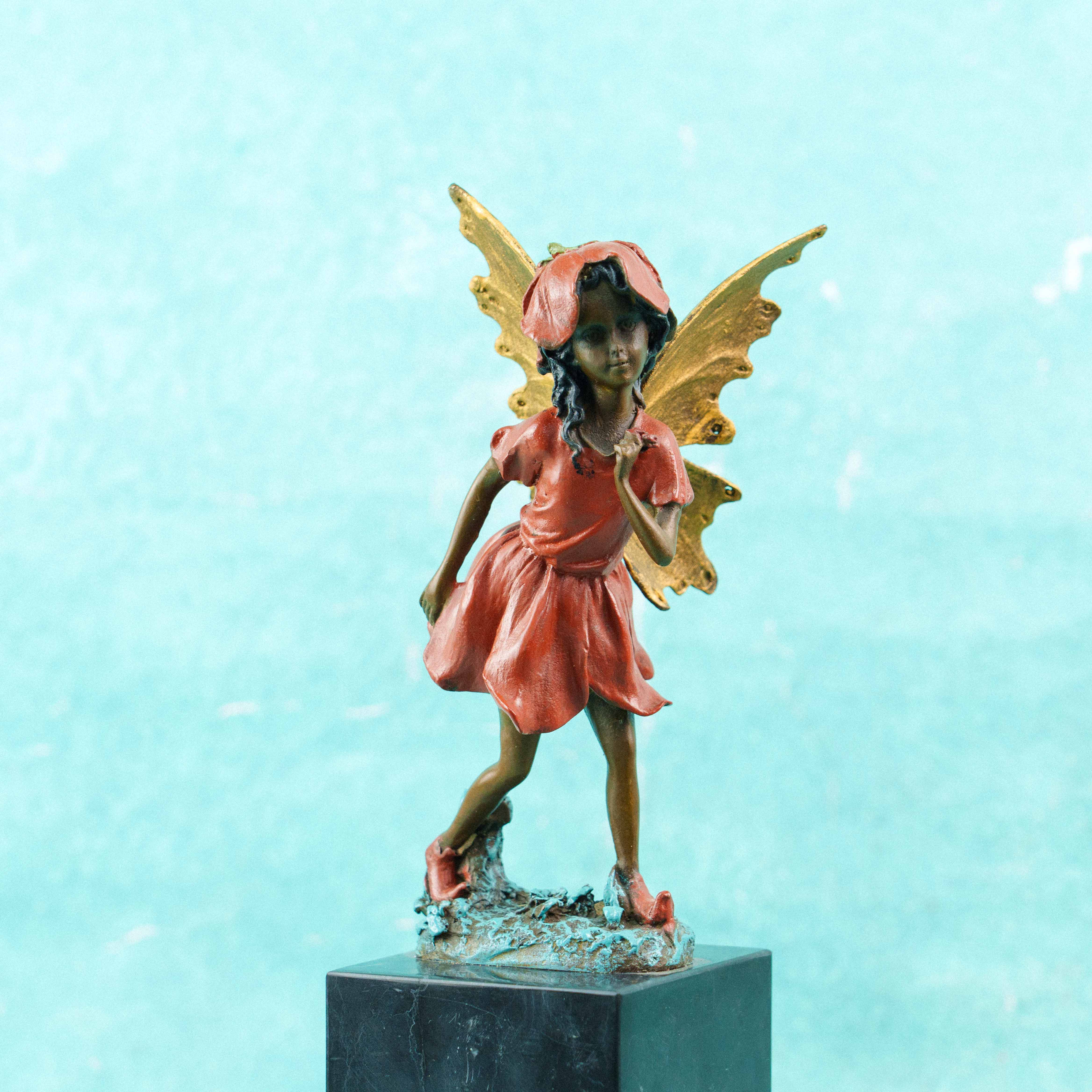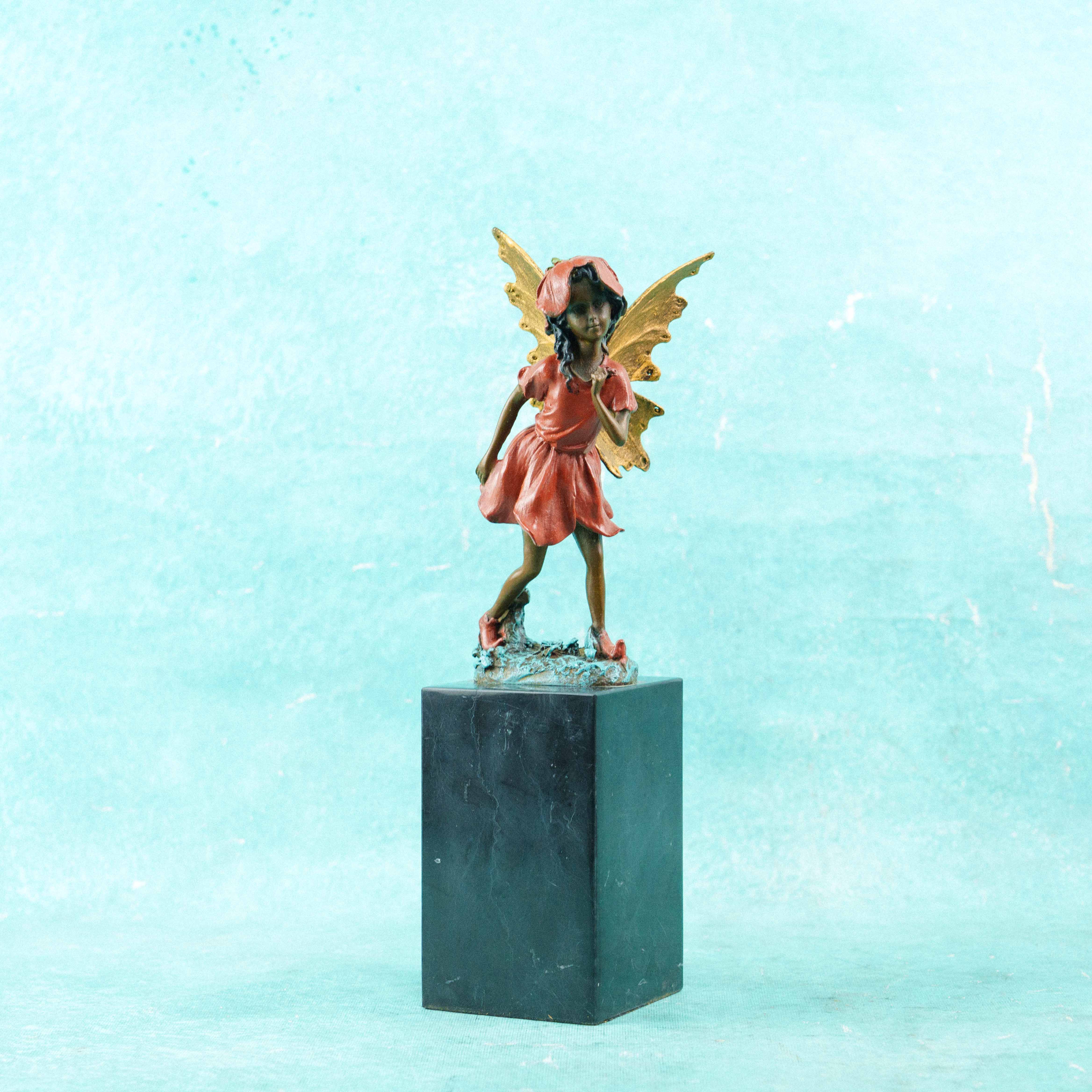 Изящная скульптура феи словно сошла со страниц волшебной сказки. Лёгкая, почти невесомая фигура застыла в движении — как будто она только что приземлилась или собирается вспорхнуть вновь. Наклон головы, мягкий жест руки и плавная линия шага создают ощущение тайны, нежности и живого дыхания.