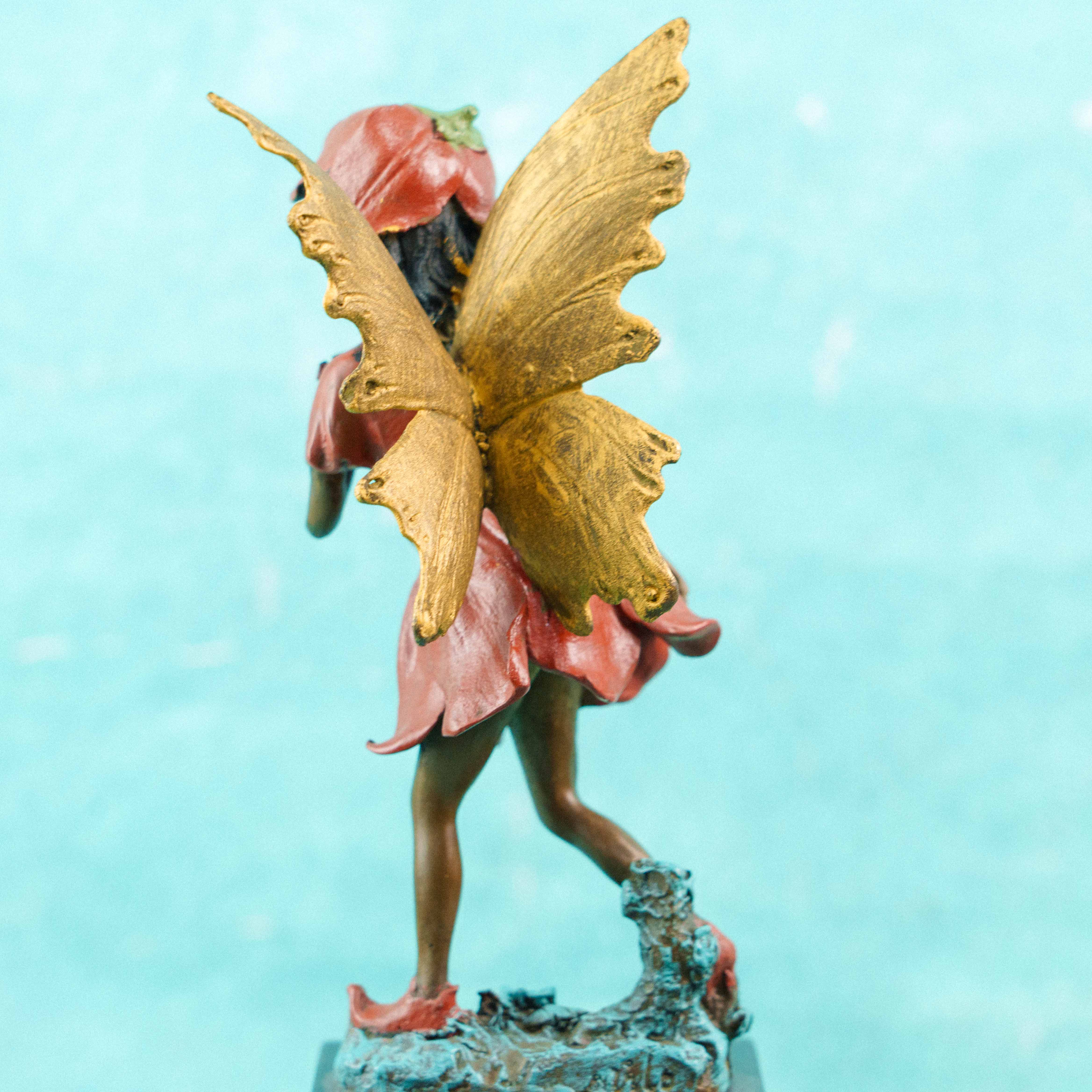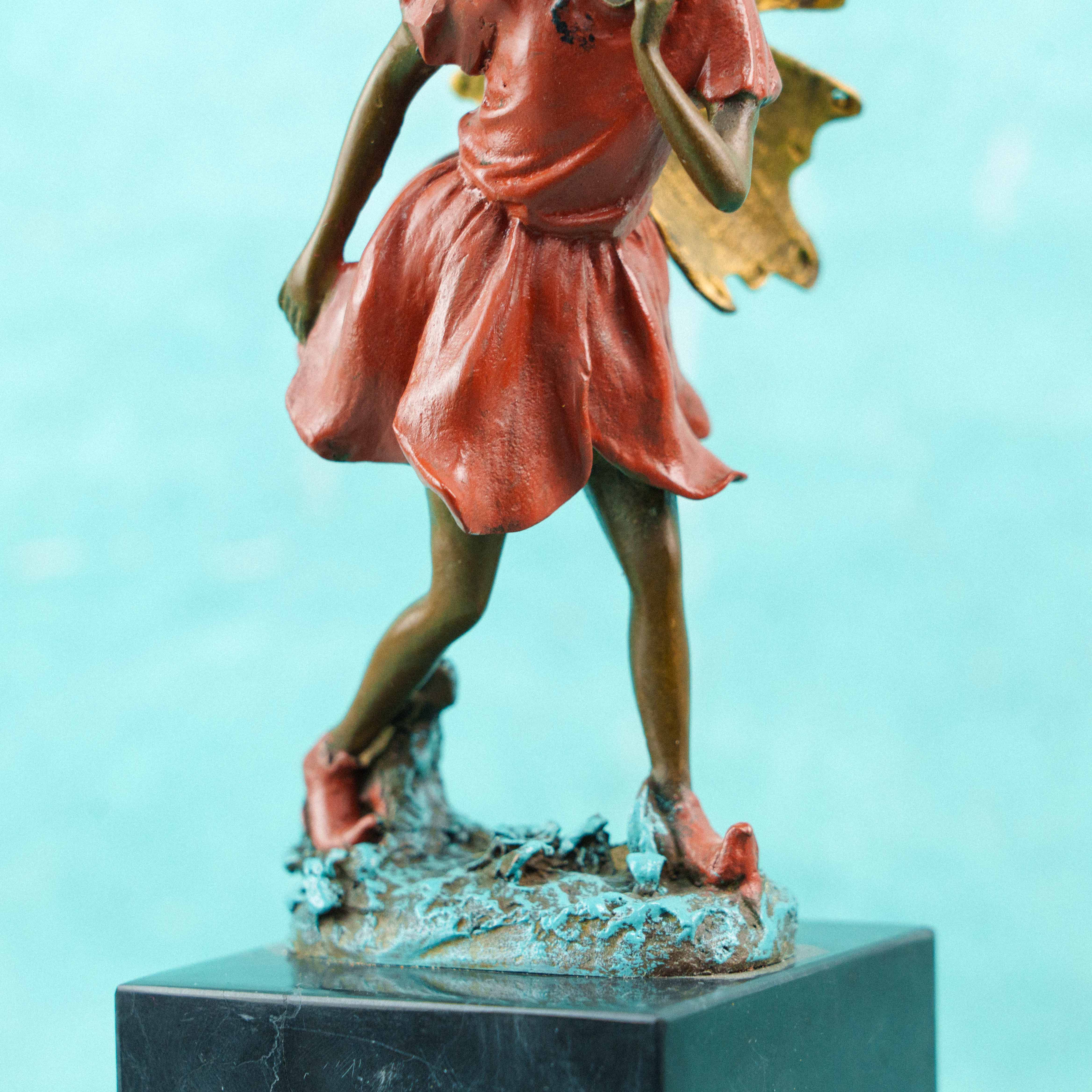 Особое внимание притягивают крылья, покрытые золотистой патиной: они добавляют образу сияние, глубину и ощущение сказочного света. Контраст между тёплыми оттенками платья и благородной бронзовой патиной кожи подчёркивает утончённость образа и придаёт скульптуре выразительный, художественный характер.