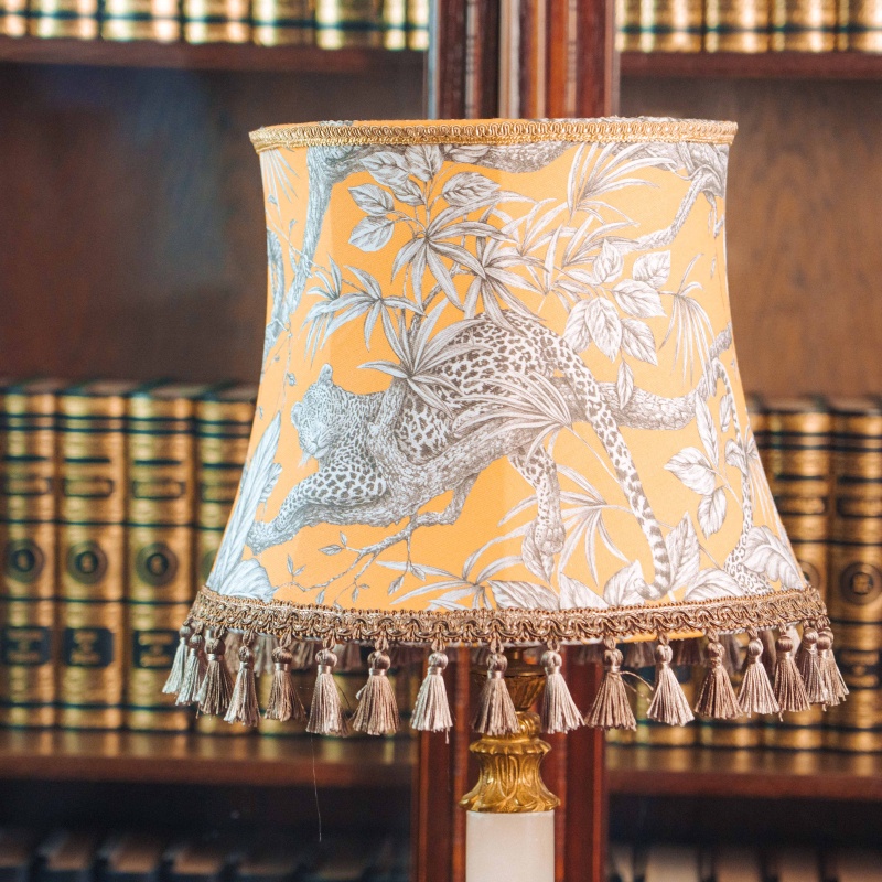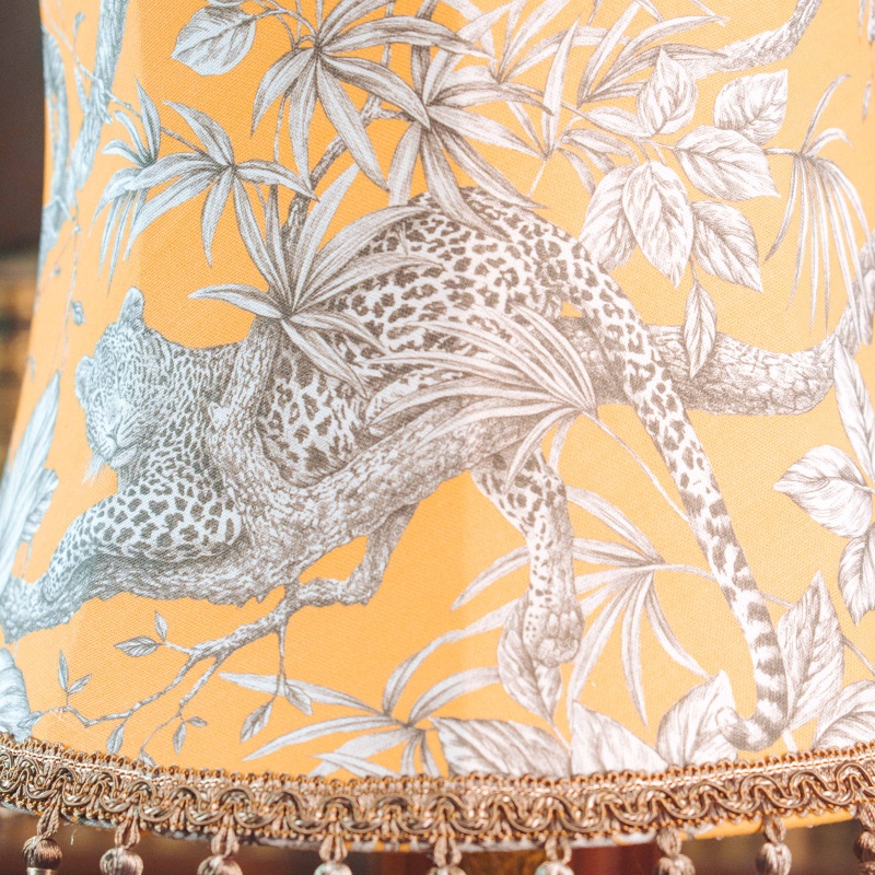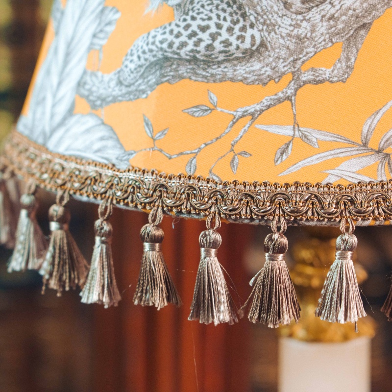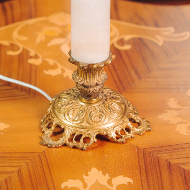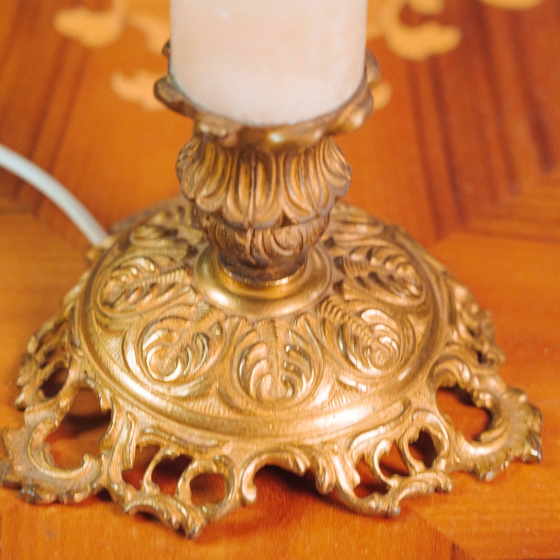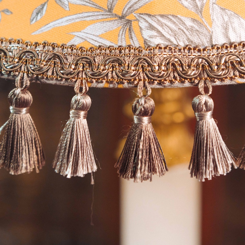 Основание украшено фигурными латунными элементами и устойчивой декоративной ножкой, выполненной в традициях классического интерьерного освещения. Абажур украшен изящным орнаментом с растительными мотивами и декоративной бахромой, благодаря чему лампа создаёт мягкий, уютный свет.