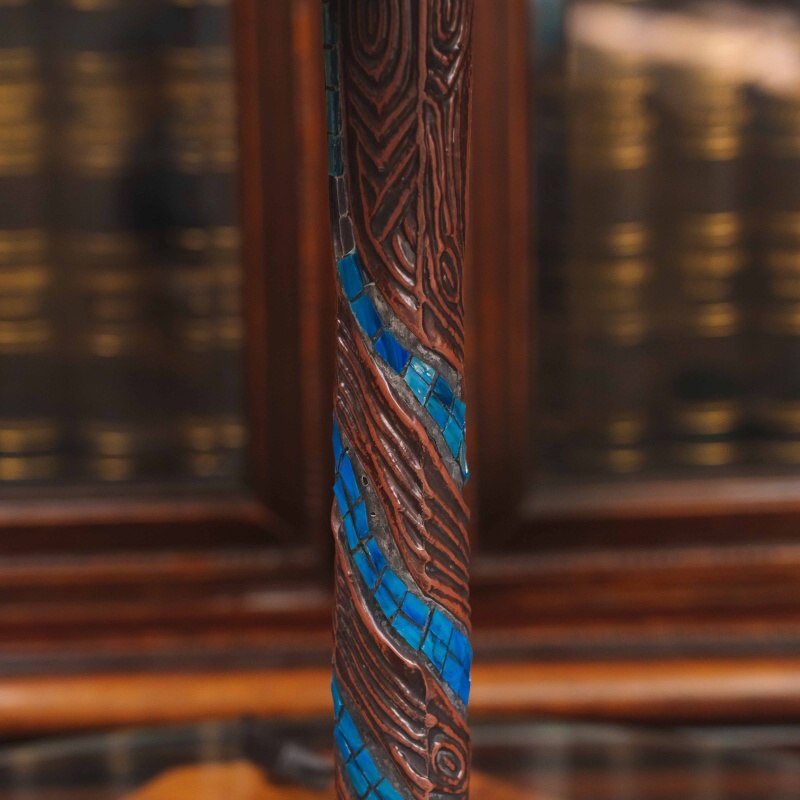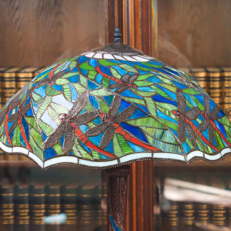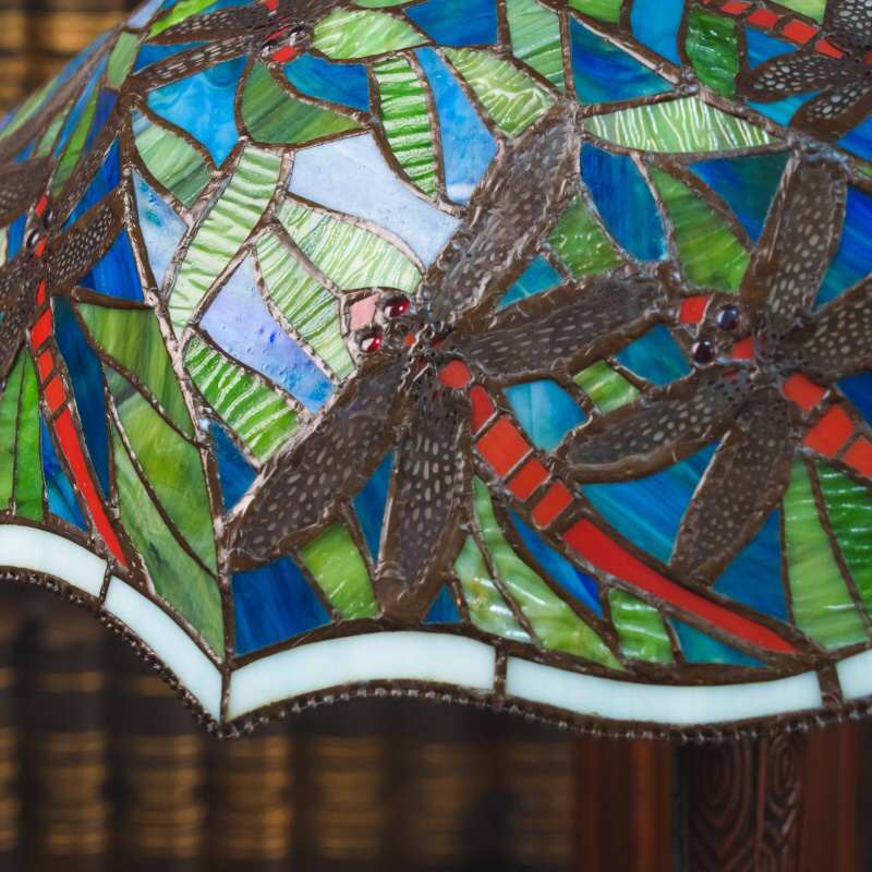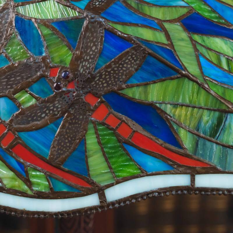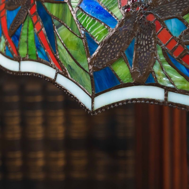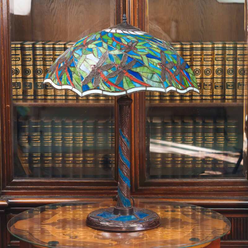 Основание выполнено из металла и украшено декоративными элементами, гармонирующими с витражным абажуром. Лампа является ярким декоративным предметом интерьера и прекрасно подойдёт для гостиной, кабинета или библиотеки, а также станет ценным элементом коллекционного декора.