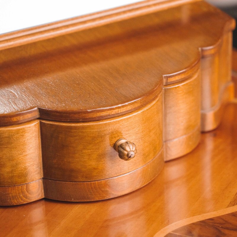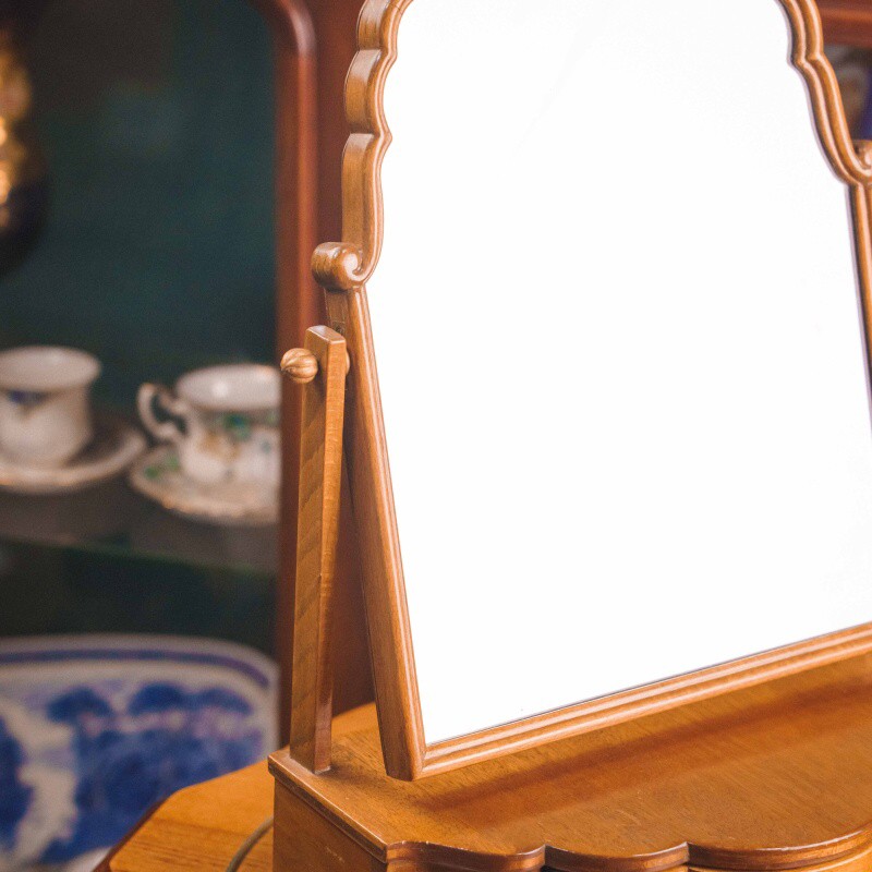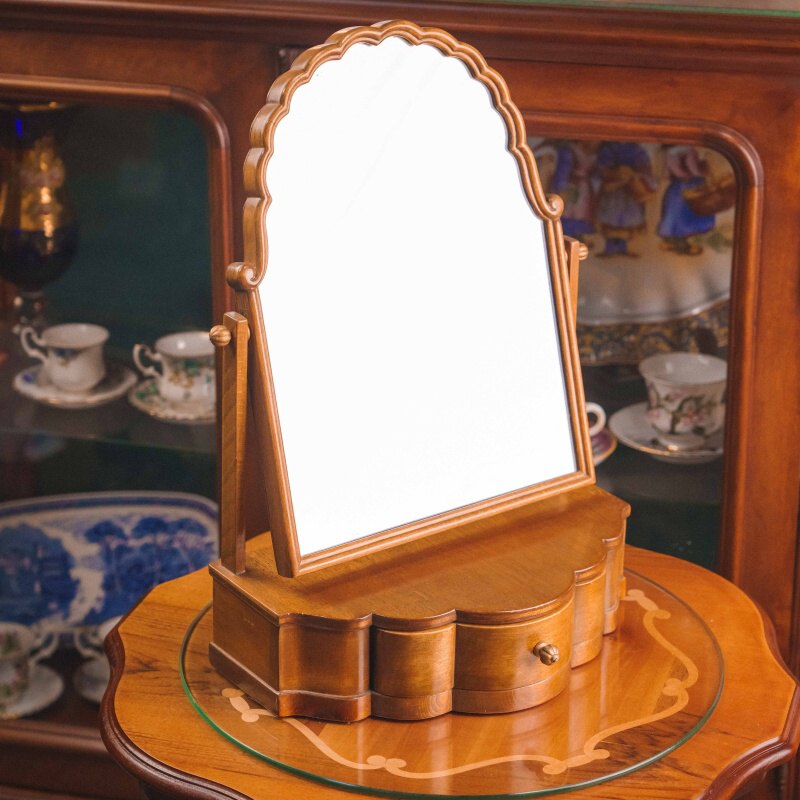 Элегантное настольное зеркало в изящной деревянной раме, дополненное шкатулкой с плавными линиями и декоративной фурнитурой. Форма рамки отличается мягкими волнистыми очертаниями, создающими ощущение утончённости и ручной художественной работы. Зеркало имеет поворотный механизм, что делает его удобным в использовании и позволяет настроить угол наклона под любые задачи.