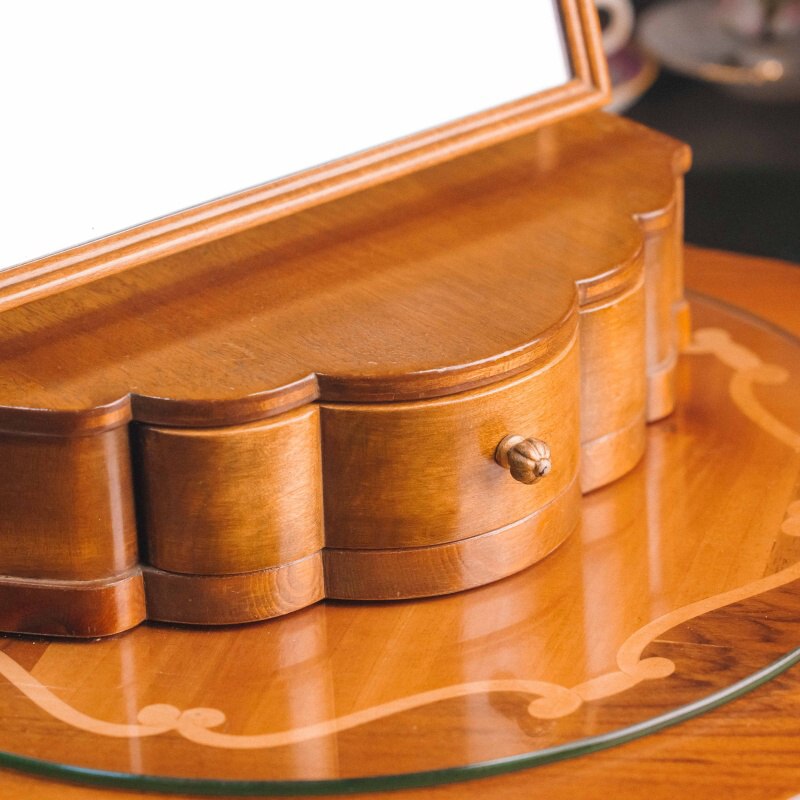 Основание выполнено в виде небольшой шкатулки с отделением для хранения украшений, мелких аксессуаров или косметики. Тёплый оттенок натурального дерева подчёркивает красоту текстуры и придаёт изделию уютный, винтажный характер.