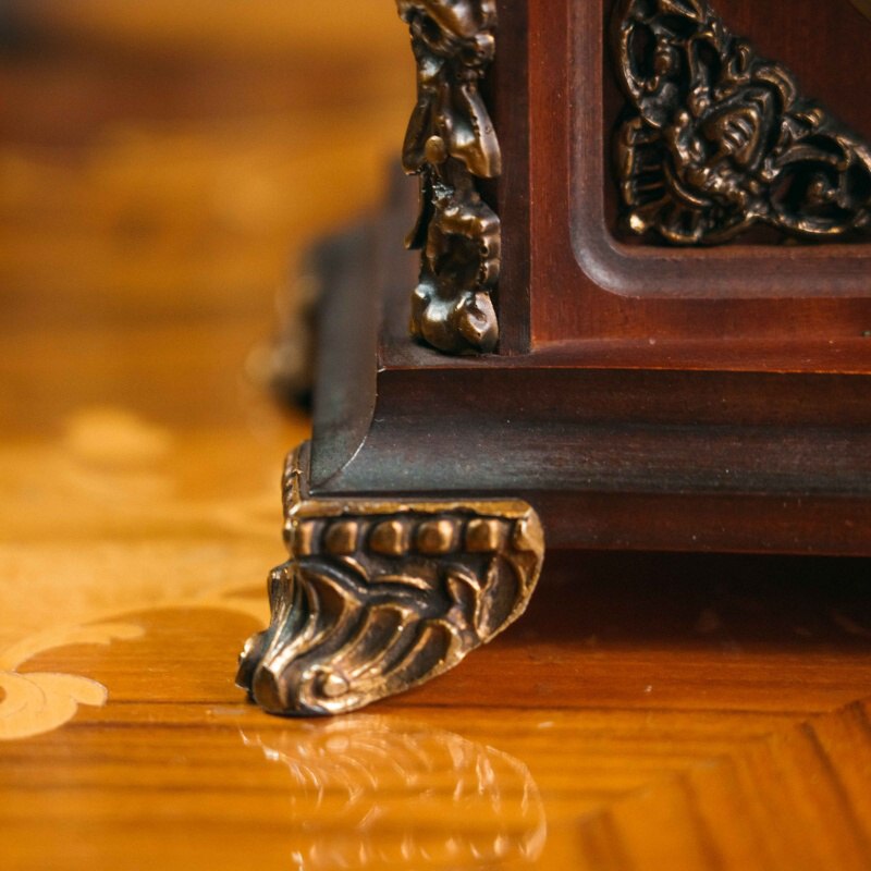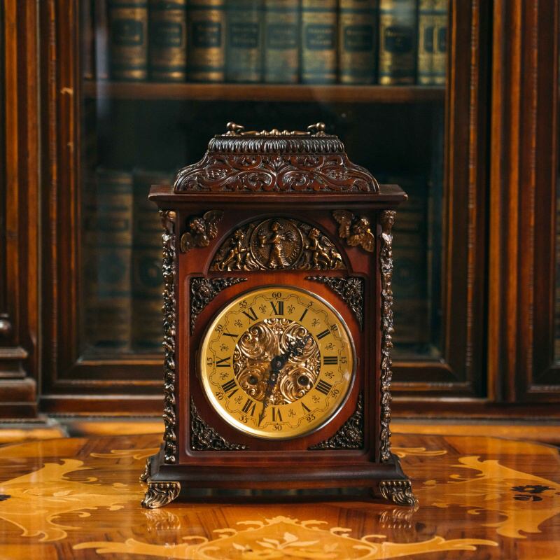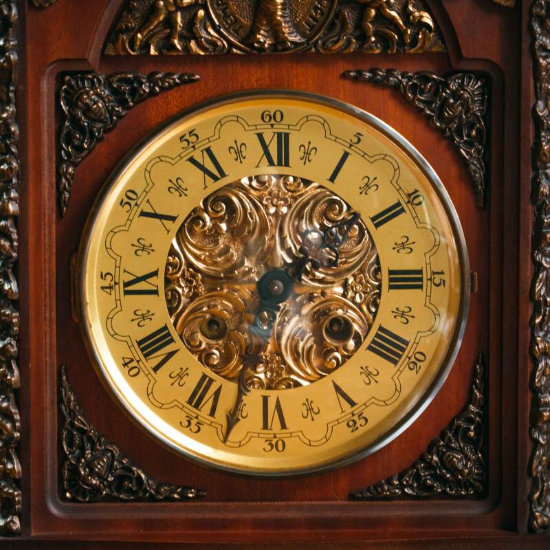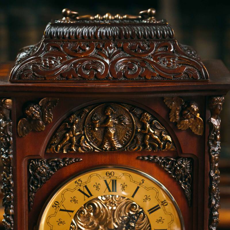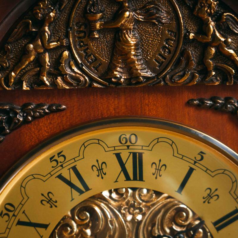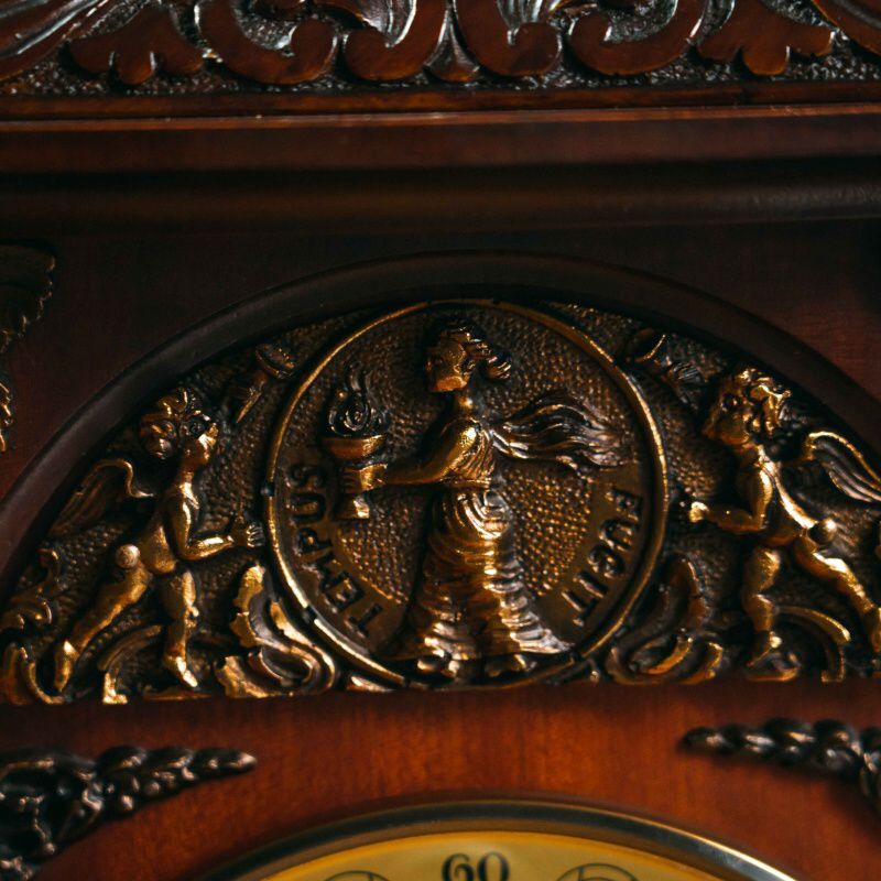 Контраст тёплого полированного дерева и мерцающего металлического декора, сочетание резьбы и литых деталей создают выразительный интерьерный акцент. Такие часы органично смотрятся в библиотеке, кабинете или гостиной, добавляя пространству ощущение респектабельной классики середины XX века.