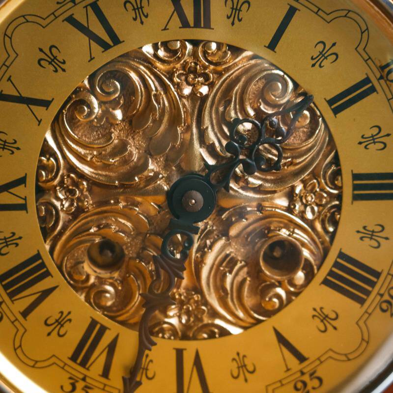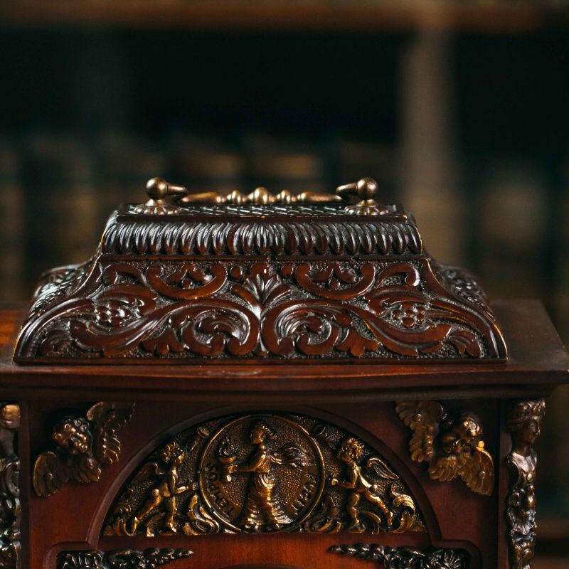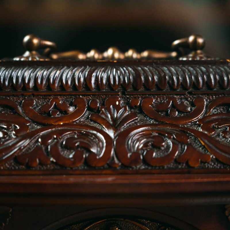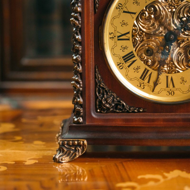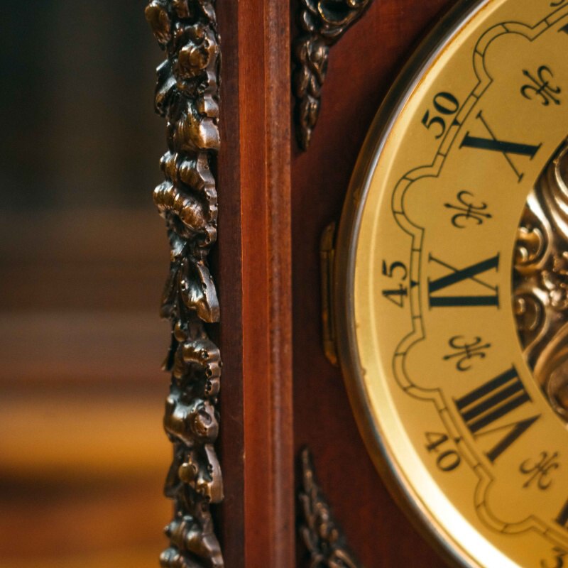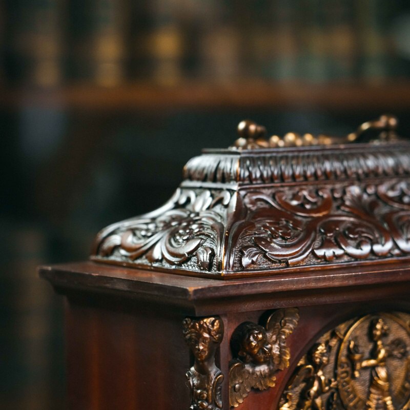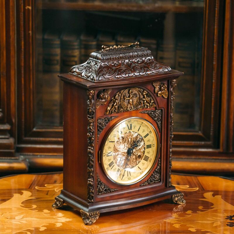 Контраст тёплого полированного дерева и мерцающего металлического декора, сочетание резьбы и литых деталей создают выразительный интерьерный акцент. Такие часы органично смотрятся в библиотеке, кабинете или гостиной, добавляя пространству ощущение респектабельной классики середины XX века.