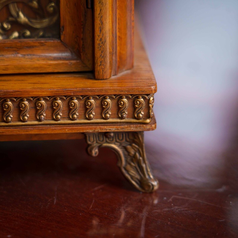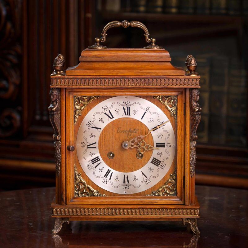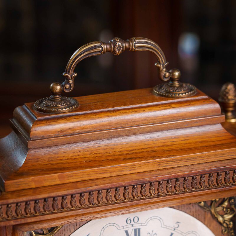 Эти настольные часы работы немецкой мастерской Franz Hermle & Sohne выполнены в классическом стиле с корпусом из благородного дерева и декоративными латунными накладками. Серебристый циферблат с римскими цифрами и изящными стрелками обрамлён орнаментированными элементами, придающими часам выразительность и торжественность.