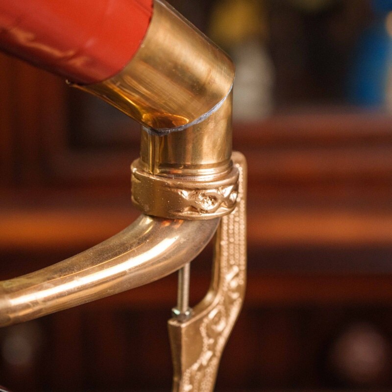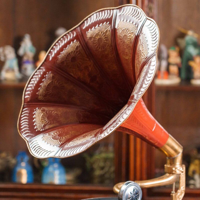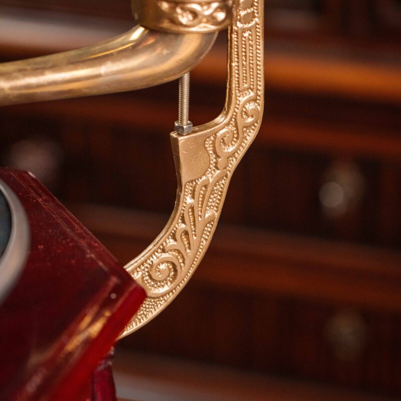 Металлическая рупорная труба с богатой гравировкой и тёплым медно-бронзовым оттенком эффектно подчёркивает винтажную эстетику. Механический поворотный тонарм и диск создают аутентичный облик, отсылающий к эпохе расцвета аналоговой музыки.