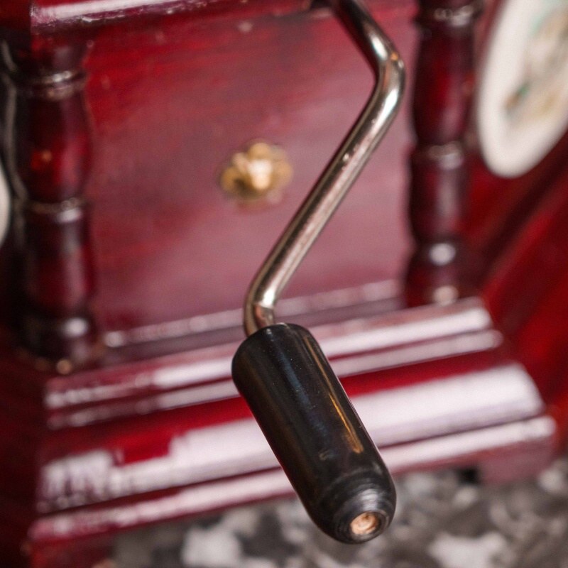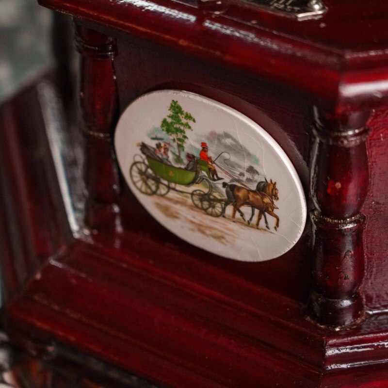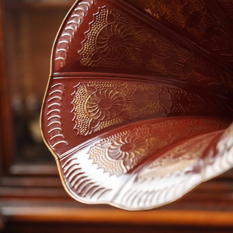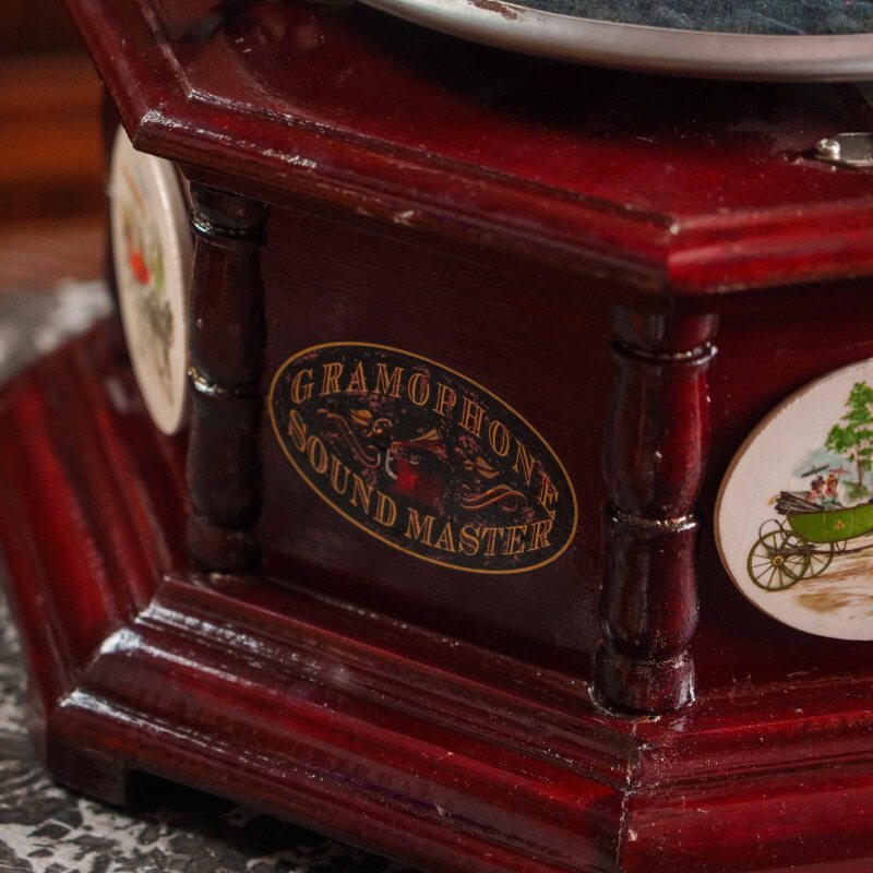 Декоративный настольный граммофон, выполненный в традициях начала XX века. Корпус изготовлен из дерева с насыщенным бордово-красным лаковым покрытием, украшен медальонами с жанровыми сценами, что придаёт предмету коллекционный и интерьерный характер.