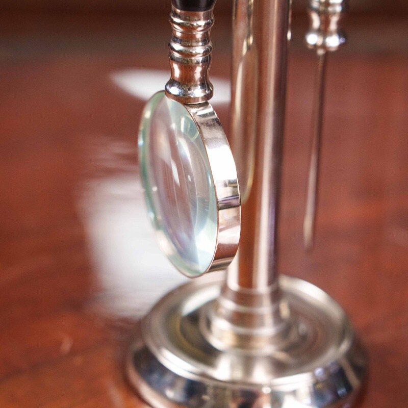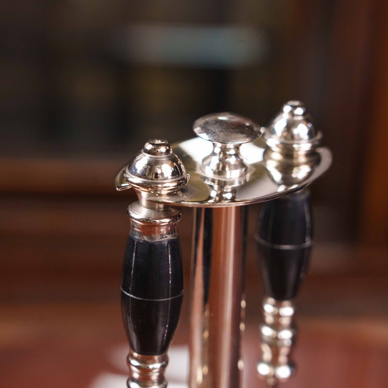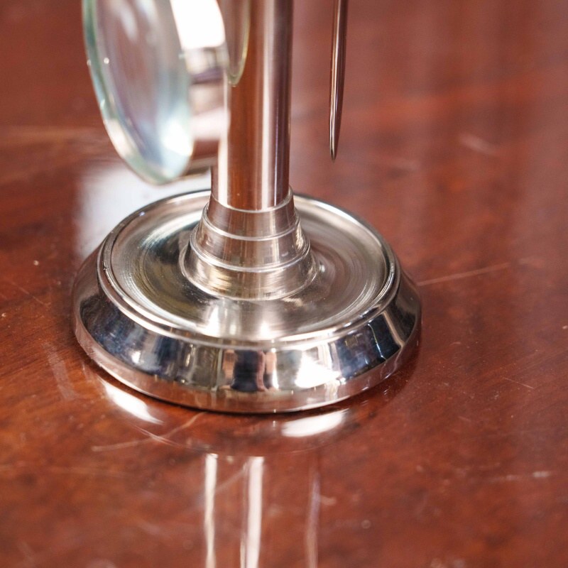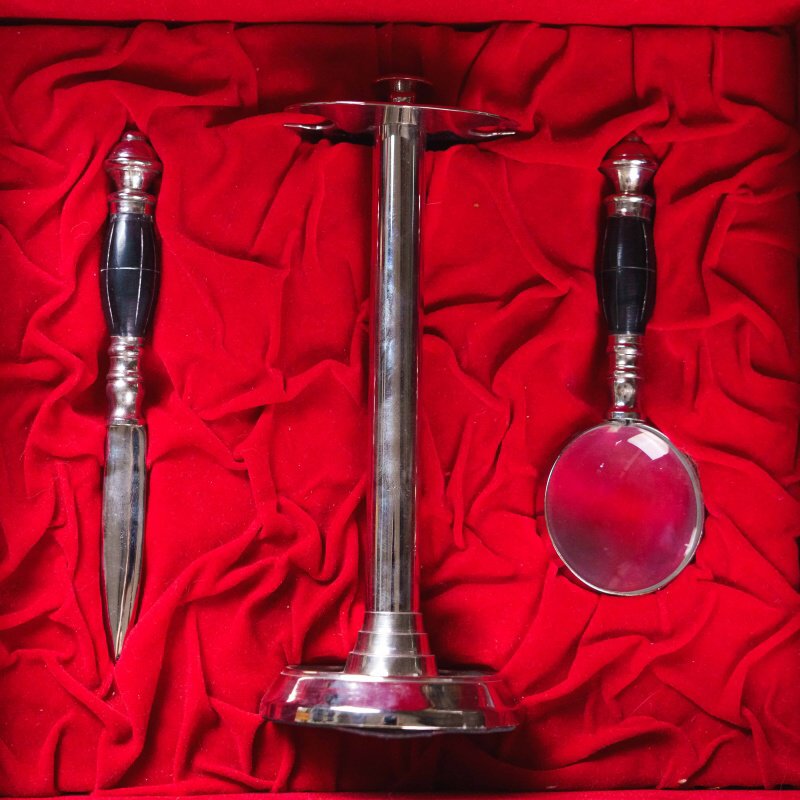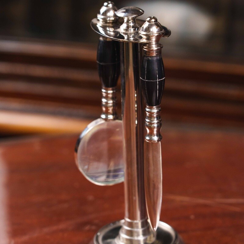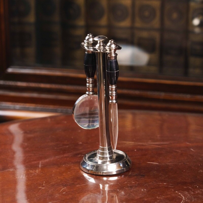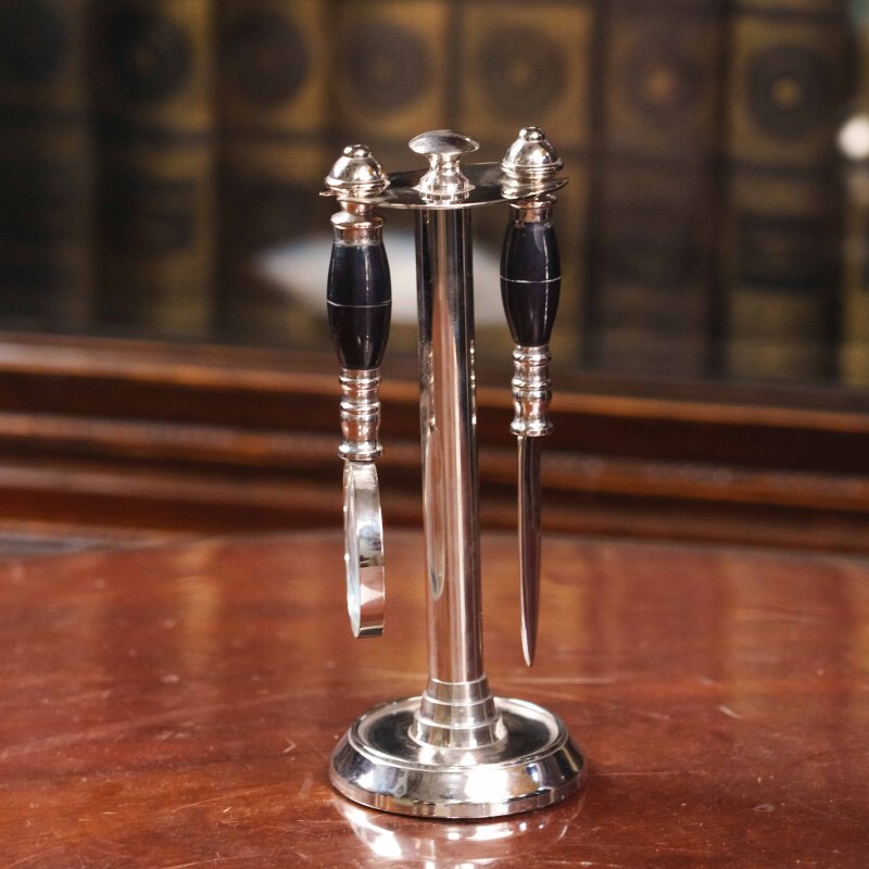Элегантный настольный набор в классическом стиле, включающий лупу и нож для вскрытия писем на металлической подставке. Ручки выполнены из тёмного дерева с декоративными металлическими элементами, придающими предметам солидность и аристократичный вид. Подобные наборы традиционно украшали письменные столы библиотек и кабинетов, символизируя вкус и внимание к деталям.
