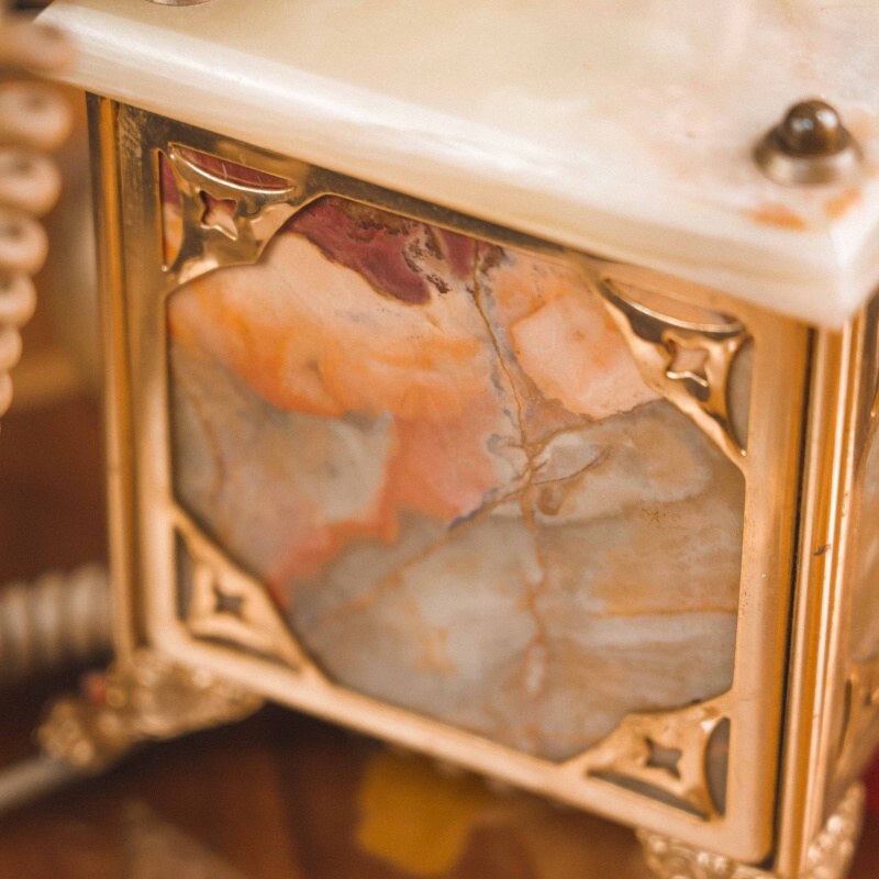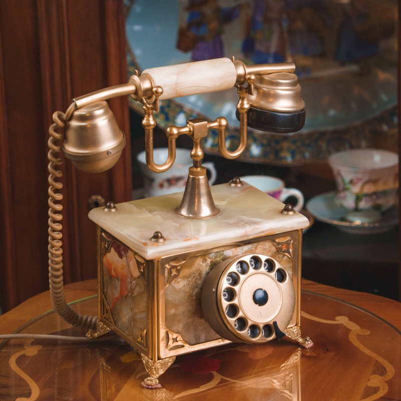 Эффектный декоративный телефон, выполненный из натурального оникса и металла, представляет собой изысканный предмет интерьера в классическом винтажном стиле. Корпус из полированного оникса обладает мягким блеском и характерным природным рисунком камня, который делает каждый экземпляр уникальным. Металлические элементы — трубка, подставка, ножки и декоративные накладки — выполнены в тёплом золотистом оттенке и гармонично сочетаются с природной текстурой камня.