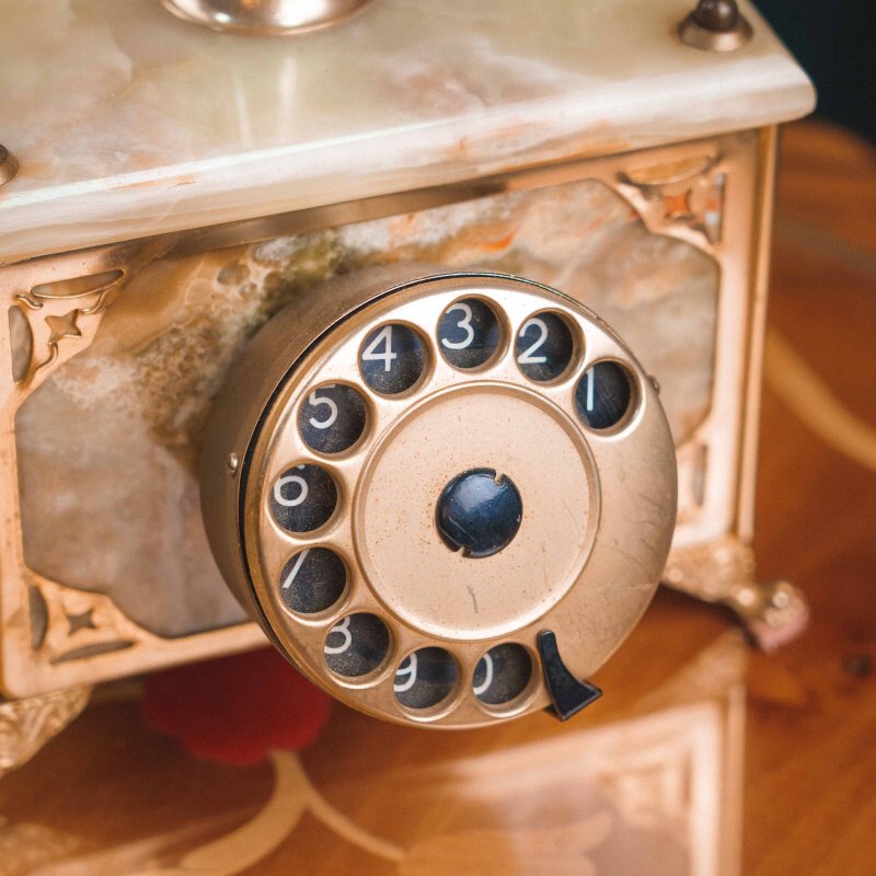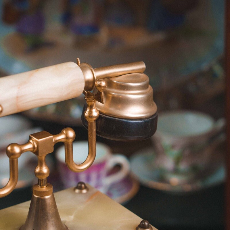 Фигурные ножки и изящные металлические детали придают предмету благородный характер, отсылая к эпохе ранних телефонных аппаратов конца XIX – начала XX века. Круглый дисковый набор выполнен декоративно, подчеркивая ретро-стилистику.
