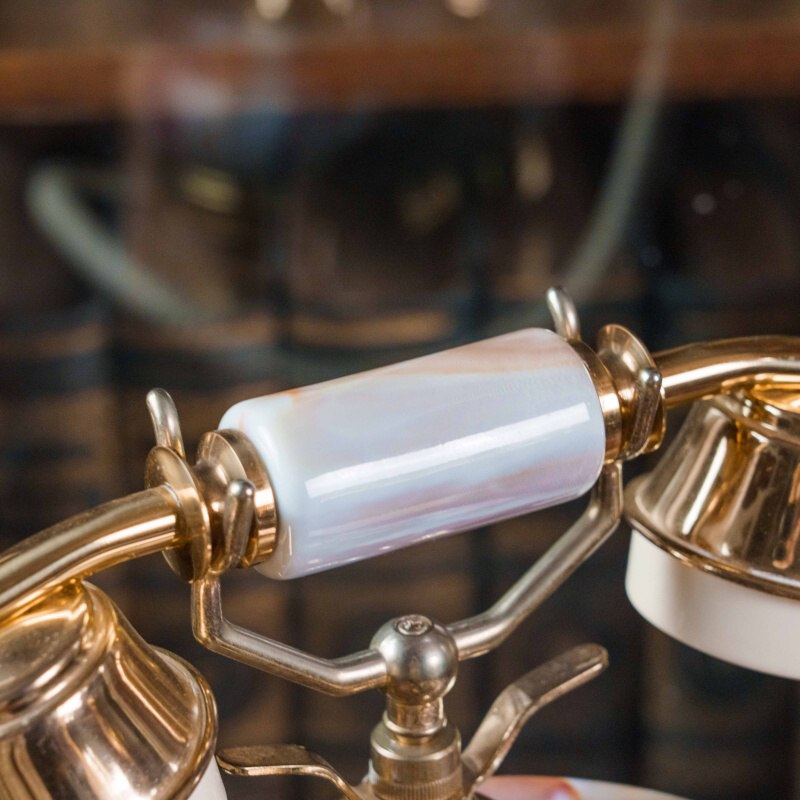Основание выполнено из оникса с естественным рисунком камня, а декоративные элементы — из полированной латуни, придающей предмету торжественный, благородный облик. На корпусе расположен имитационный дисковый набор с клавишами в винтажном оформлении. Трубка украшена вставками из перламутра и металлическими элементами в золотистом тоне, гармонично перекликающимися с корпусом.