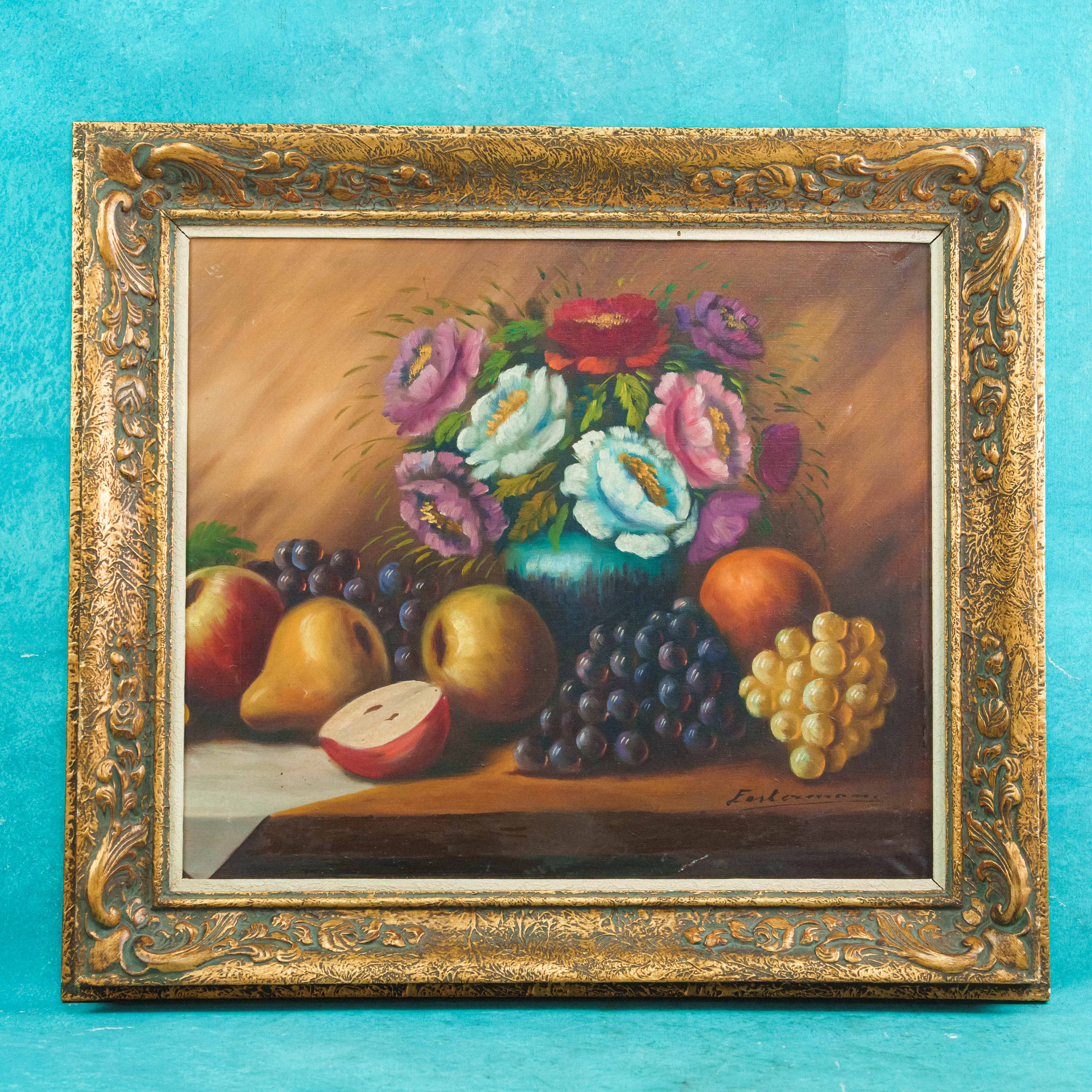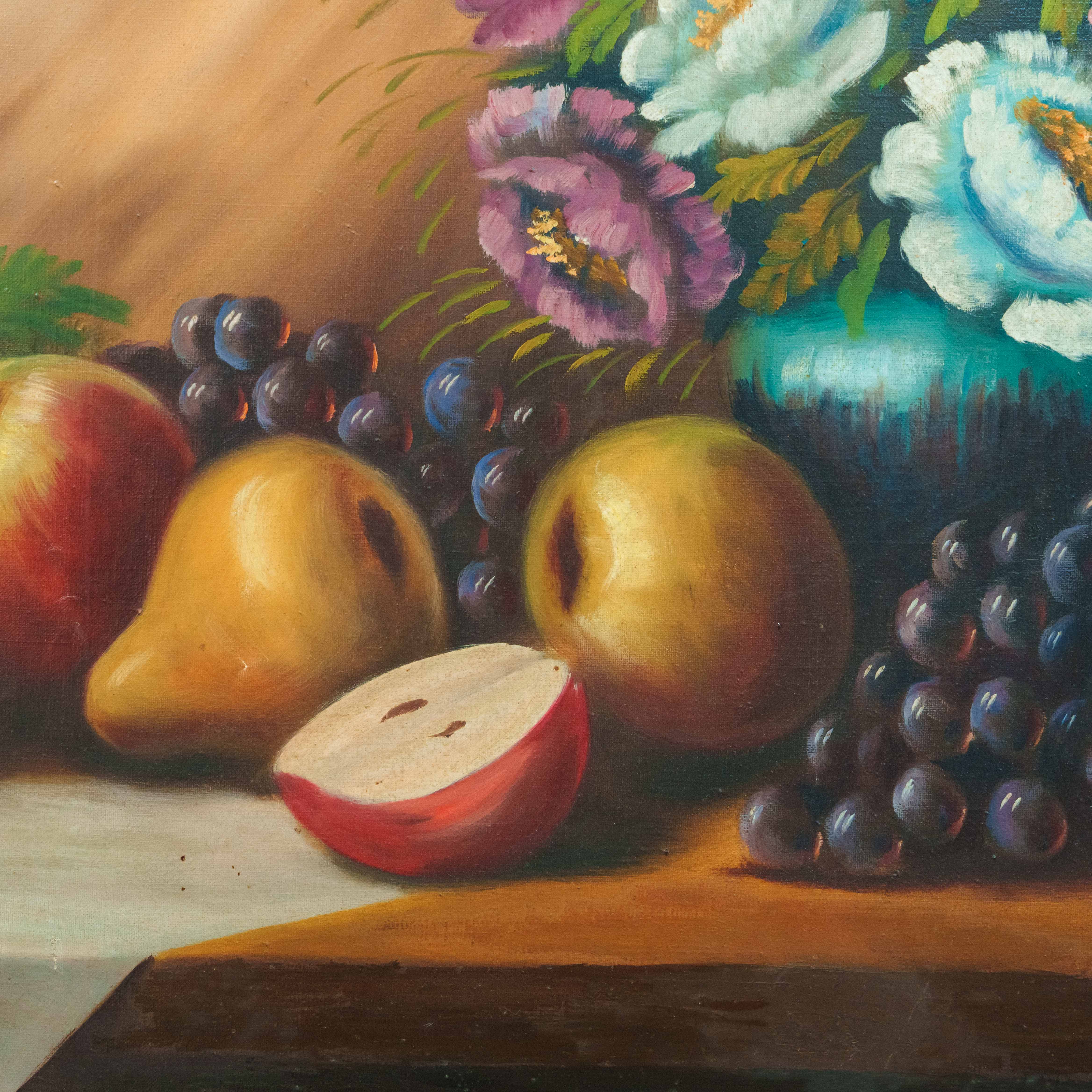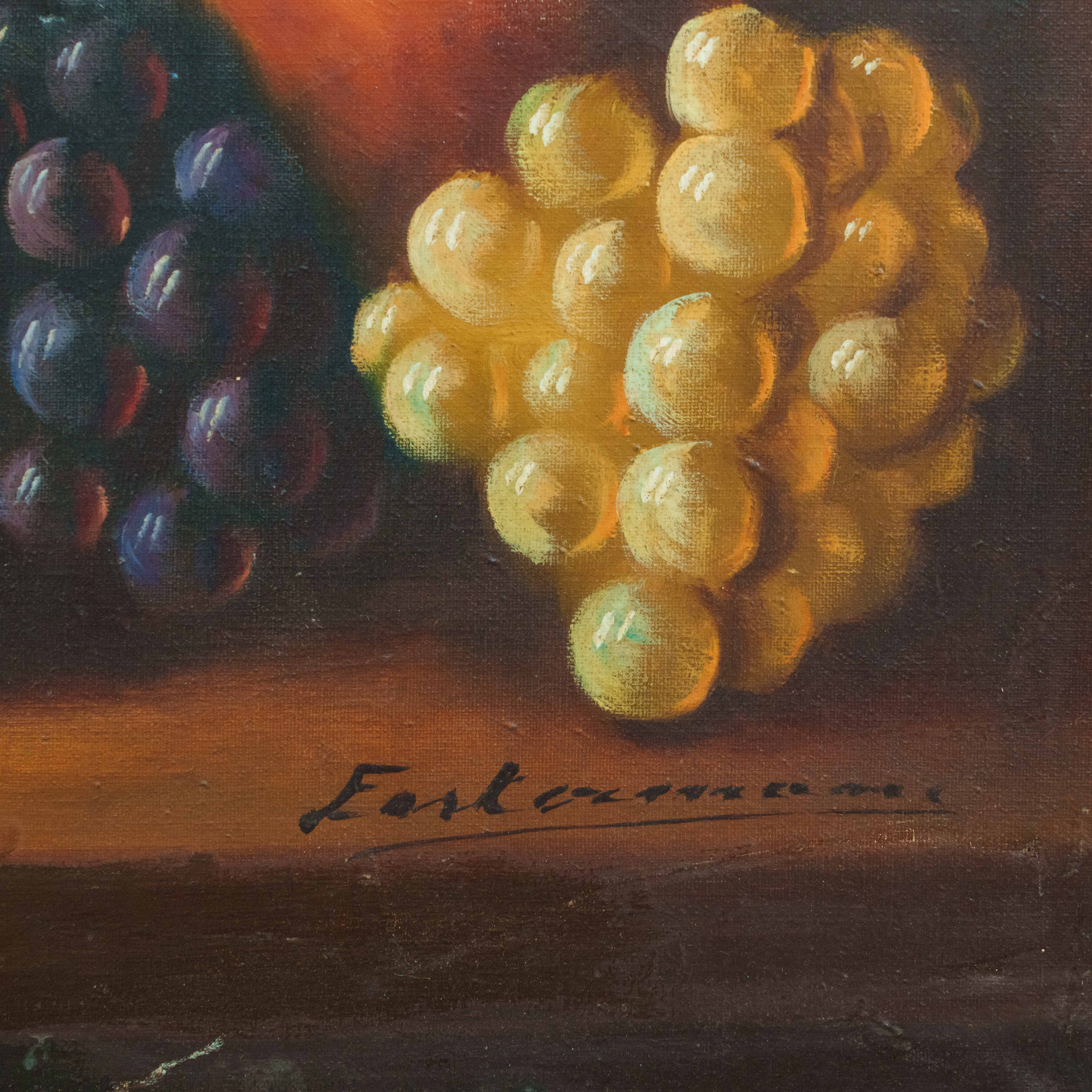 Художник мастерски передаёт фактуру плодов, игру света и мягкие цветовые переходы, благодаря чему изображение выглядит объёмным и «живым». Тёплый фон усиливает глубину пространства, а декоративная рама подчёркивает салонный, интерьерный характер работы.