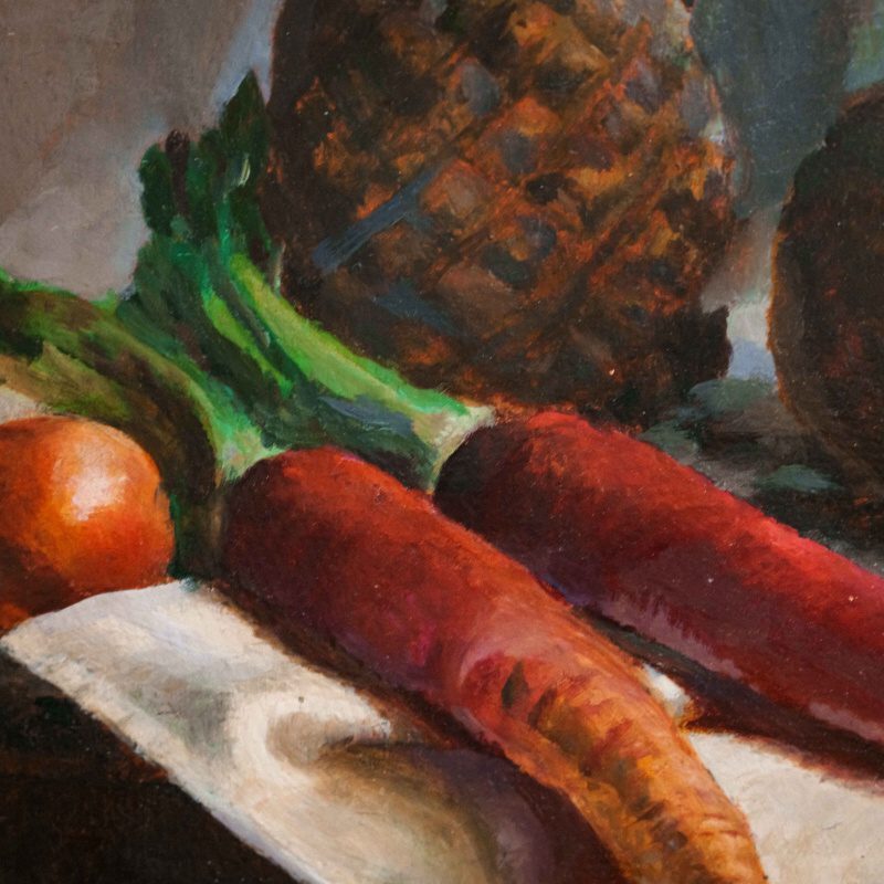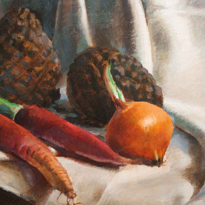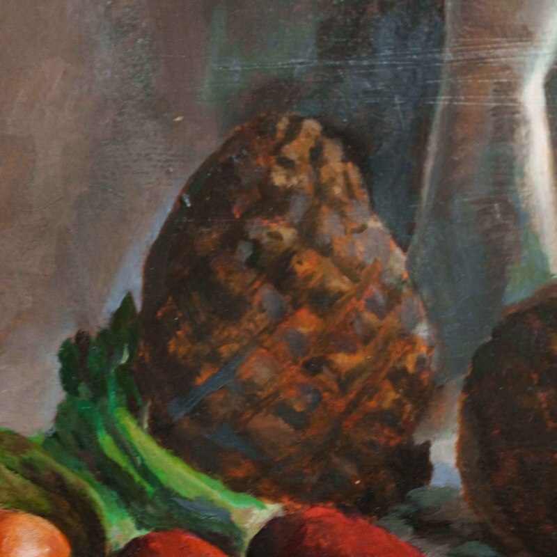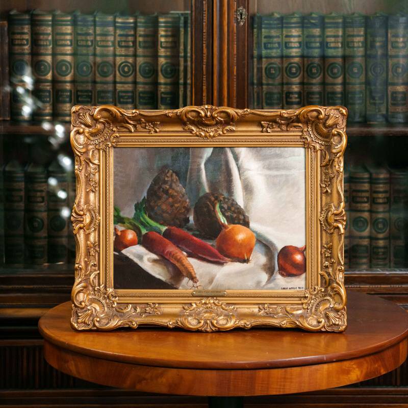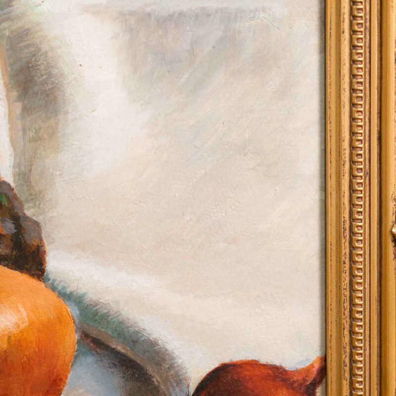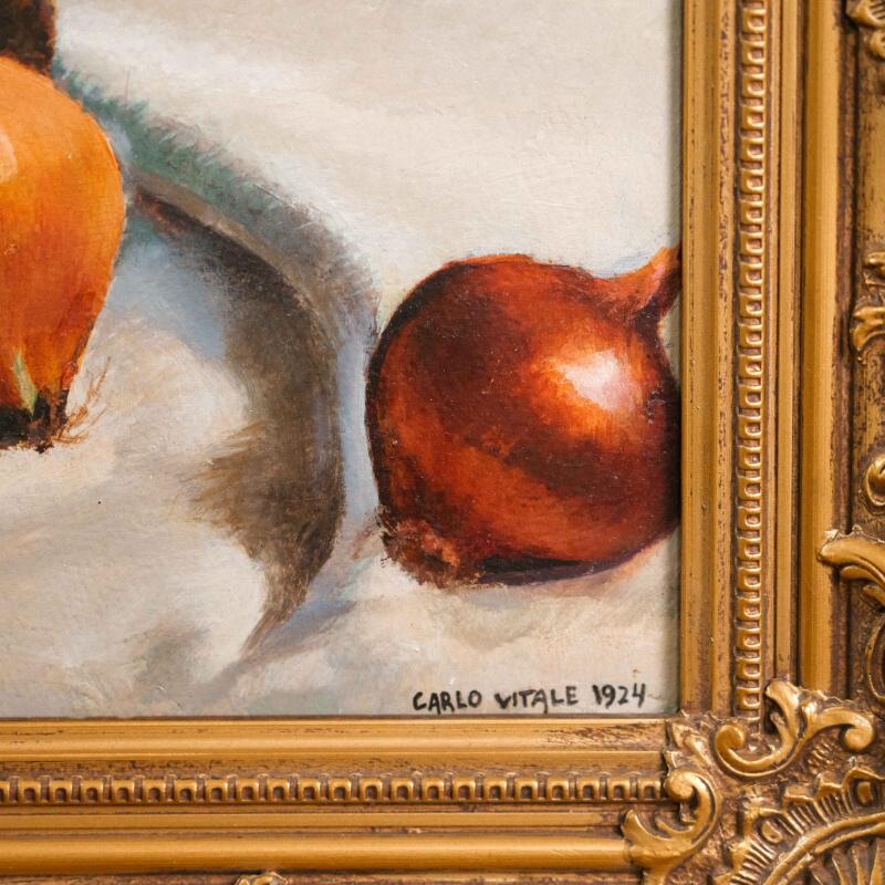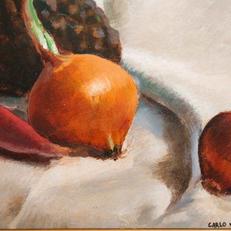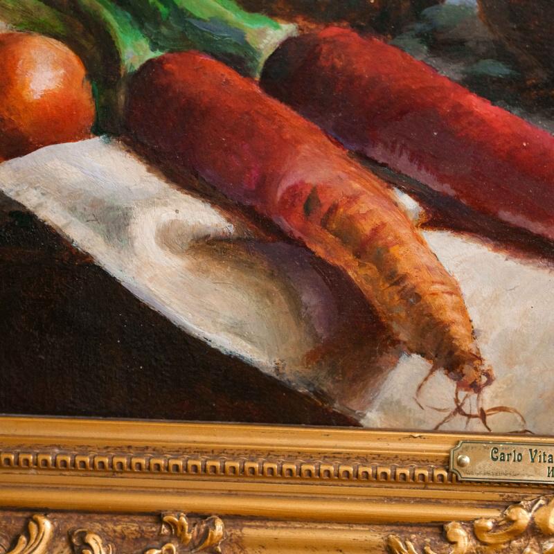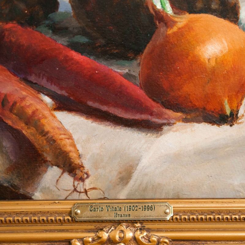 Представлена картина известного итальянского художника Carlo Vitale с условным названием «Натюрморт на столе». Авторская подпись, подтверждающая подлинность произведения, находится в правом нижнем углу картины.