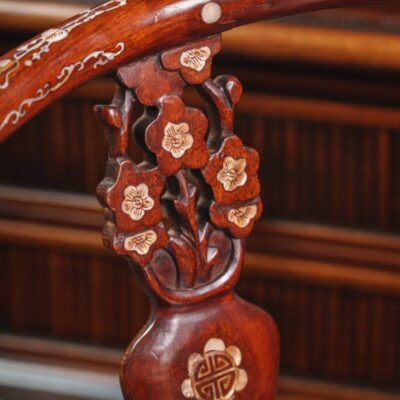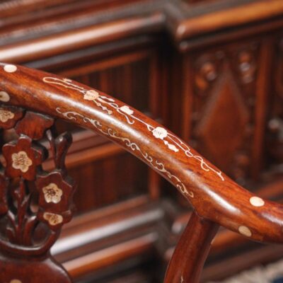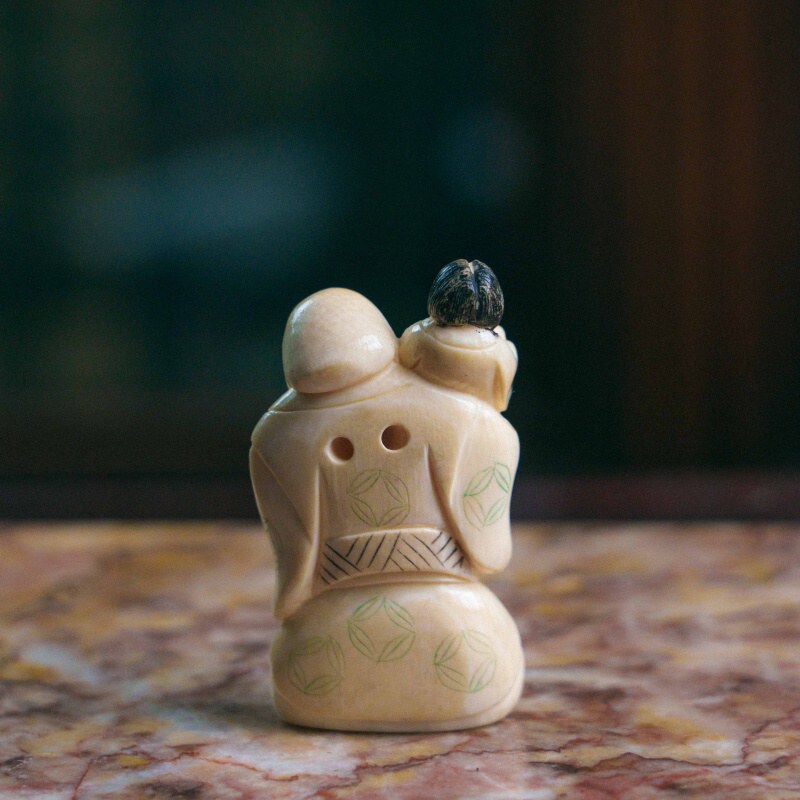 Резная фигура нэцкэ изображает сидящего бородатого мужчину, Актера в традиционной одежде, который несет на плече куклу, похожую на ребенка. У мужчины есть борода и усы, а на голове — головной убор. На одежде видны узоры.