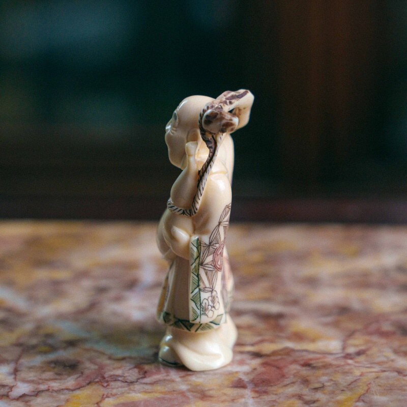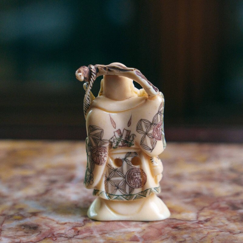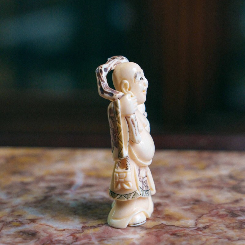 Нэцкэ Хотей, также известный как «Смеющийся Будда» или «Будда Изобилия», является одним из семи почитаемых божеств счастья в японской мифологии и богом счастья, богатства и благополучия. Считается, что Хотей, вечно довольный и беззаботный, избавляет от грусти, тоски, гнева и напряжения. Он также является символом богатства и процветания. Из его мешка святой извлекает блага, которых достоин каждый, кто следует предписаниям учения фэн-шуй. Также считается, что он способен исполнять заветные мечты. Хотей часто изображается как лысый, улыбающийся монах с большим животом, символизирующим великодушие и счастье. Один из самых популярных персонажей нэцкэ.