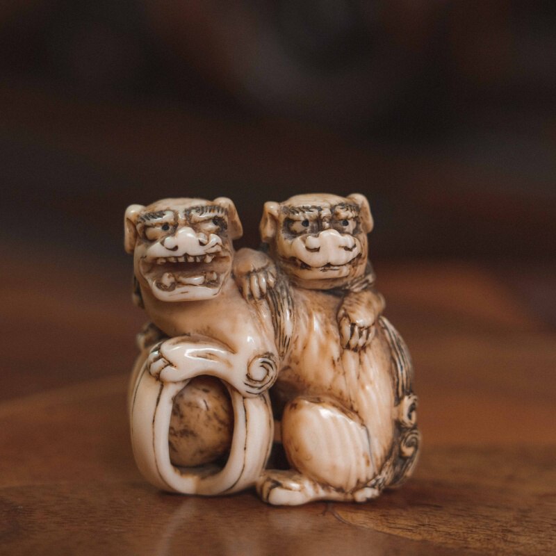 Выразительная композиция изображает пару шиши — мифических небесных львов Будды, традиционно считающихся мощными защитниками от злых духов и негативной энергии. В паре они символизируют гармонию, баланс и двойную силу защиты.