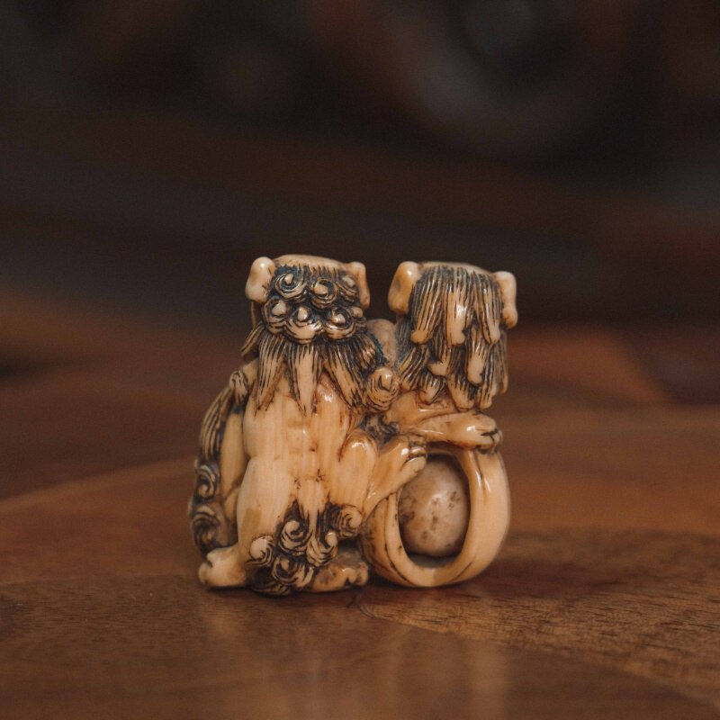 Резьба по слоновой кости выполнена с высоким мастерством — каждая деталь, от текстуры шерсти до изгибов тела, подчёркивает художественную ценность изделия.